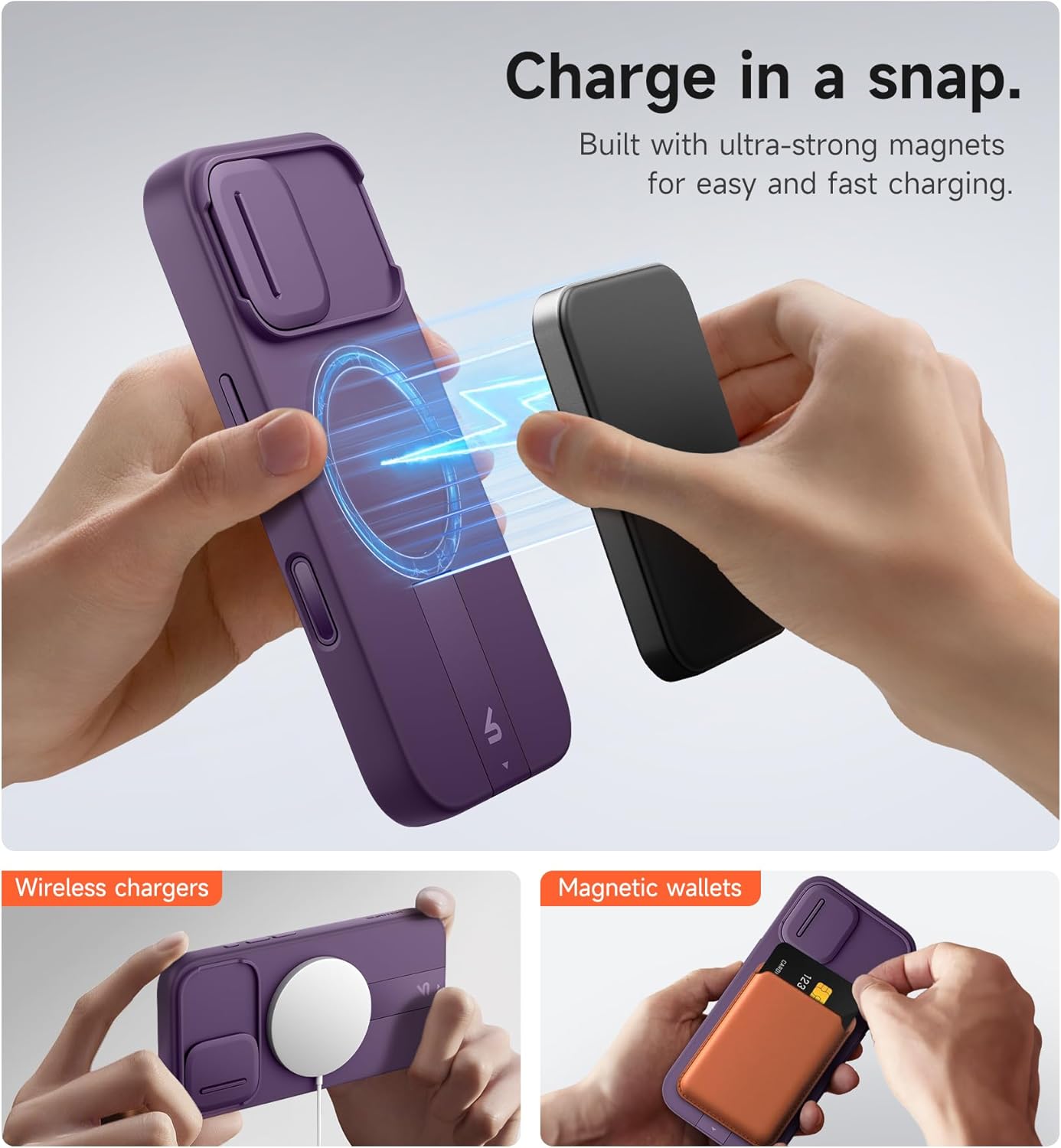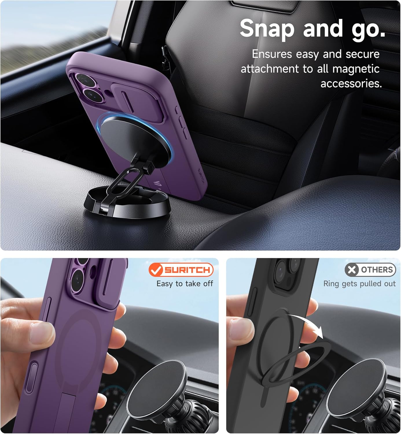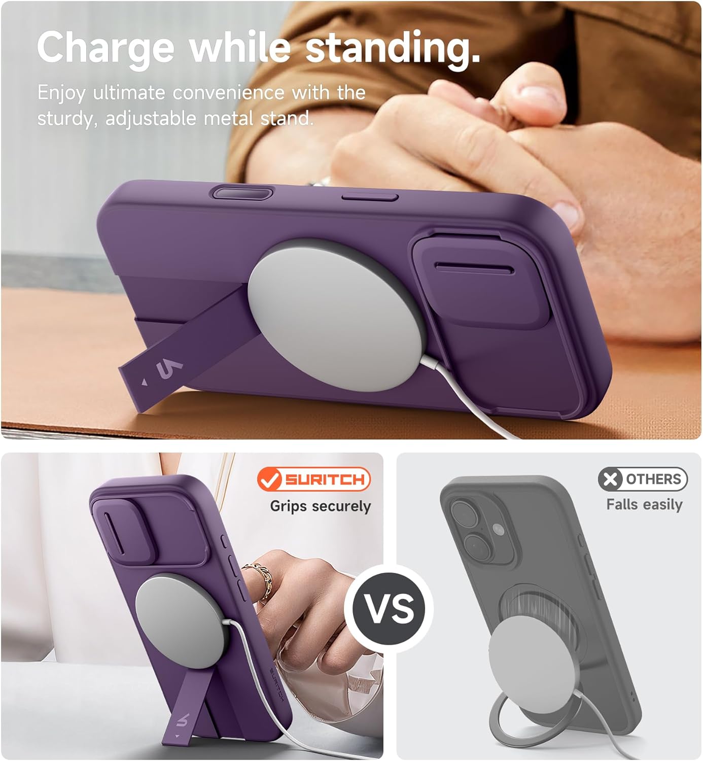 Магнитен калъф SURITCH, съвместим с iPhone 17, удароустойчив калъф за мобилен телефон, защитен калъф, устойчив на надраскване, с бутон за управление на камерата, плъзгащ се капак на камерата и регулируема стойка (лилав)