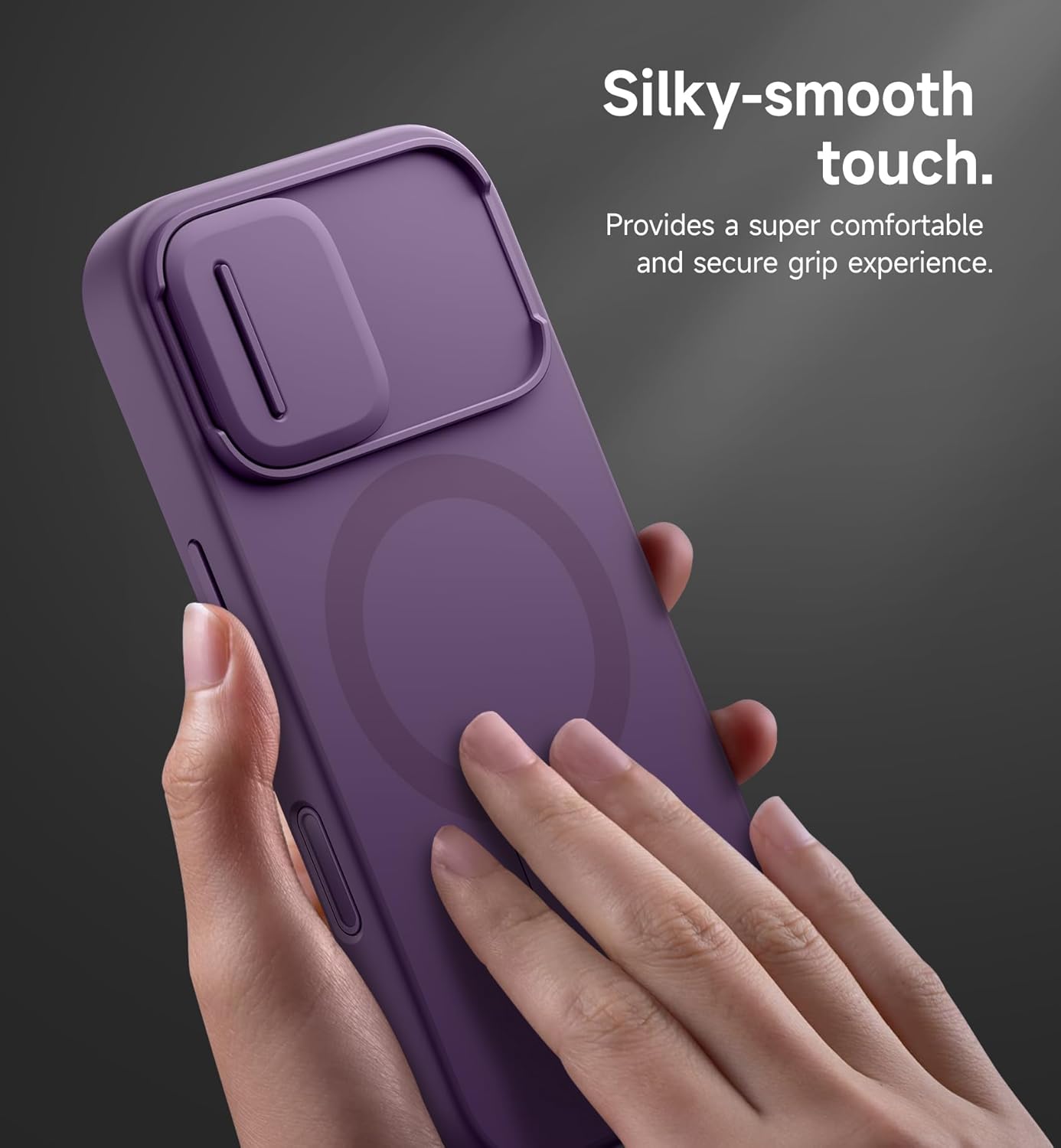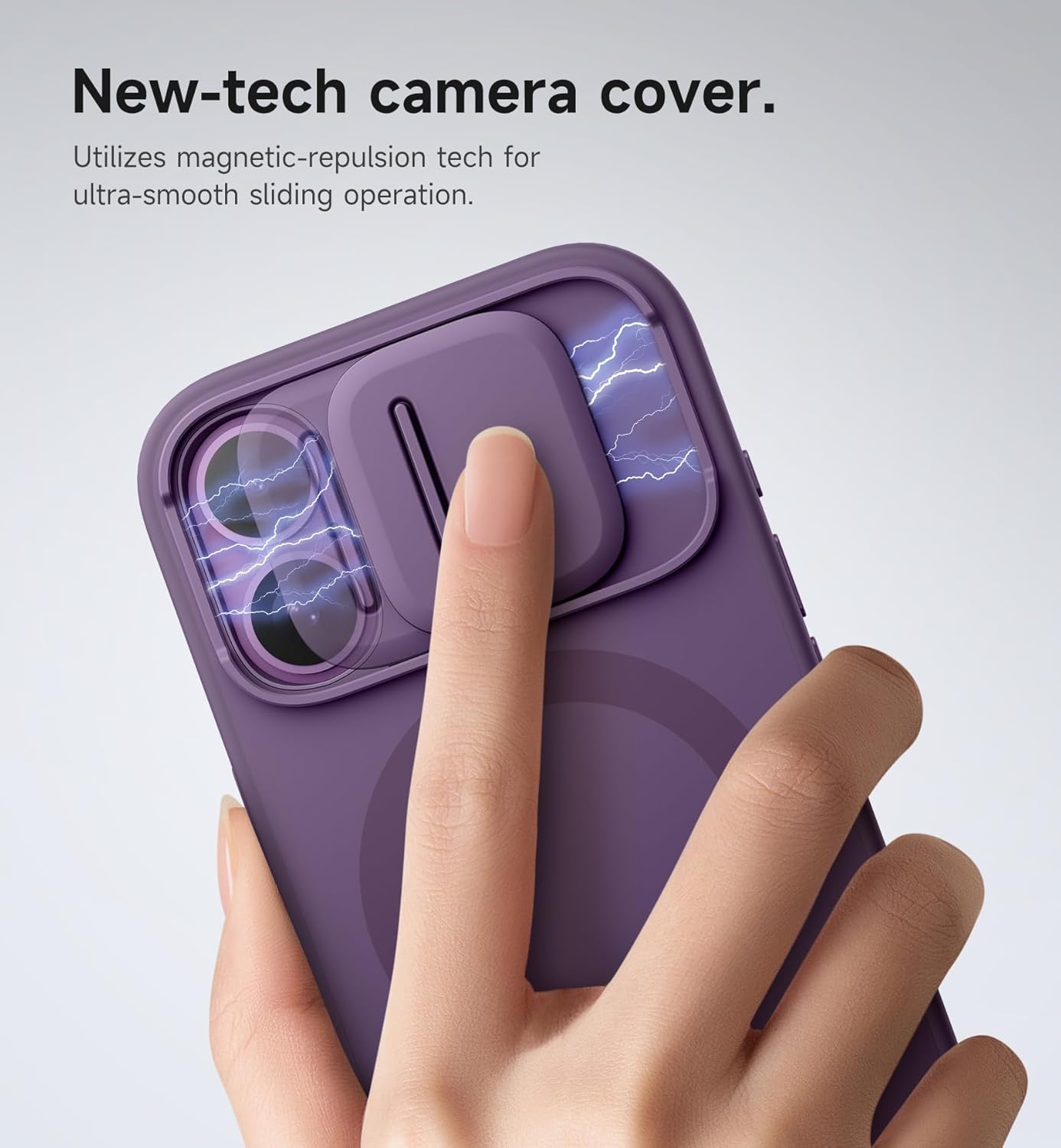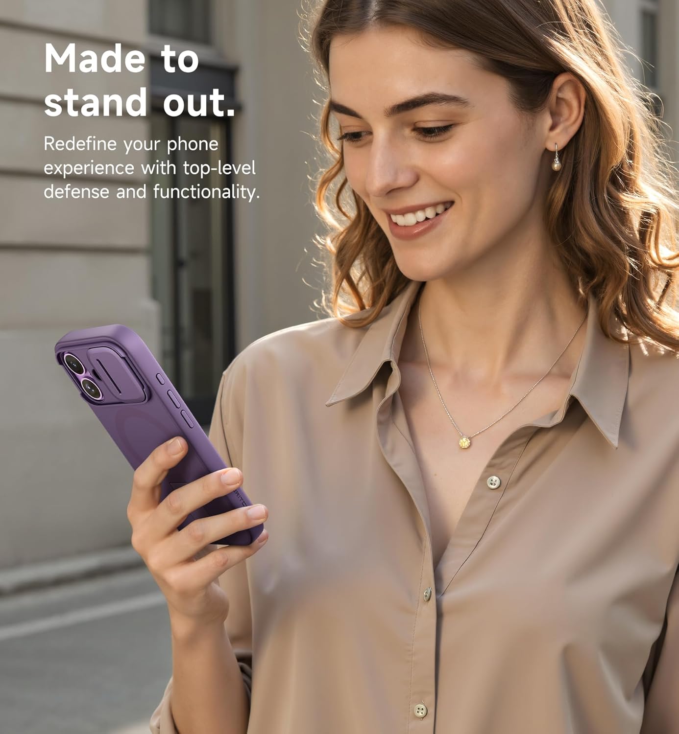 Магнитен калъф SURITCH, съвместим с iPhone 17, удароустойчив калъф за мобилен телефон, защитен калъф, устойчив на надраскване, с бутон за управление на камерата, плъзгащ се капак на камерата и регулируема стойка (лилав)