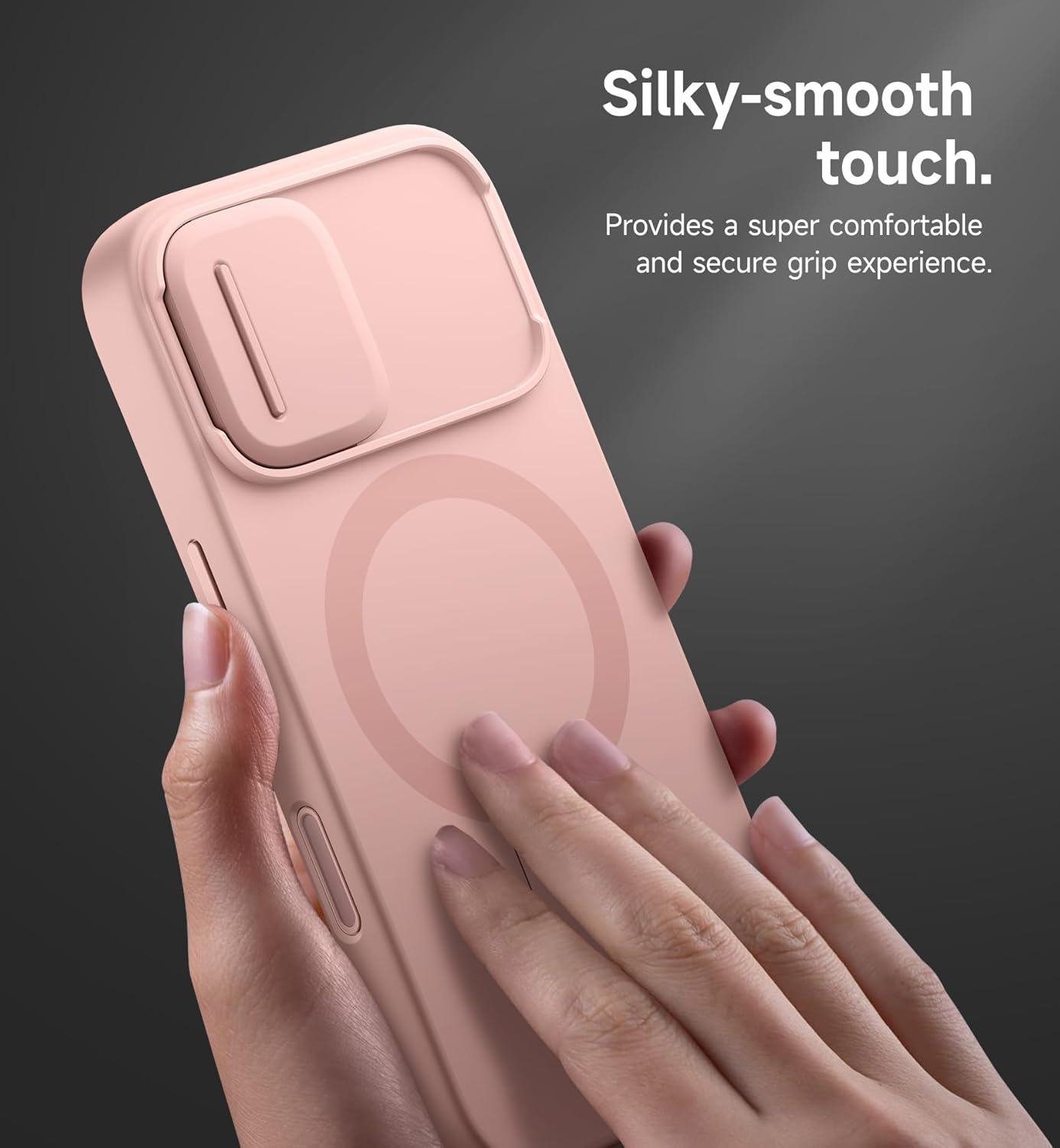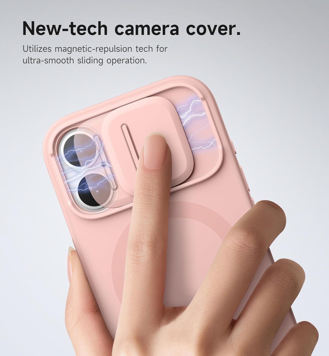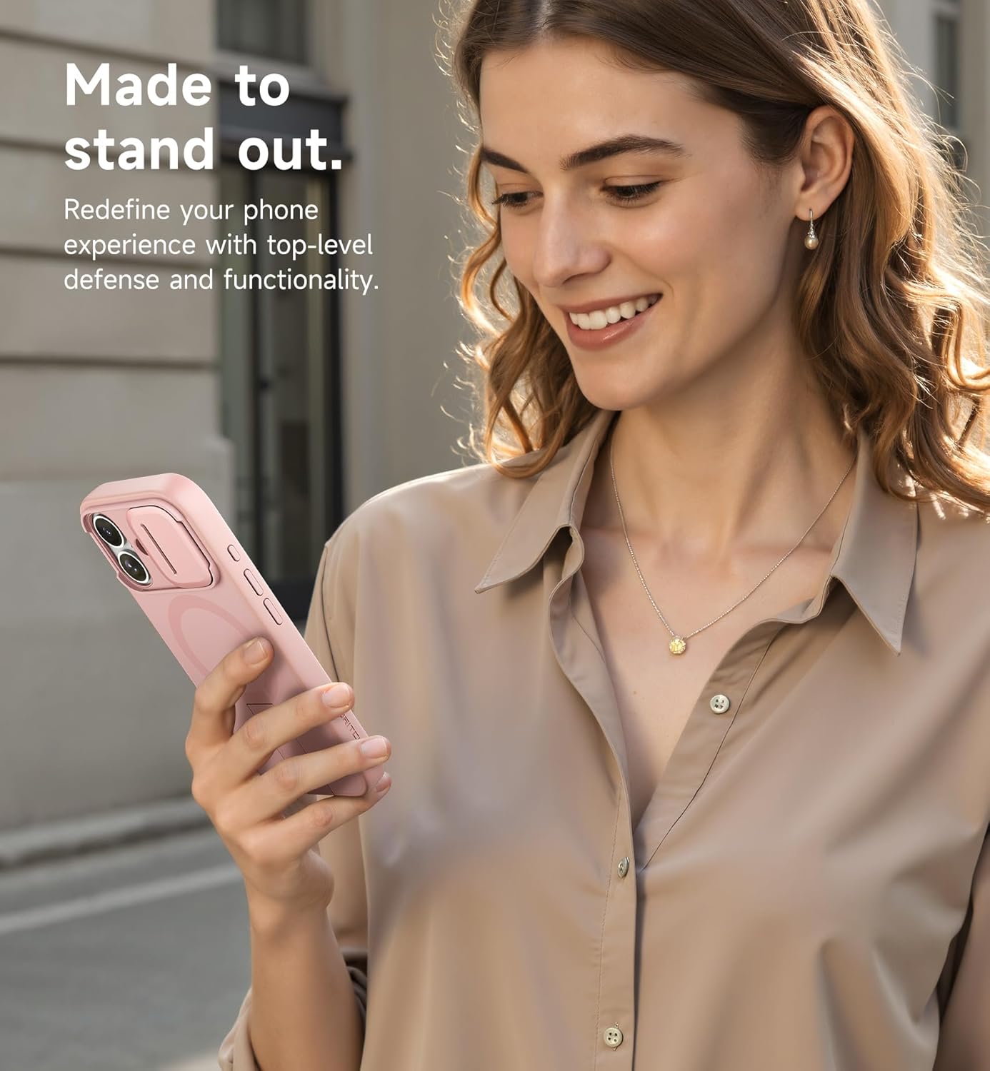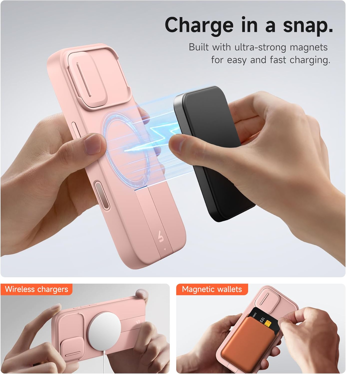 Магнитен калъф SURITCH, съвместим с iPhone 2025, удароустойчив калъф за мобилен телефон, защитен калъф, устойчив на надраскване, с бутон за управление на камерата и плъзгащ се капак на камерата и регулируема стойка (розов)