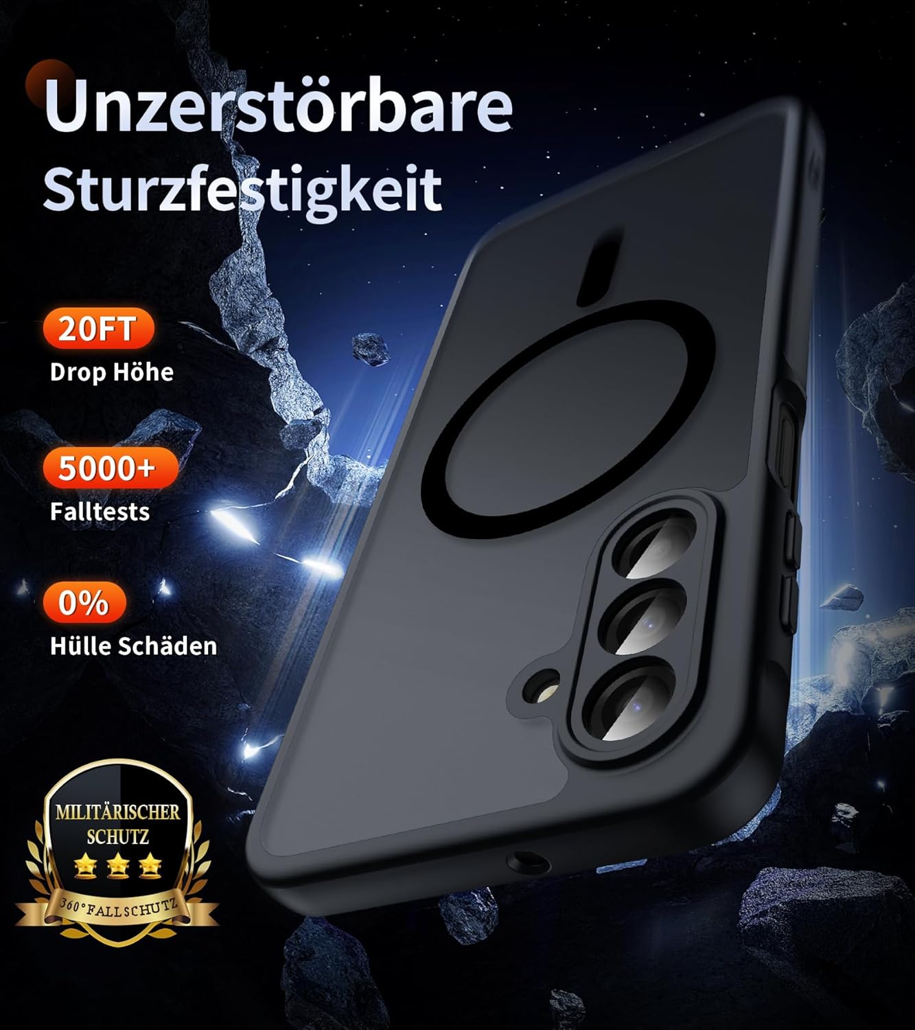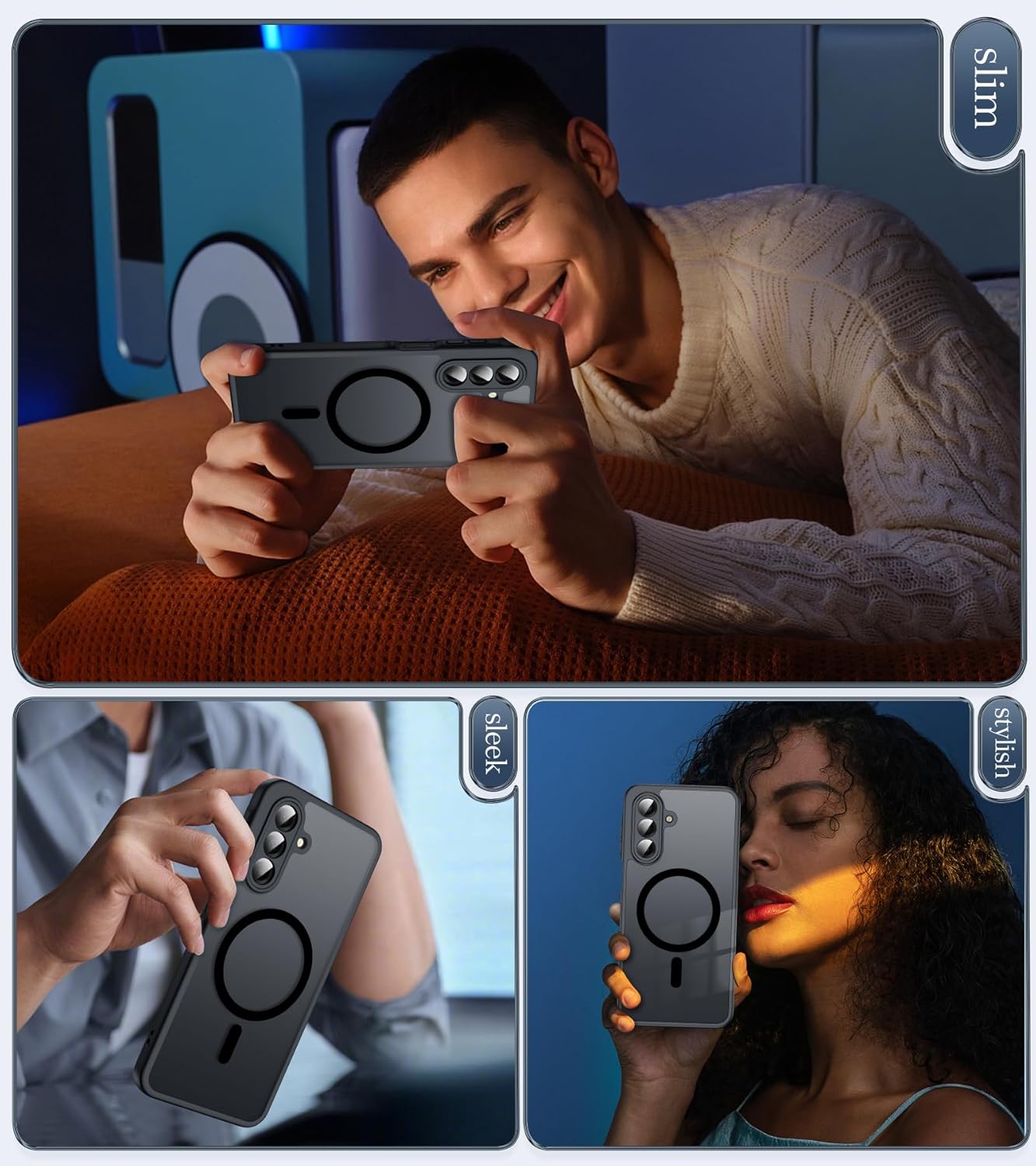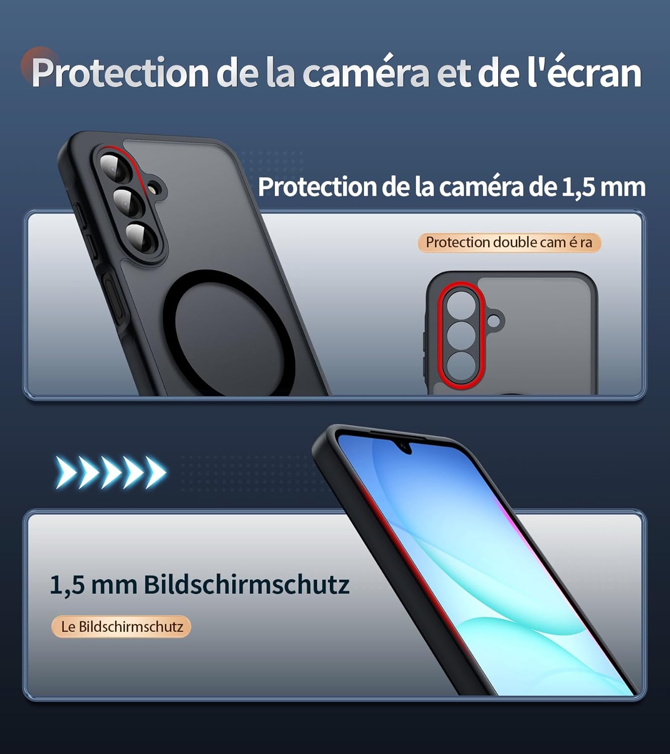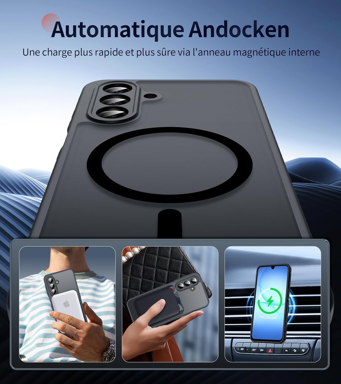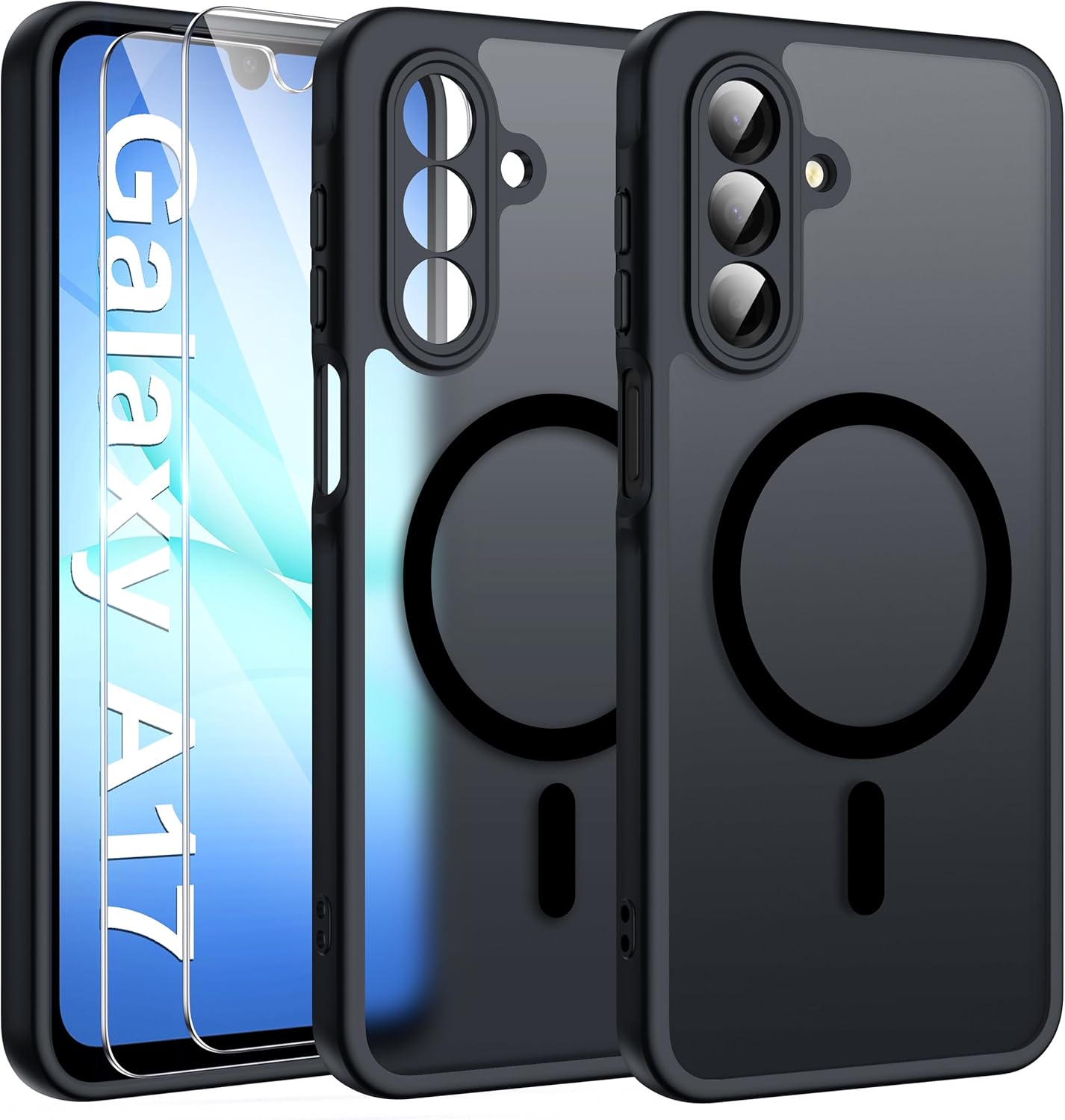 Магнитен калъф, съвместим с Samsung Galaxy A17 5G с 2 протектора за екрана, пълна защита на камерата за мобилен телефон, удароустойчив, устойчив на надраскване, матов, прозрачен защитен калъф, черен