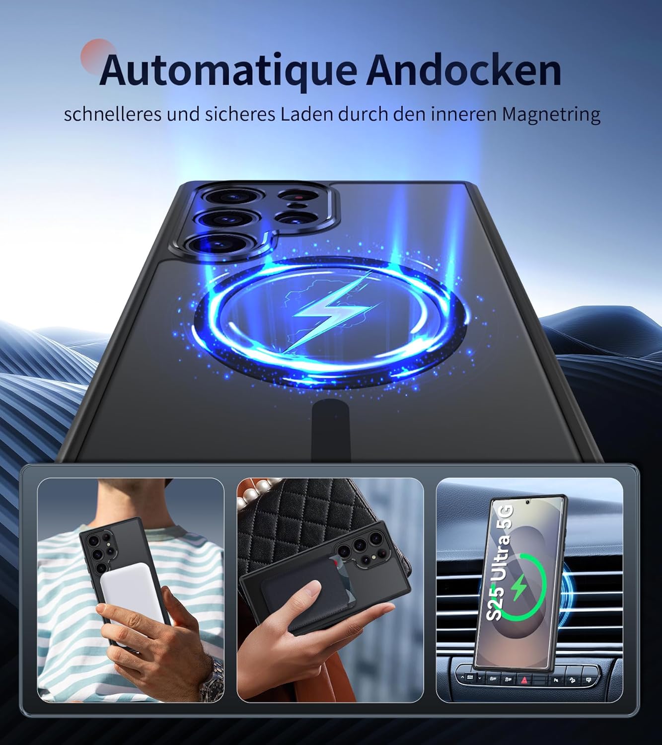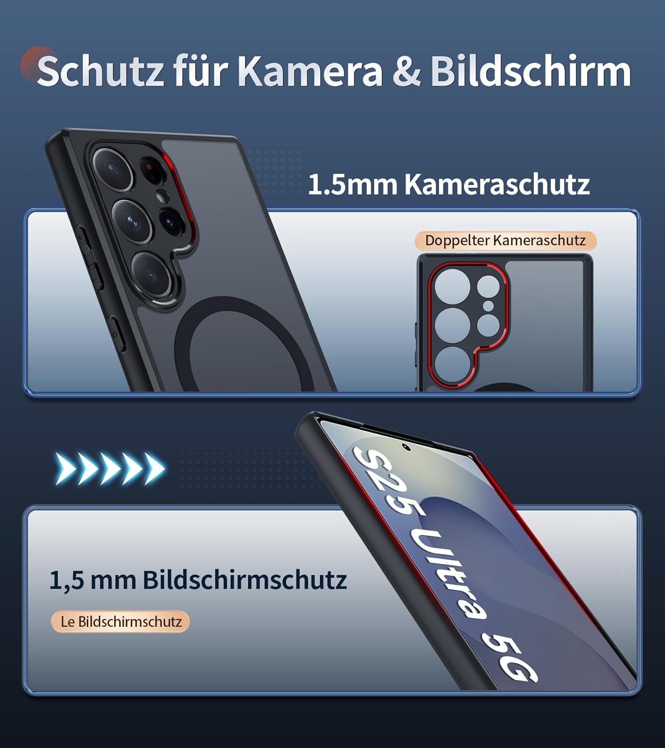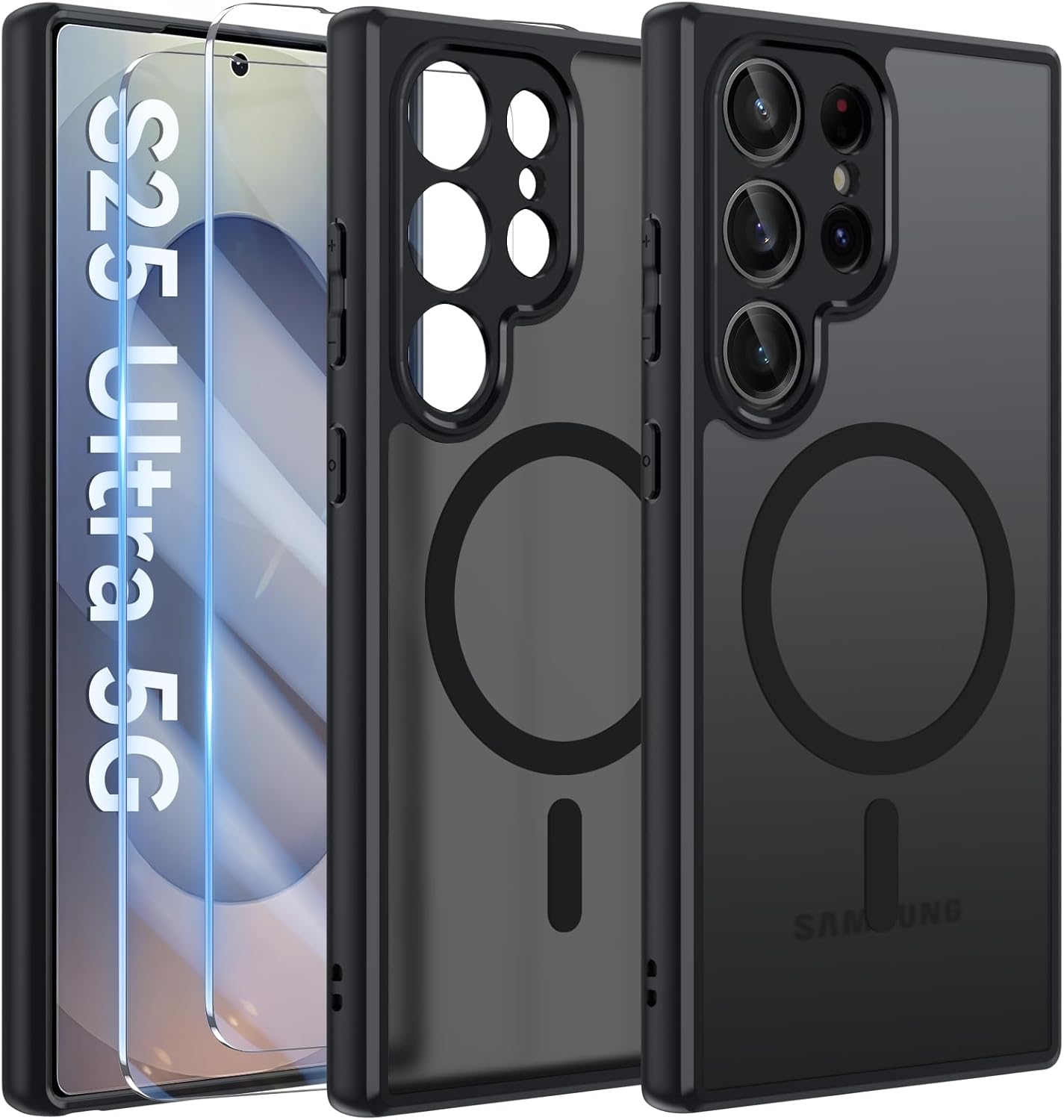 Магнитен калъф, съвместим с Samsung Galaxy S25 Ultra MagSafe с 2 протектора за екран, пълна защита на камерата, калъф за мобилен телефон за S25 Ultra, удароустойчив, тънък, прозрачен, матов, защитен