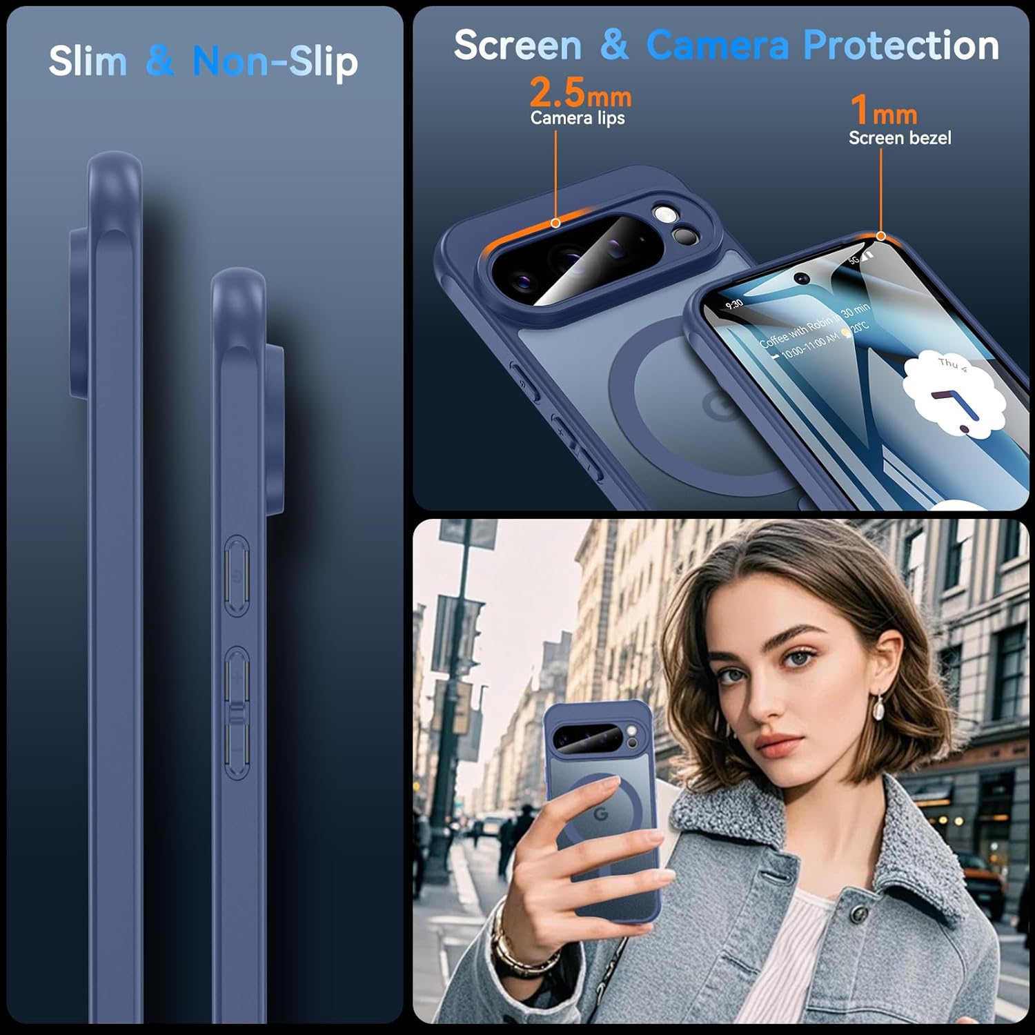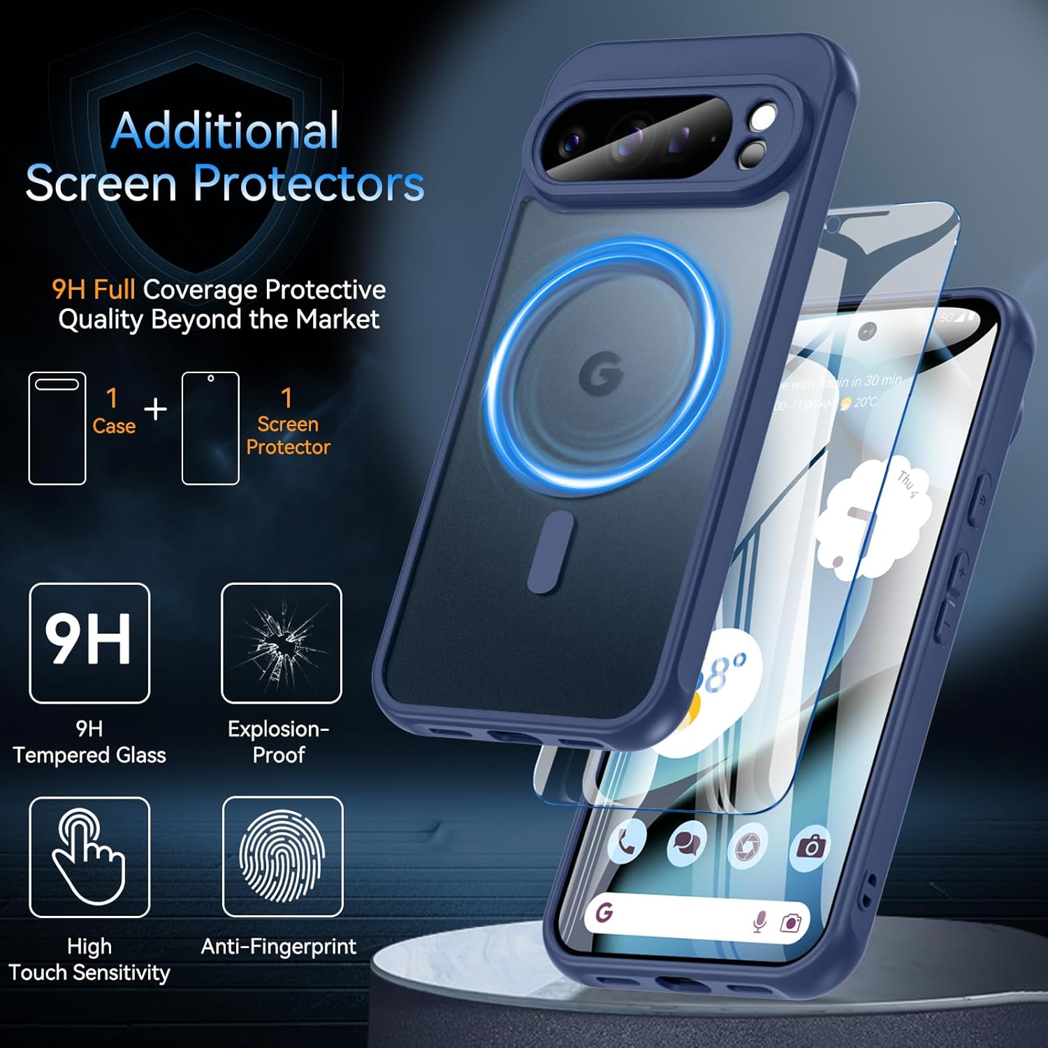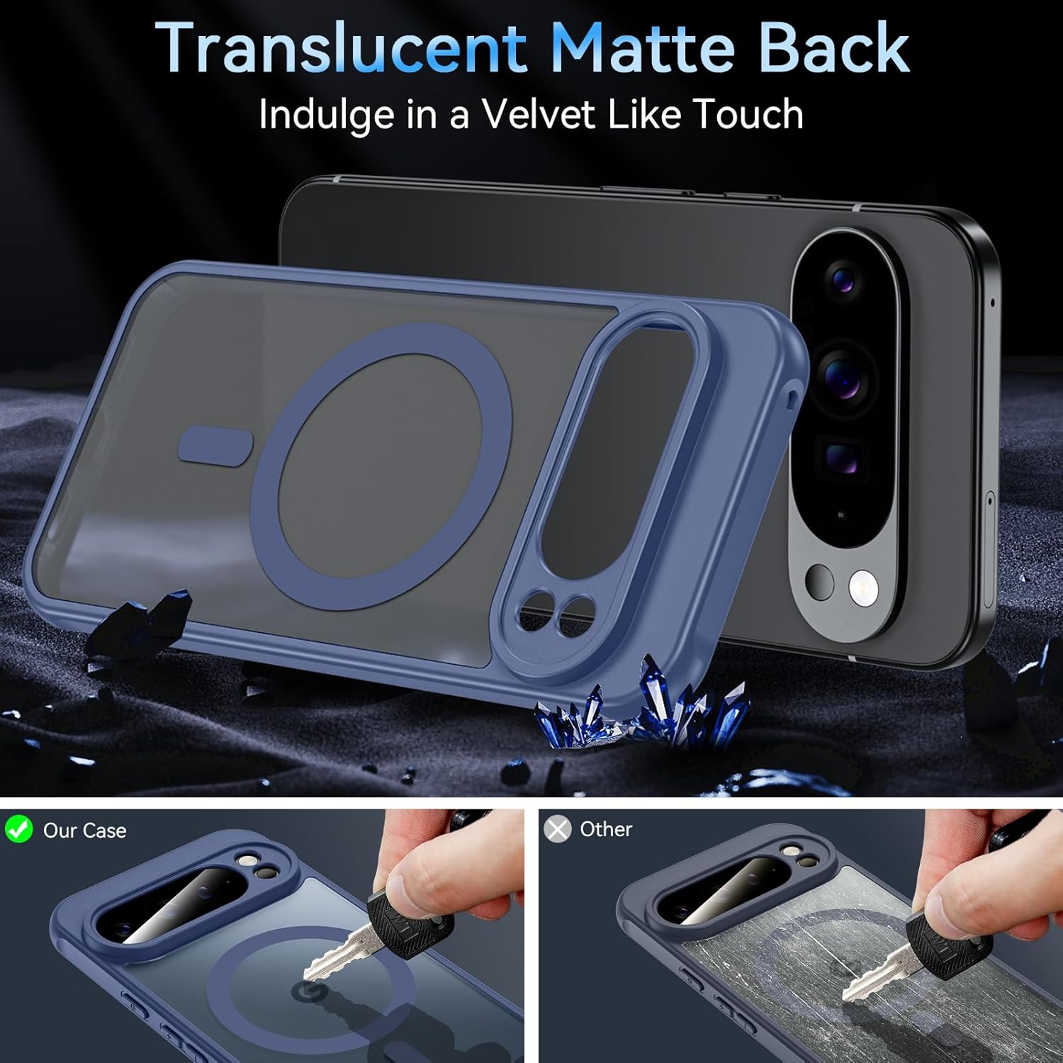 Магнитен калъф за Google Pixel 10 Pro XL със закалено стъкло, военна защита, калъф за мобилен телефон за Pixel 10 Pro XL, матов, прозрачен, здрав, защитен филм, защитен калъф (син)