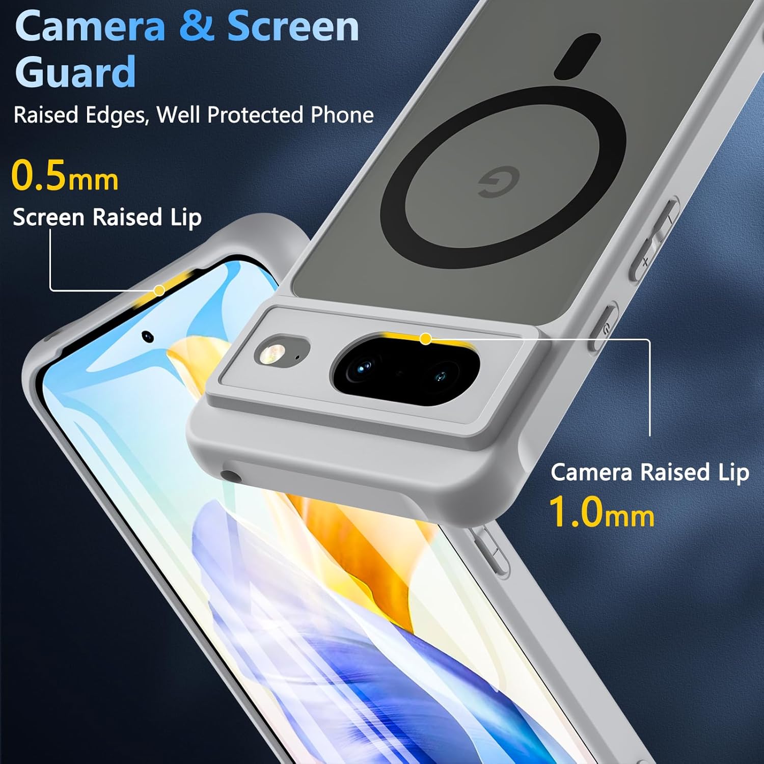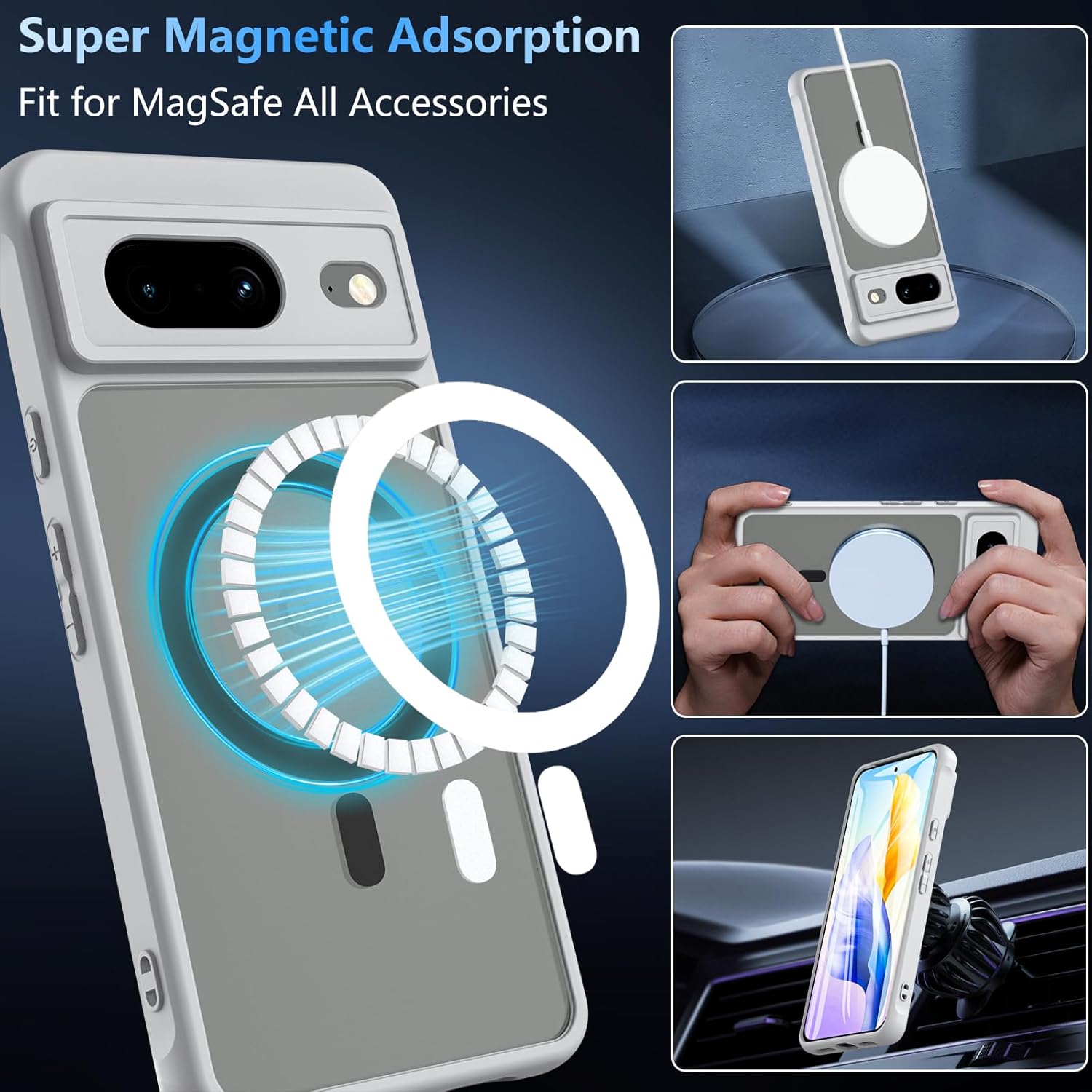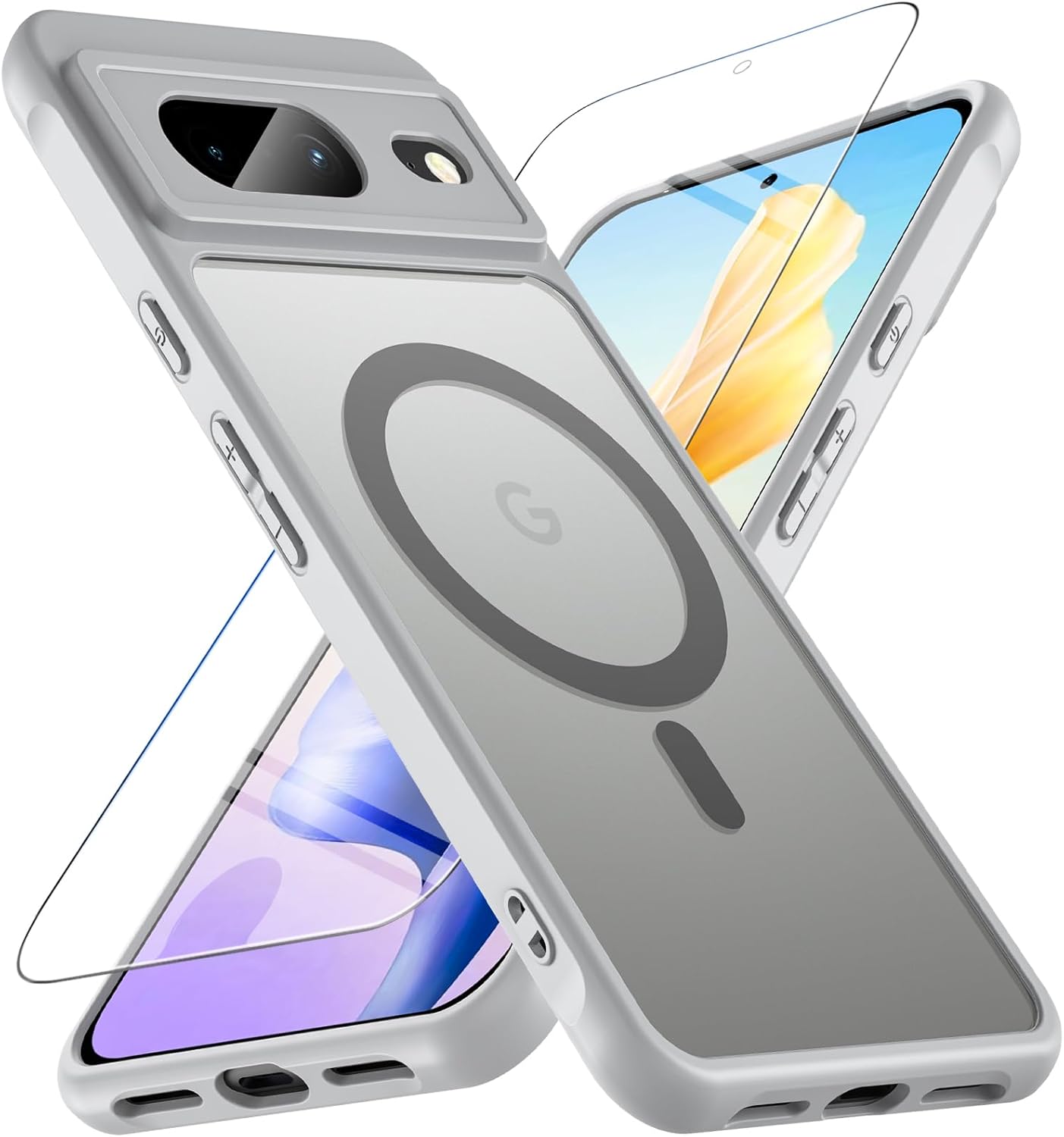 Магнитен калъф за Google Pixel 8, съвместим с Magsafe, защита от военни изисквания, закалено стъкло, матов прозрачен, удароустойчив, устойчив на надраскване, здрав защитен калъф за Pixel 8 5G (сив)