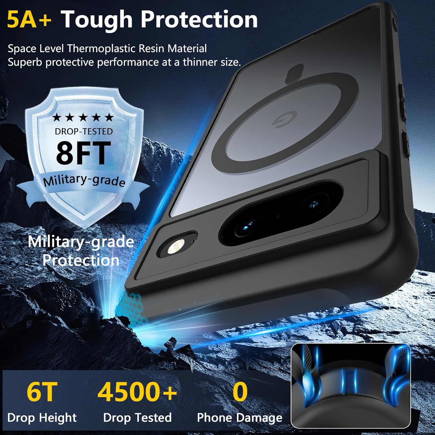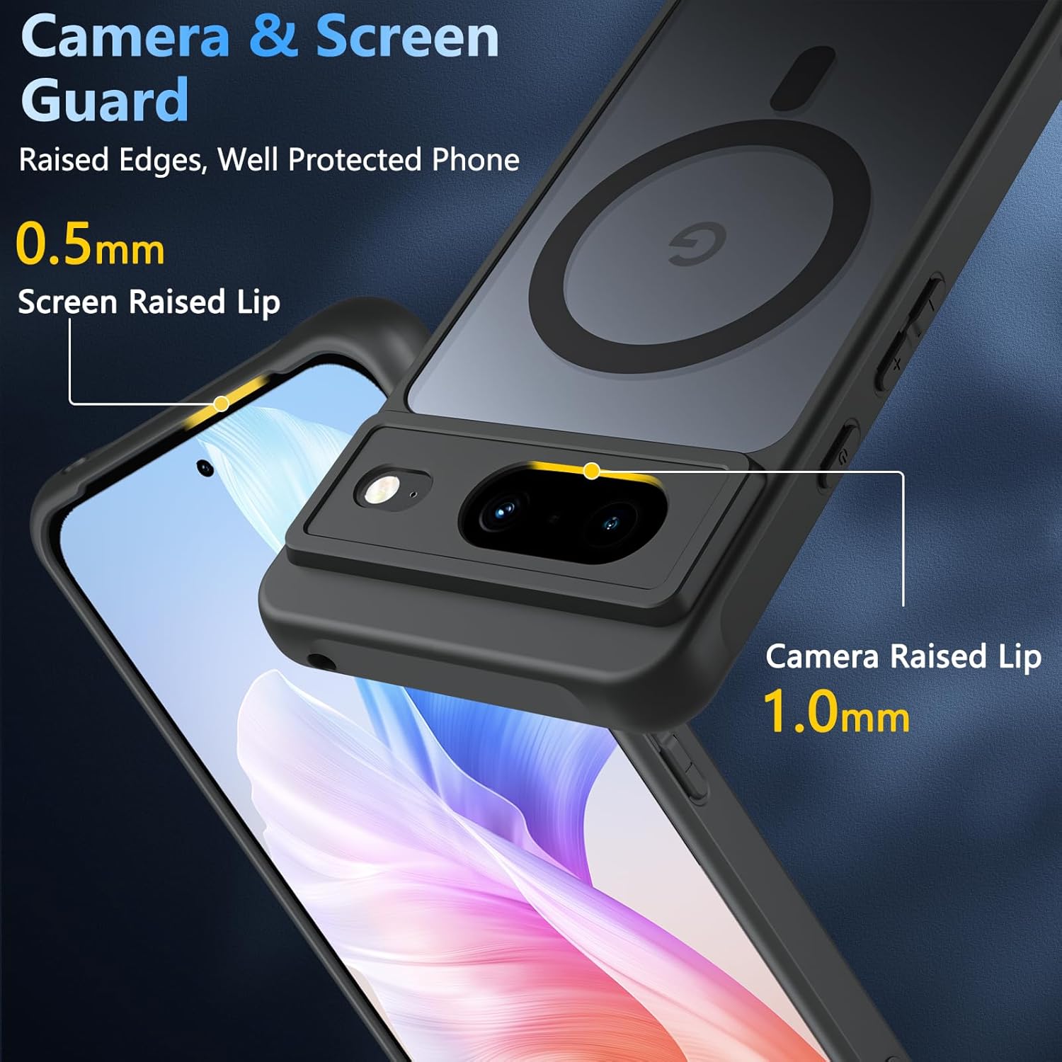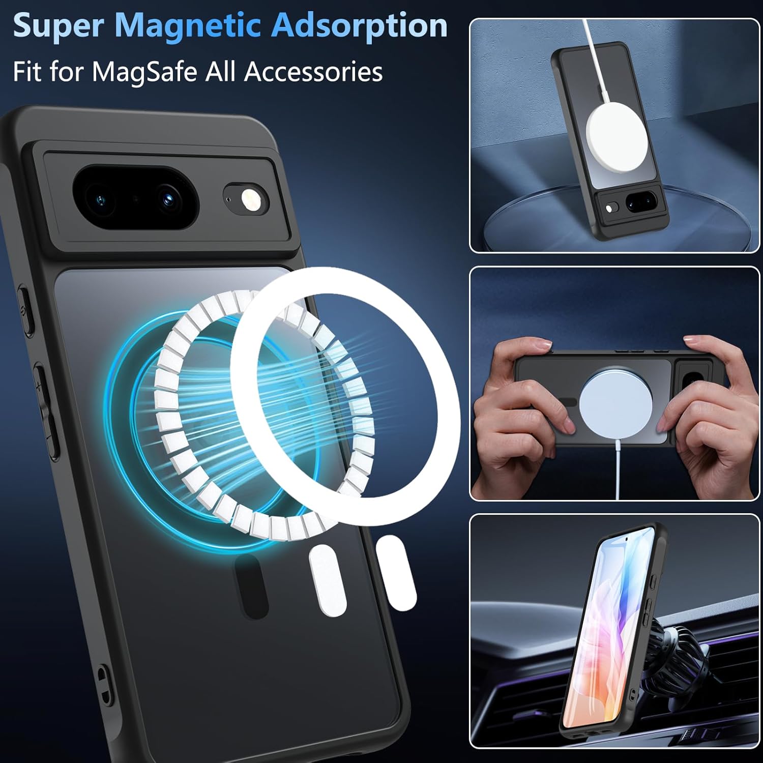 Магнитен калъф за Google Pixel 8, съвместим с Magsafe, защита от военни условия, закалено стъкло, матов прозрачен, удароустойчив, устойчив на надраскване, здрав защитен калъф за Pixel 8 5G 2023, черен
