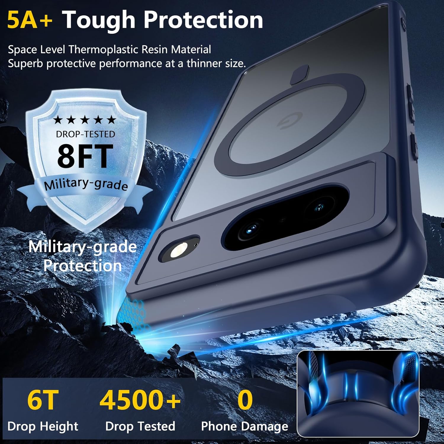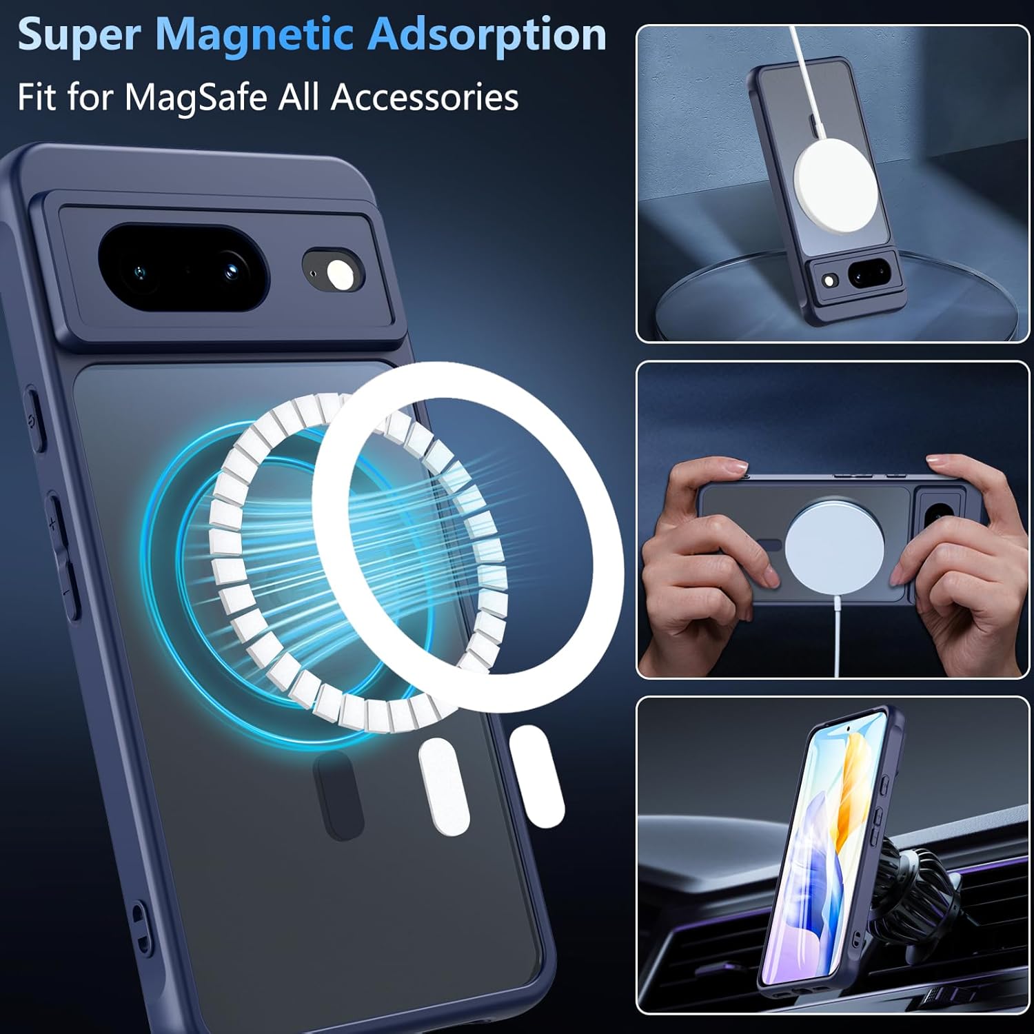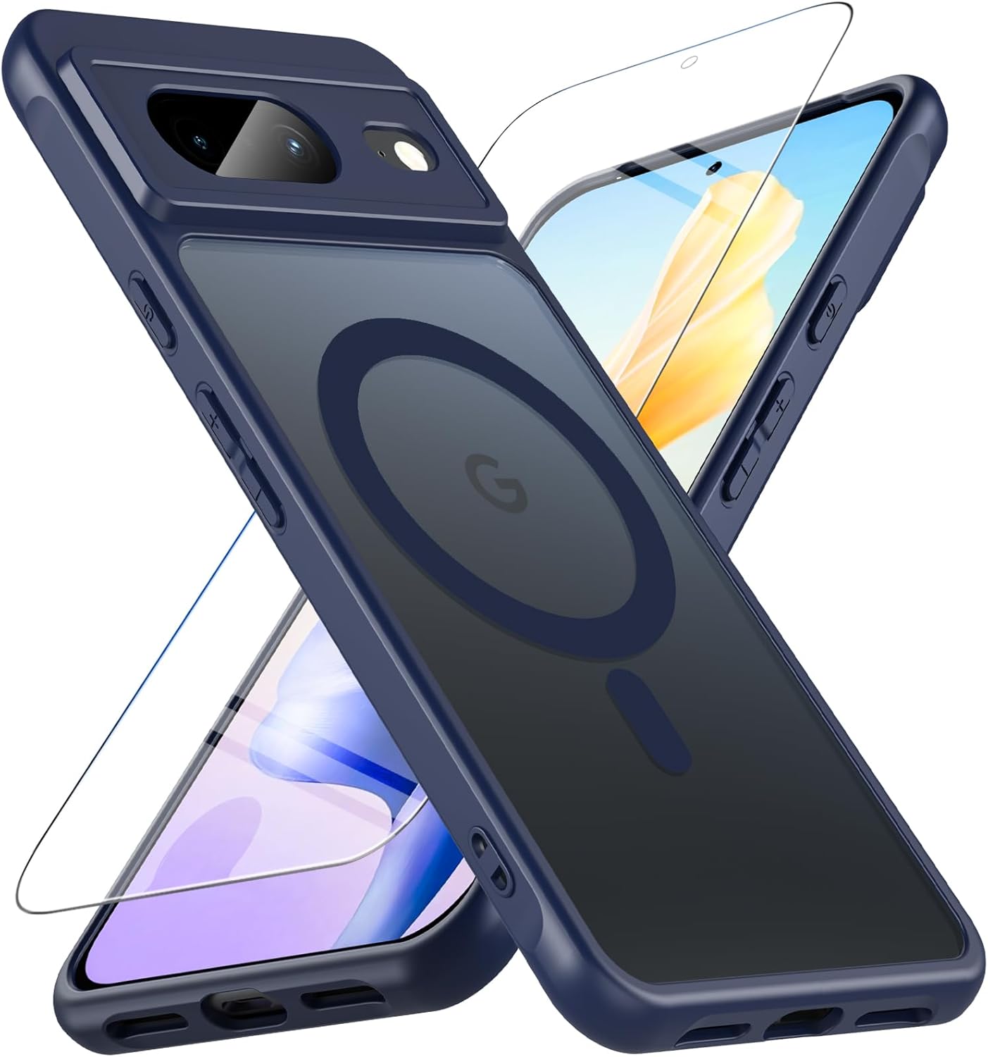 Магнитен калъф за Google Pixel 8, съвместим с Magsafe, защита от военни условия, закалено стъкло, матов прозрачен, удароустойчив, устойчив на надраскване, здрав защитен калъф за Pixel 8 5G (тъмносин)