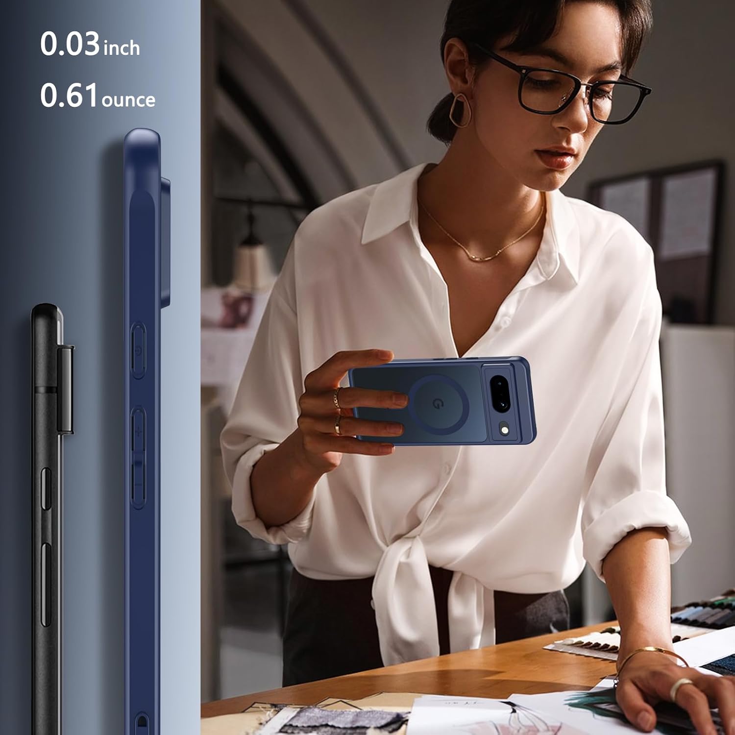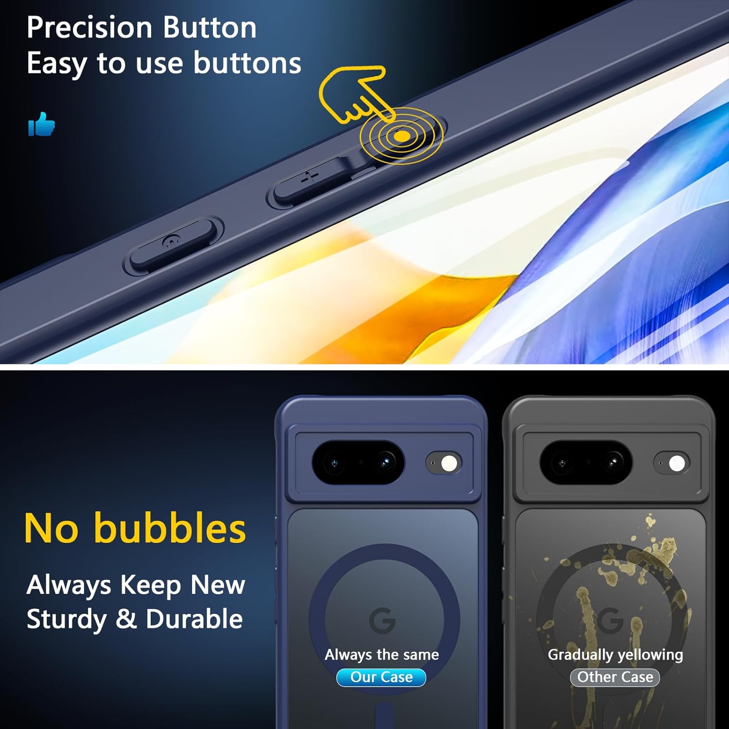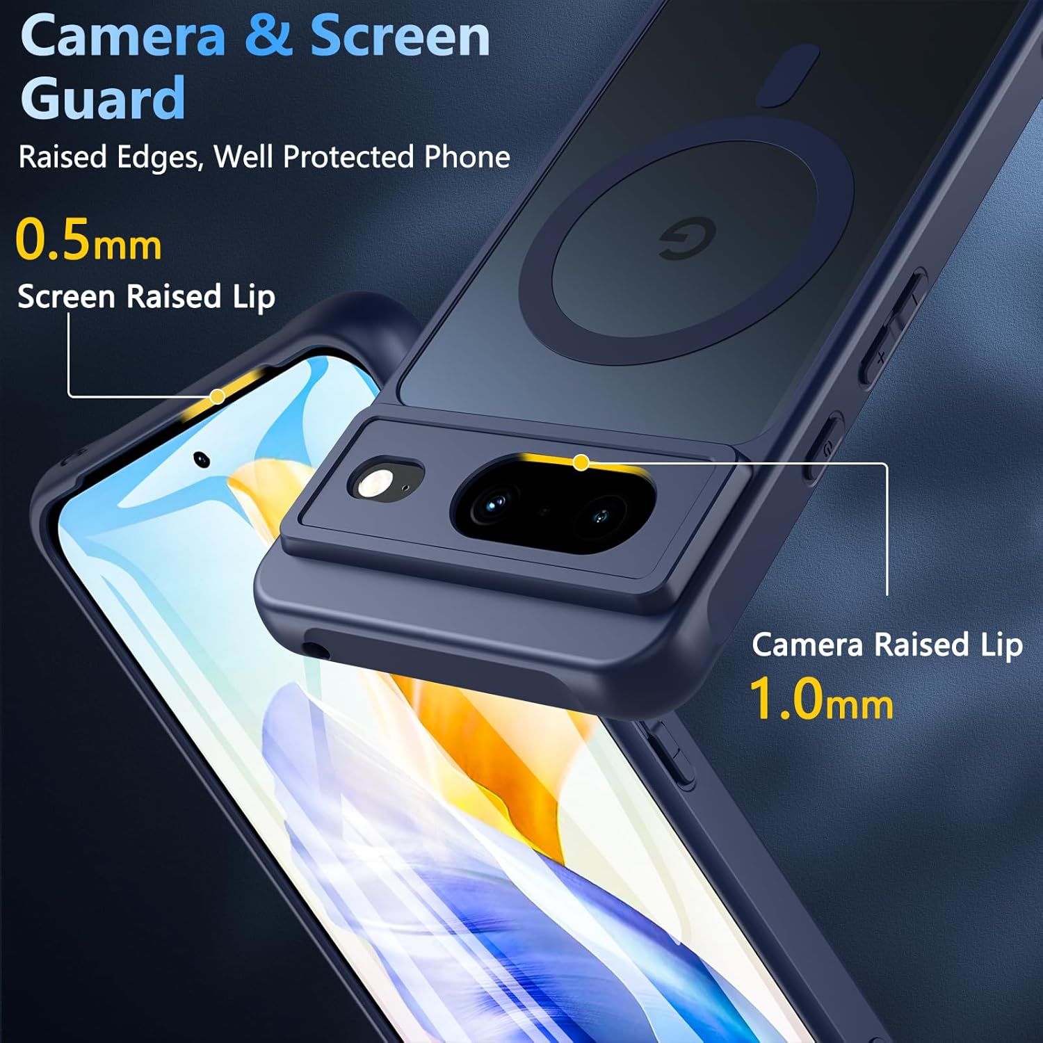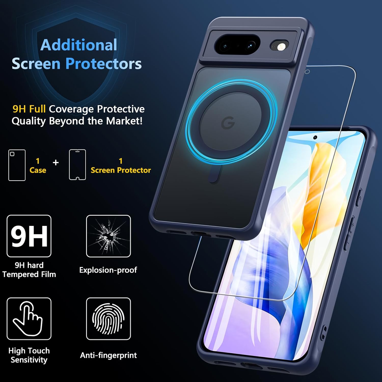 Магнитен калъф за Google Pixel 8, съвместим с Magsafe, защита от военни условия, закалено стъкло, матов прозрачен, удароустойчив, устойчив на надраскване, здрав защитен калъф за Pixel 8 5G (тъмносин)