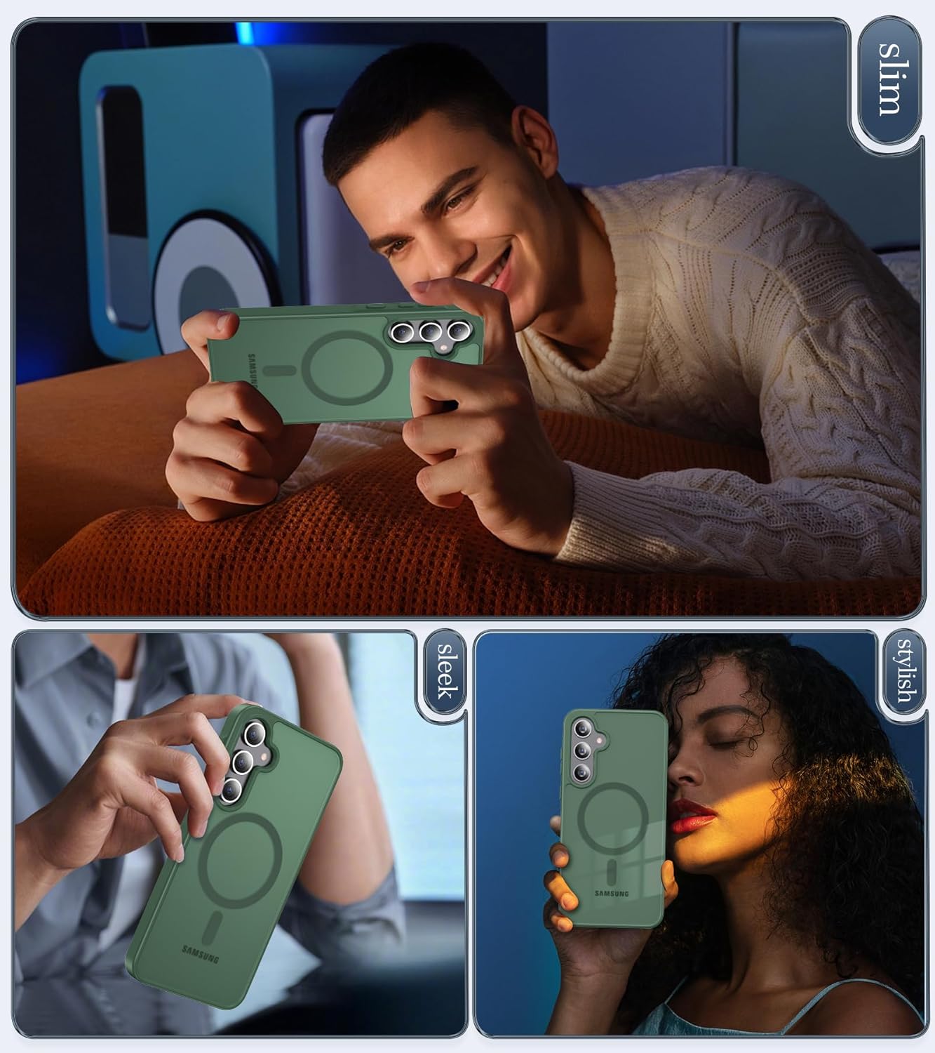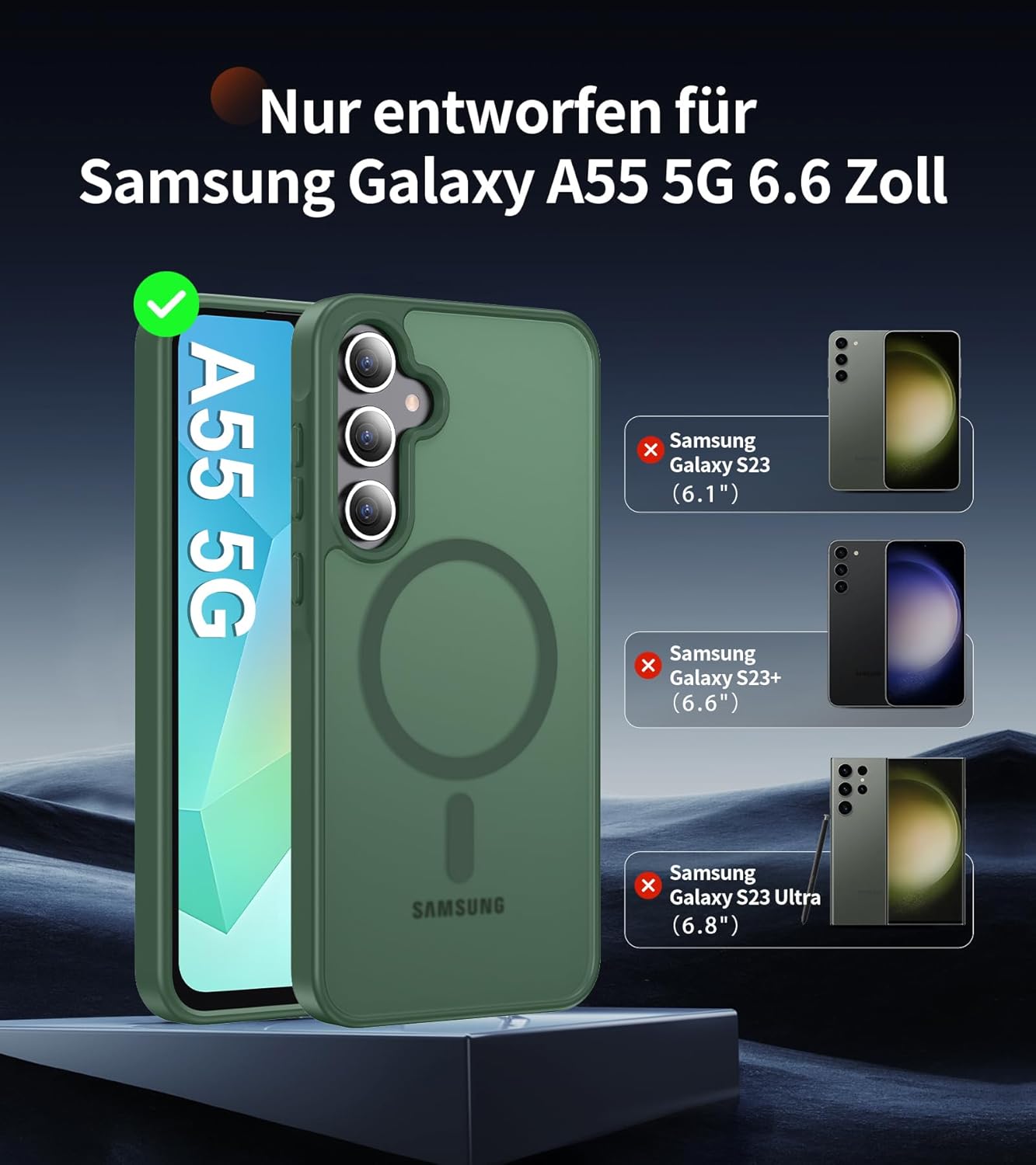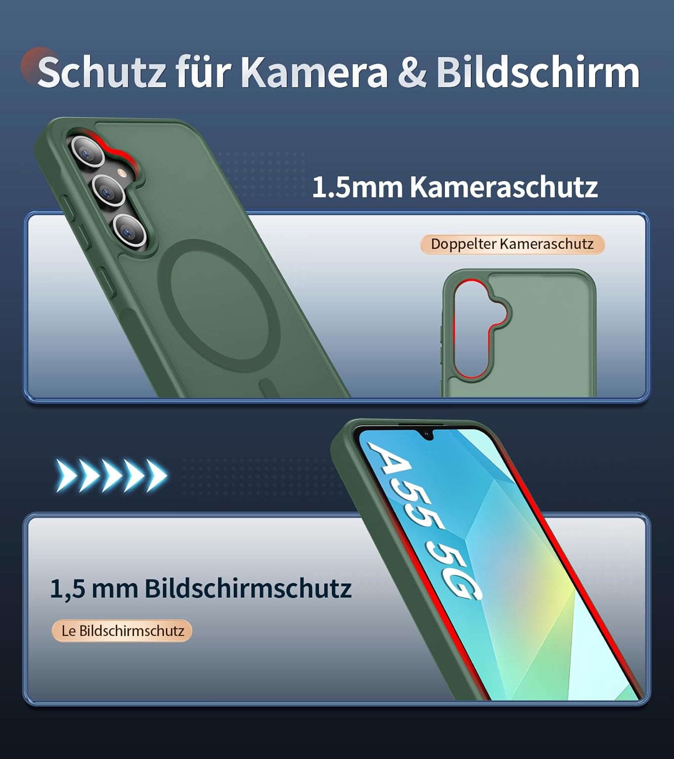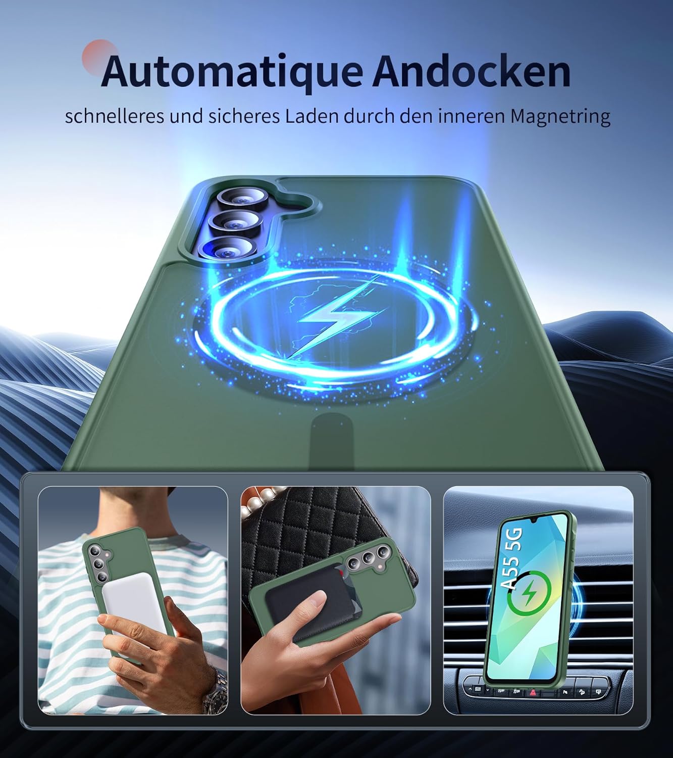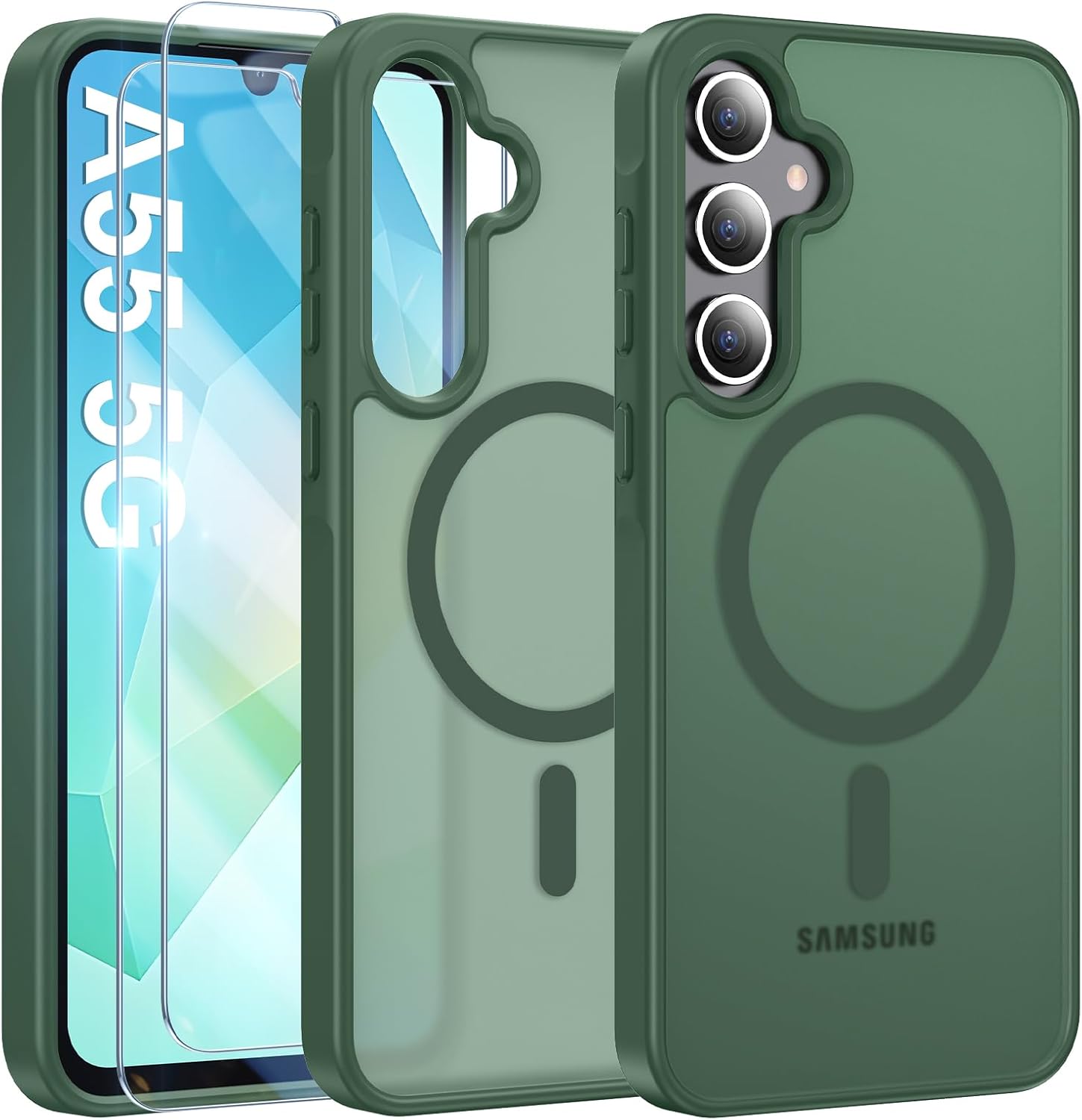 Магнитен калъф за мобилен телефон, съвместим с Samsung Galaxy A55 5G, съвместим с MagSafe с 2 протектора за екран, пълна защита на камерата, удароустойчив, тънък, прозрачен матов защитен калъф