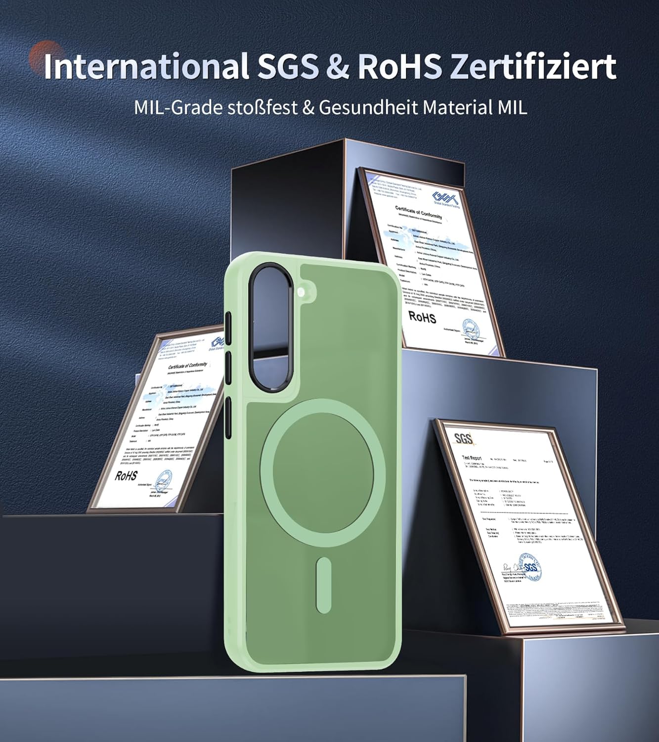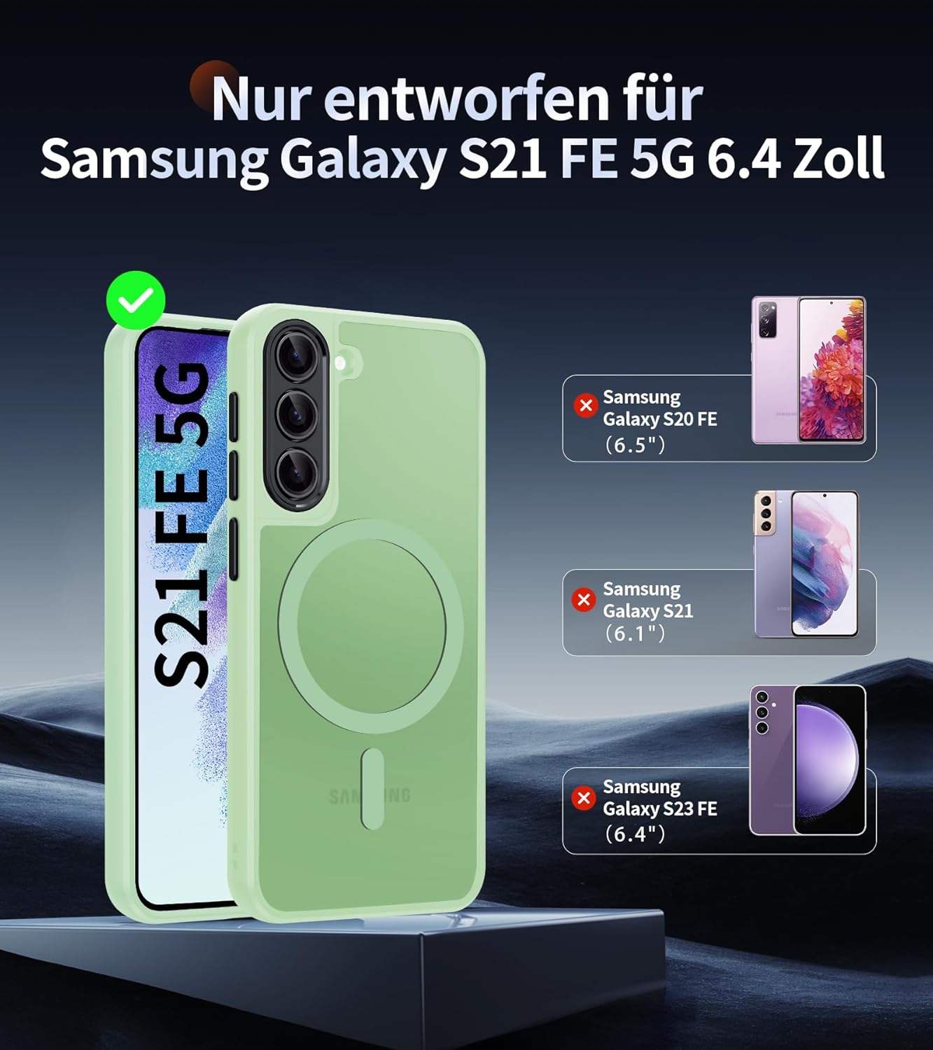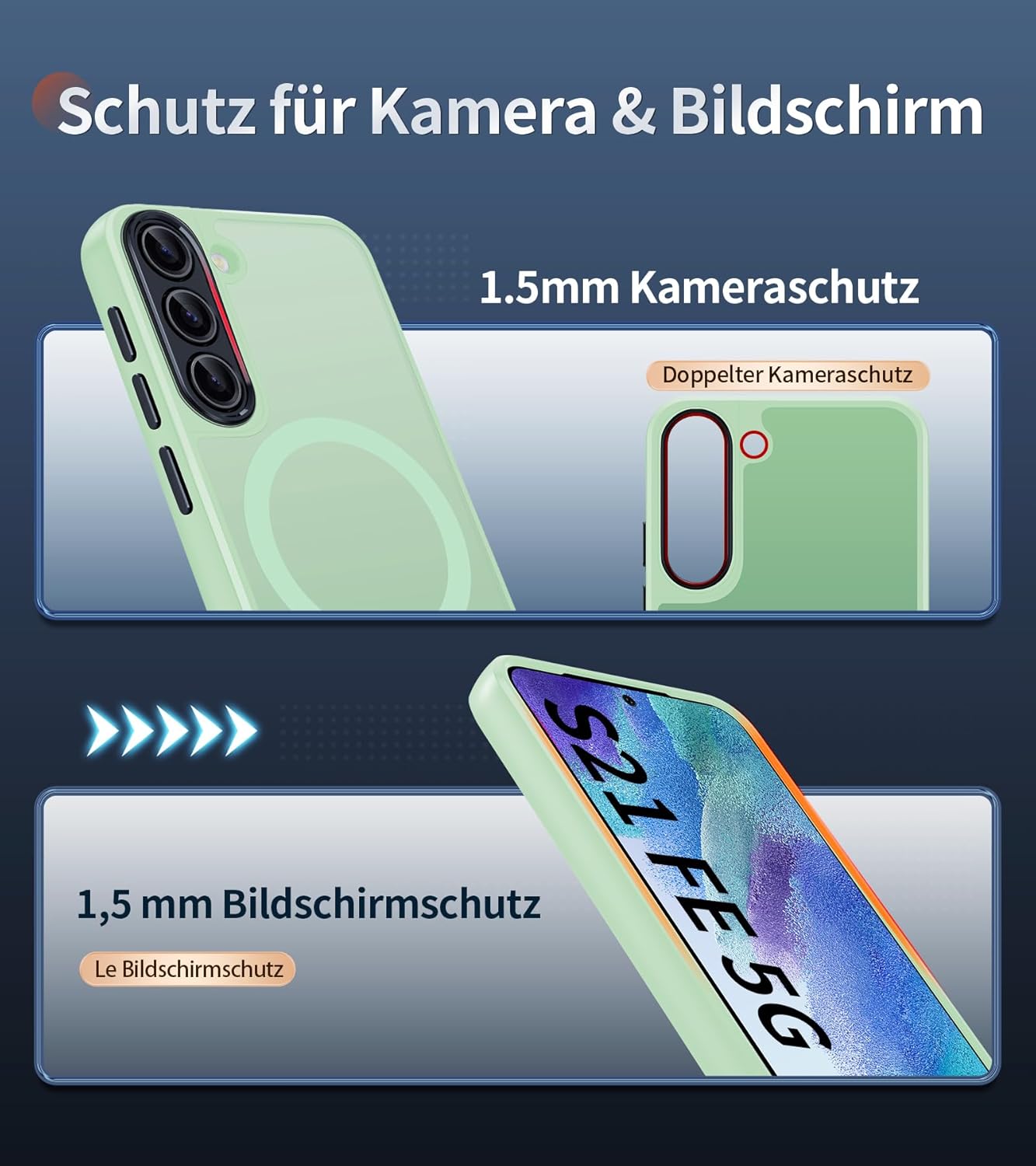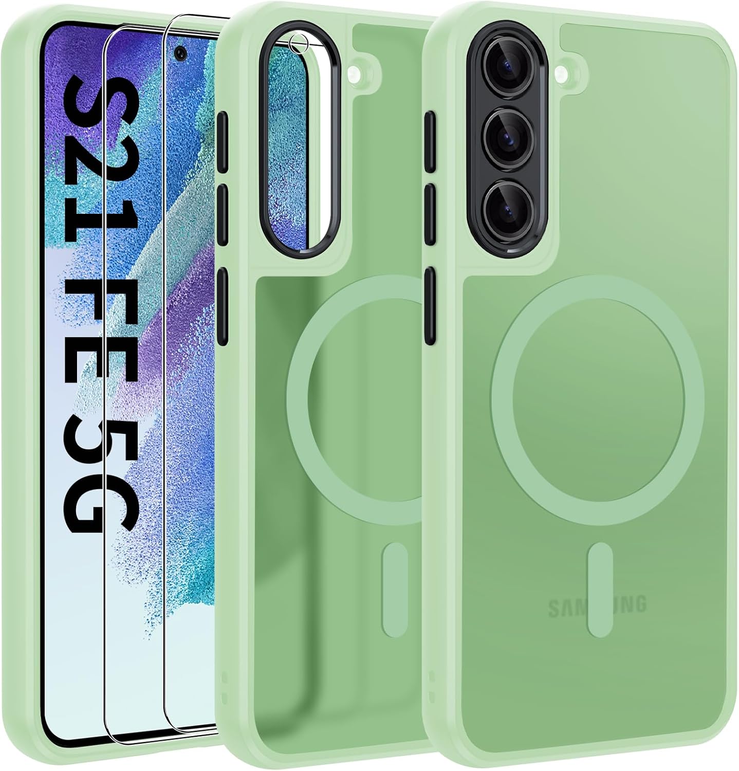 Магнитен калъф за мобилен телефон, съвместим със Samsung Galaxy S21 FE, съвместим с MagSafe с 2 защитни филма, пълна защита на камерата, удароустойчив, тънък, полупрозрачен матов защитен калъф