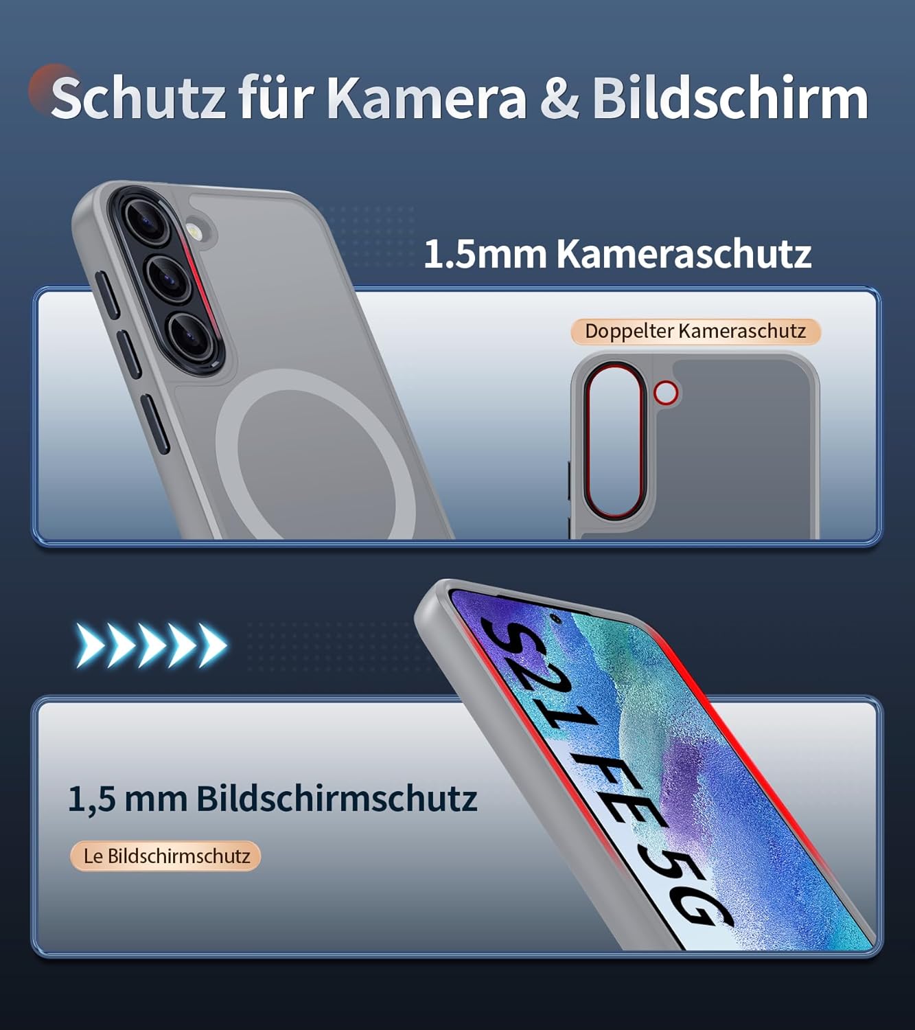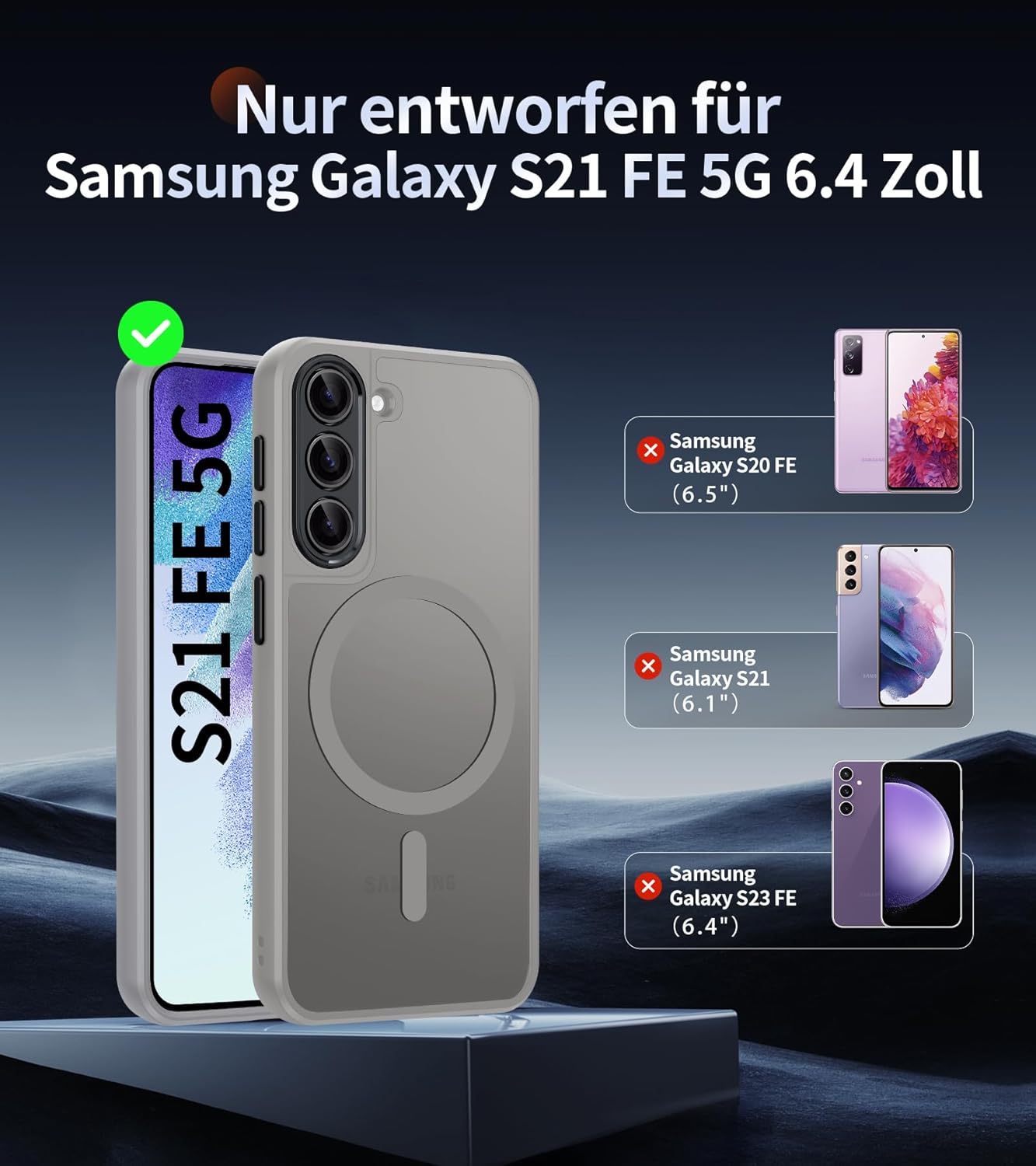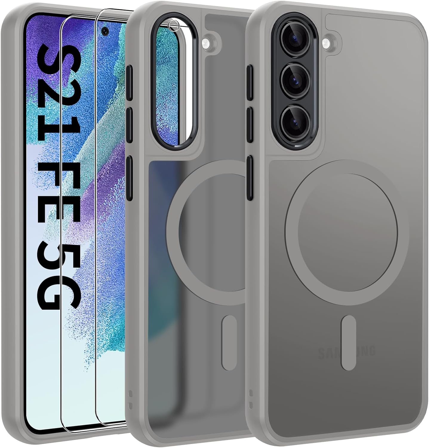 Магнитен калъф за мобилен телефон, съвместим със Samsung Galaxy S21 FE, съвместим с MagSafe с 2 защитни филма, пълна защита на камерата, удароустойчив, тънък, полупрозрачен матов защитен калъф