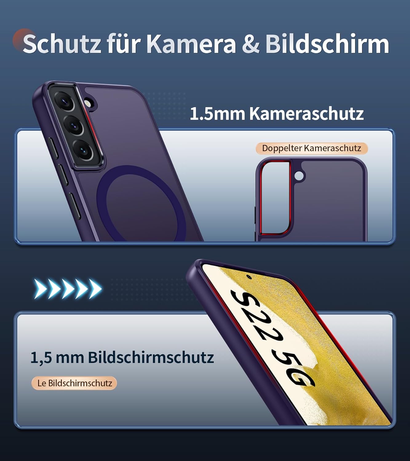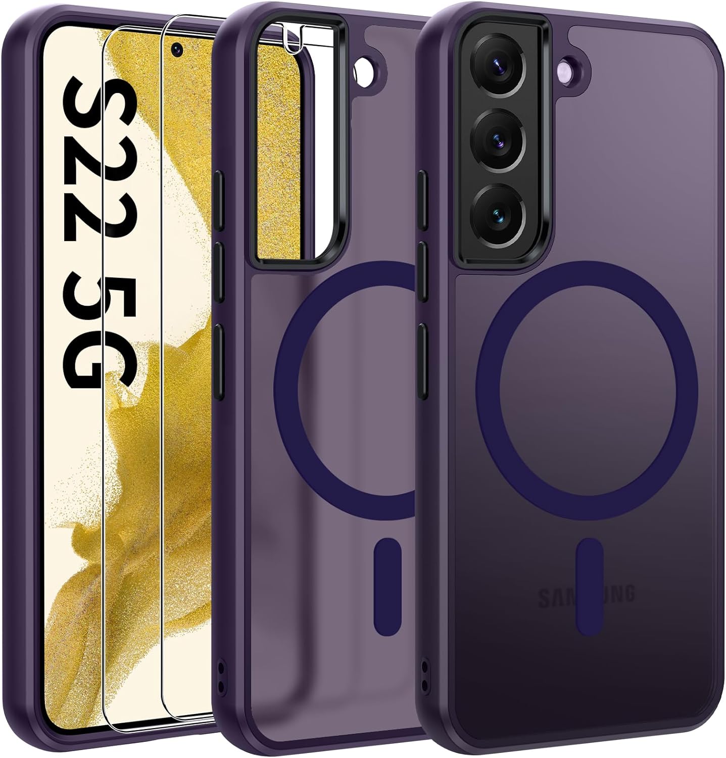 Магнитен калъф за мобилен телефон, съвместим със Samsung Galaxy S22, съвместим с MagSafe с 2 защитни филма, пълна защита на камерата, удароустойчив, тънък, полупрозрачен матов защитен калъф