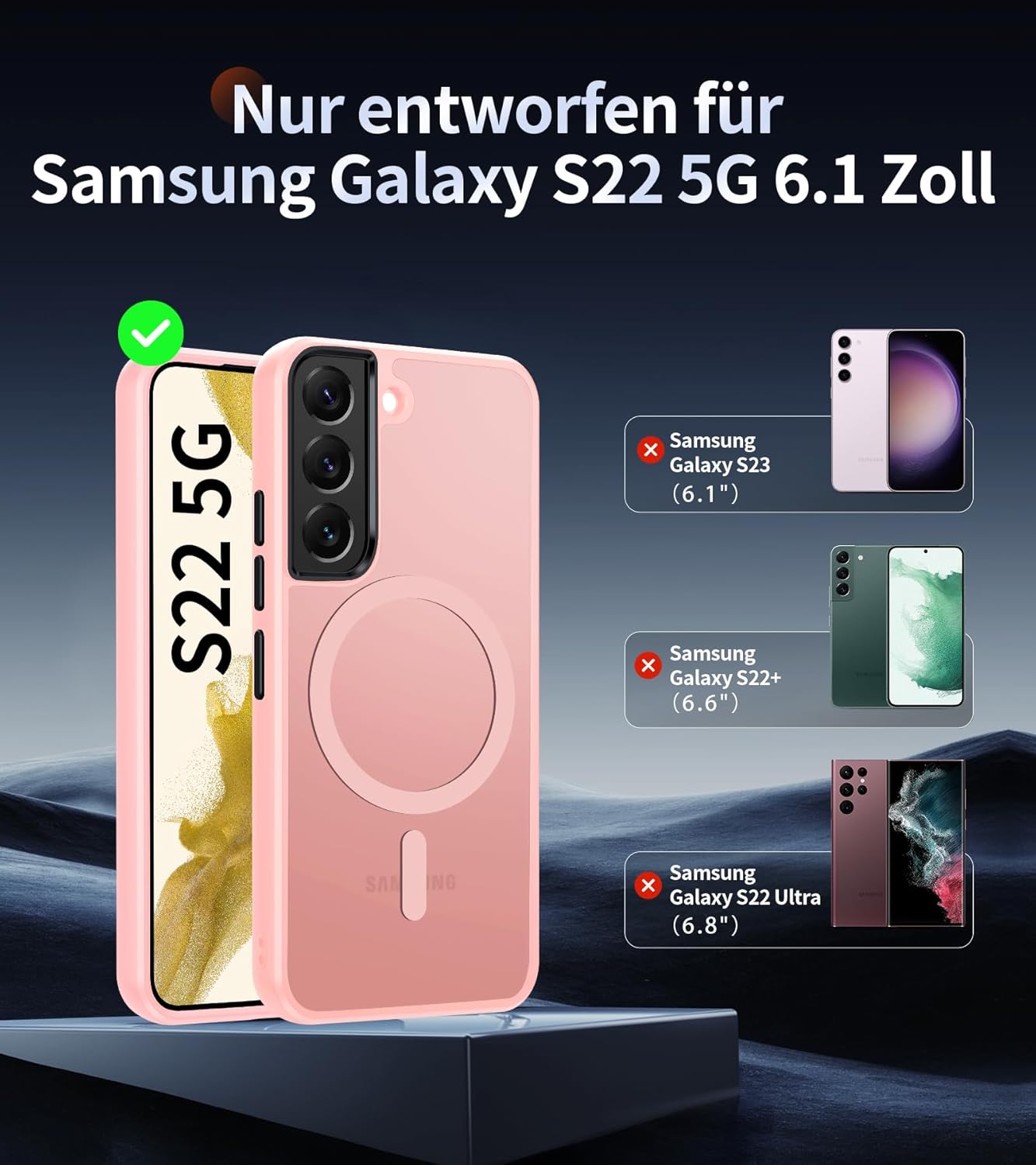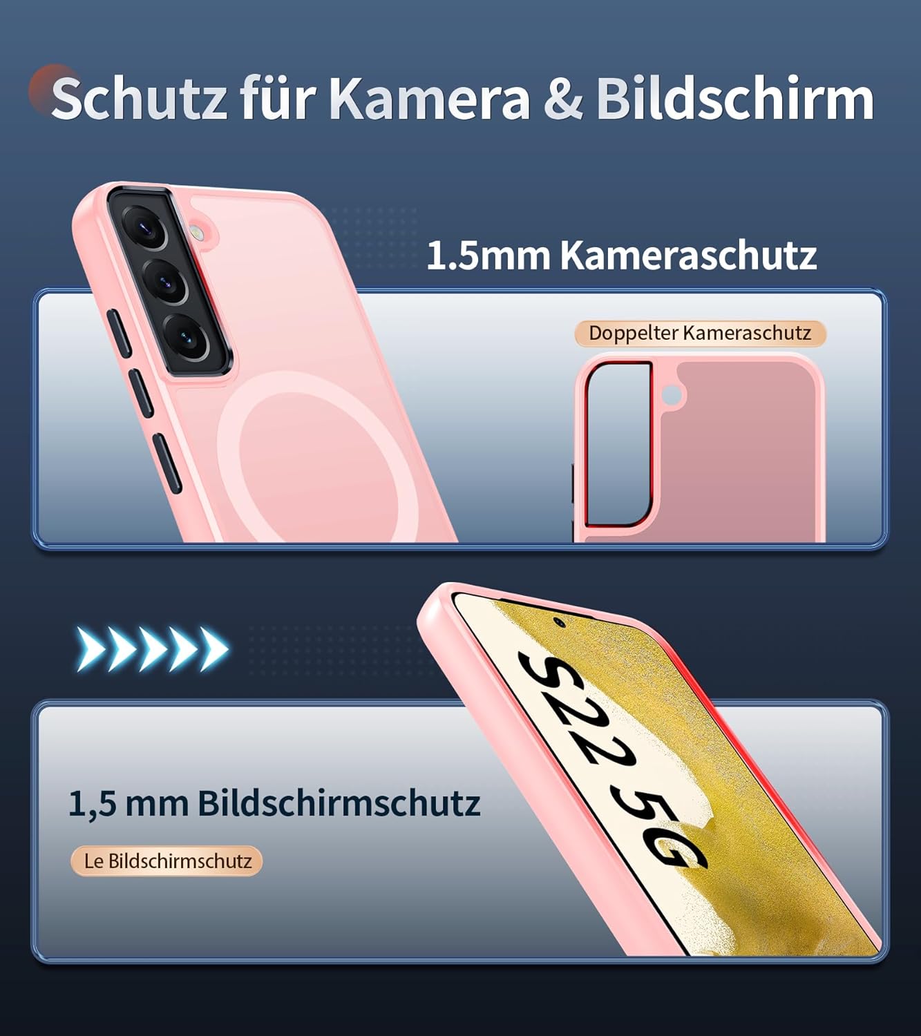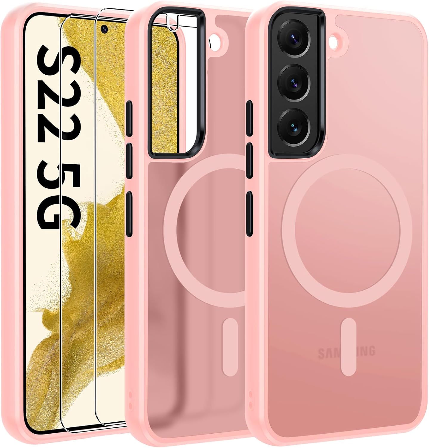 Магнитен калъф за мобилен телефон, съвместим със Samsung Galaxy S22, съвместим с MagSafe с 2 защитни филма, пълна защита на камерата, удароустойчив, тънък, полупрозрачен матов защитен калъф