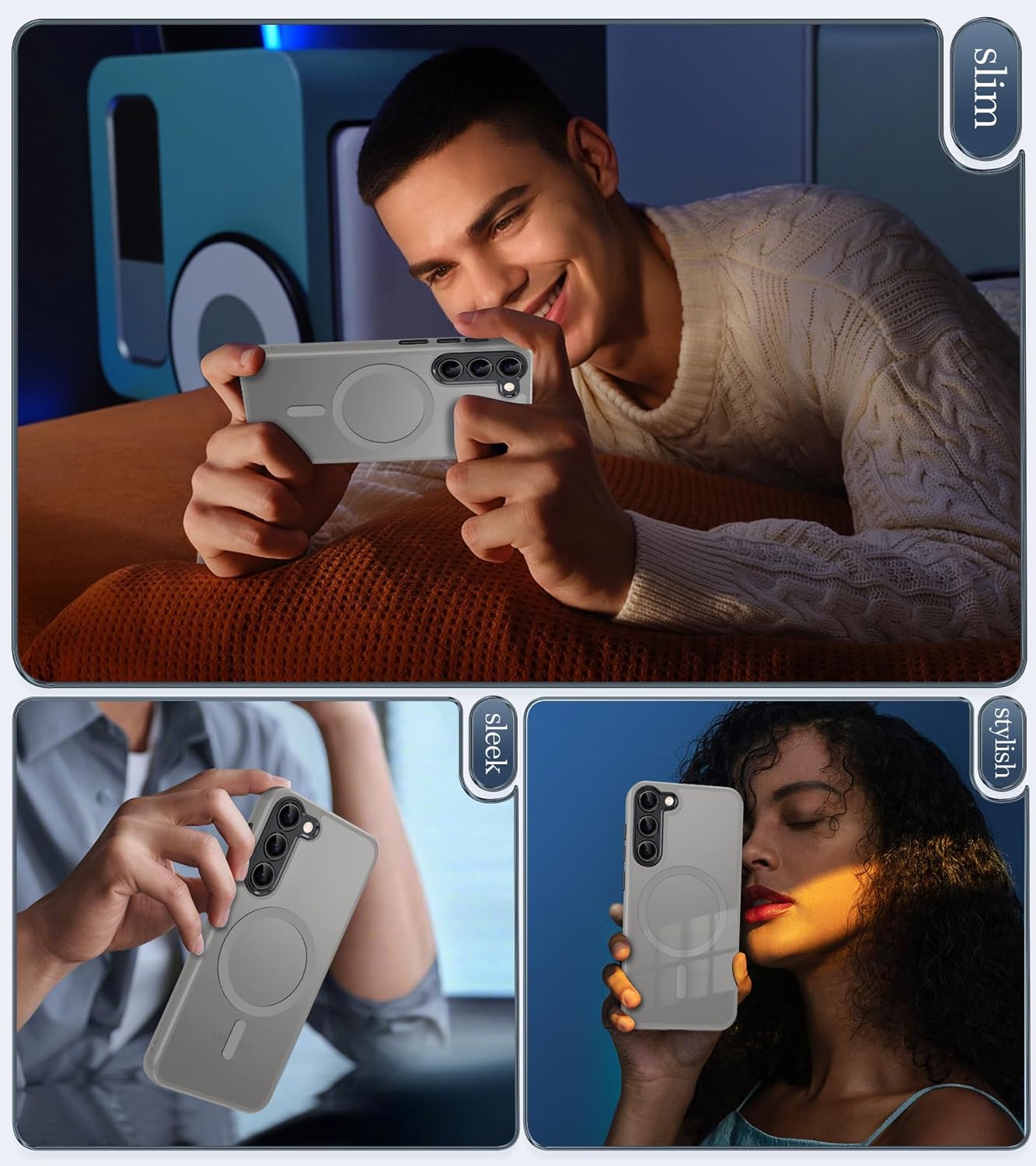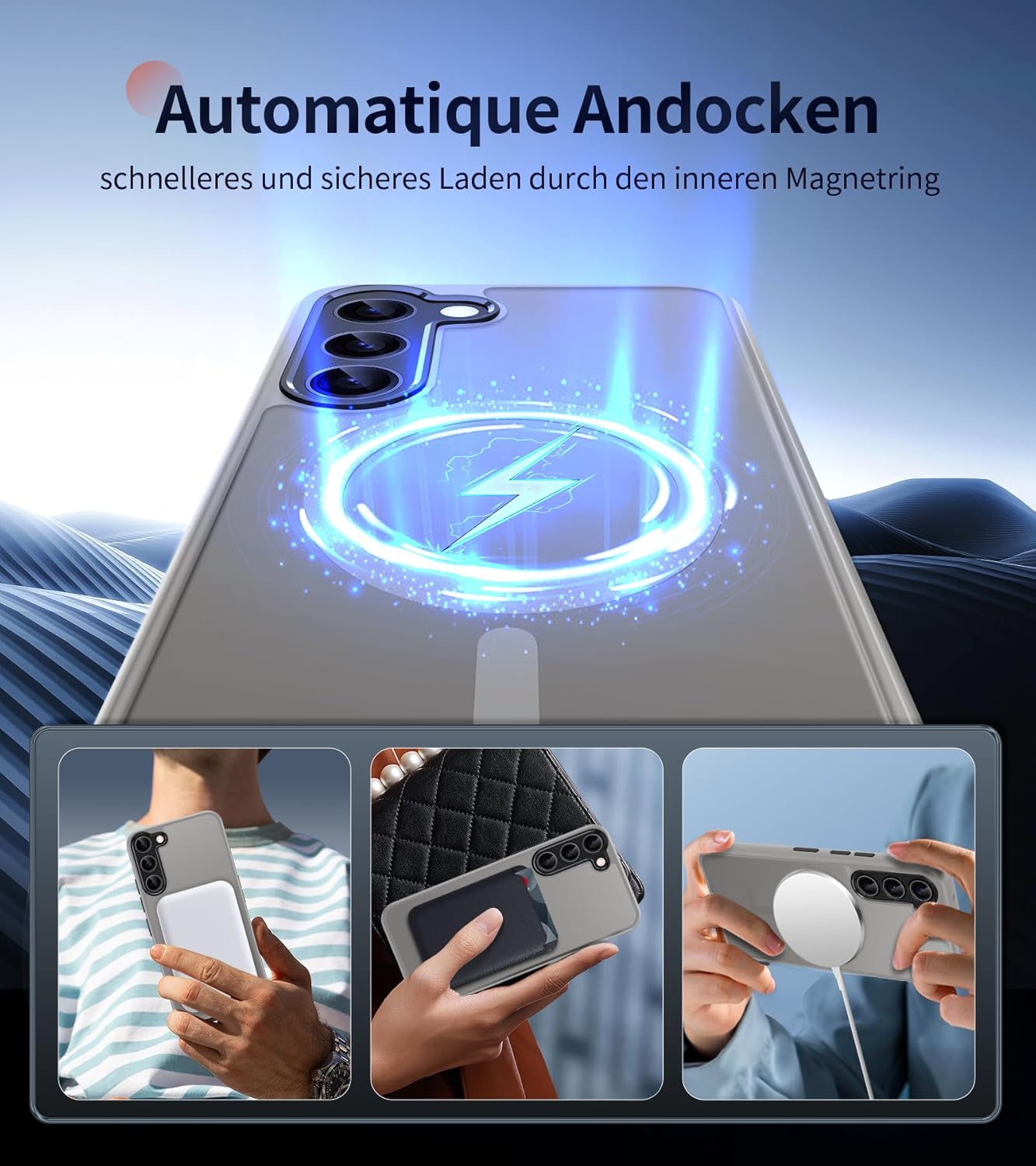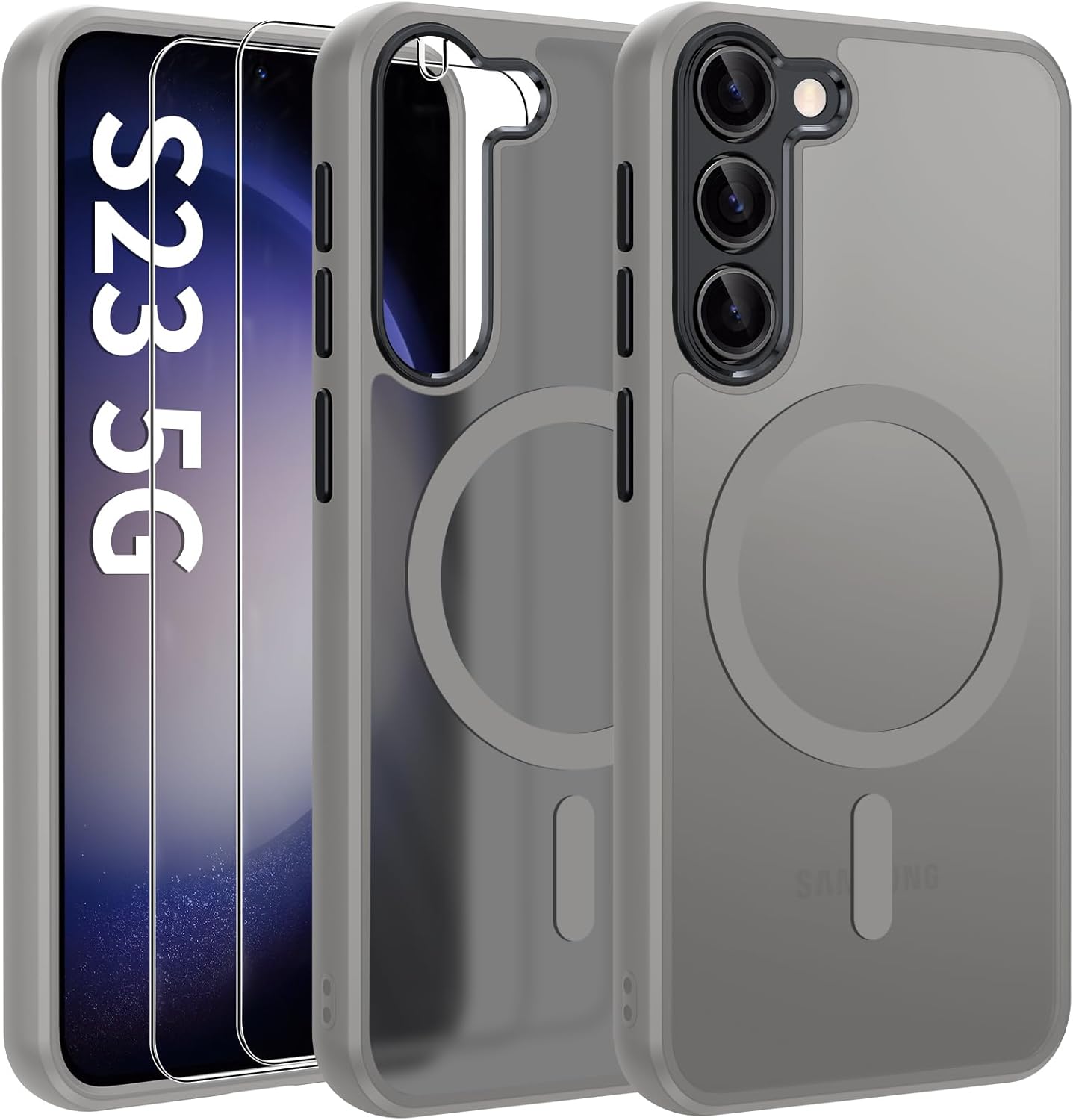 Магнитен калъф за мобилен телефон, съвместим със Samsung Galaxy S23, съвместим с MagSafe с 2 протектора за екран, пълна защита на камерата, удароустойчив, тънък, прозрачен матов защитен калъф