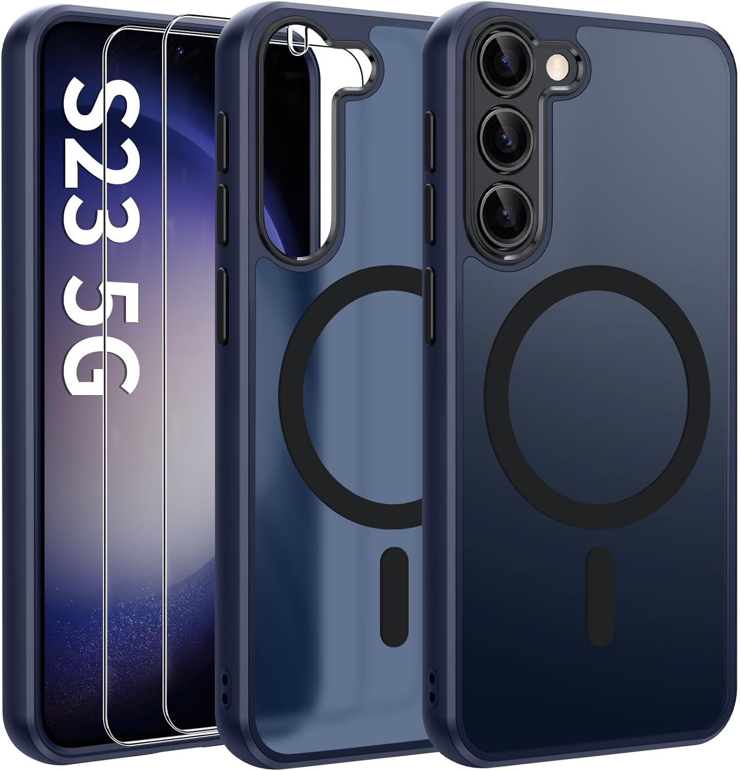 Магнитен калъф за мобилен телефон, съвместим със Samsung Galaxy S23, съвместим с MagSafe с 2 протектора за екран, пълна защита на камерата, удароустойчив, тънък, прозрачен матов защитен калъф