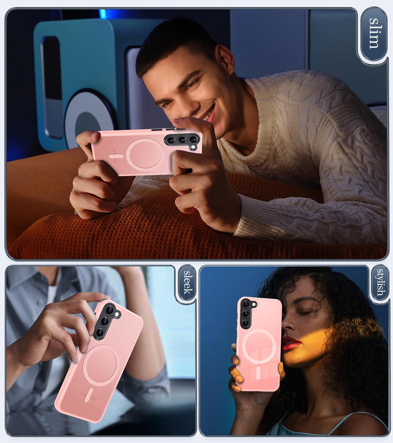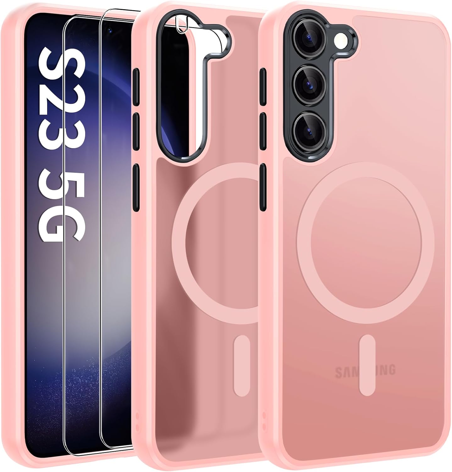 Магнитен калъф за мобилен телефон, съвместим със Samsung Galaxy S23, съвместим с MagSafe с 2 протектора за екран, пълна защита на камерата, удароустойчив, тънък, прозрачен матов защитен калъф