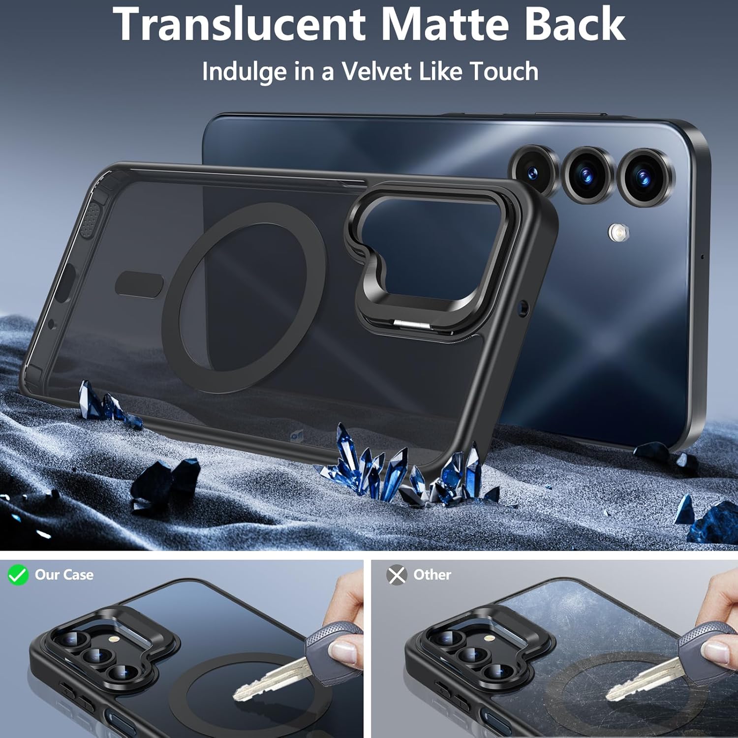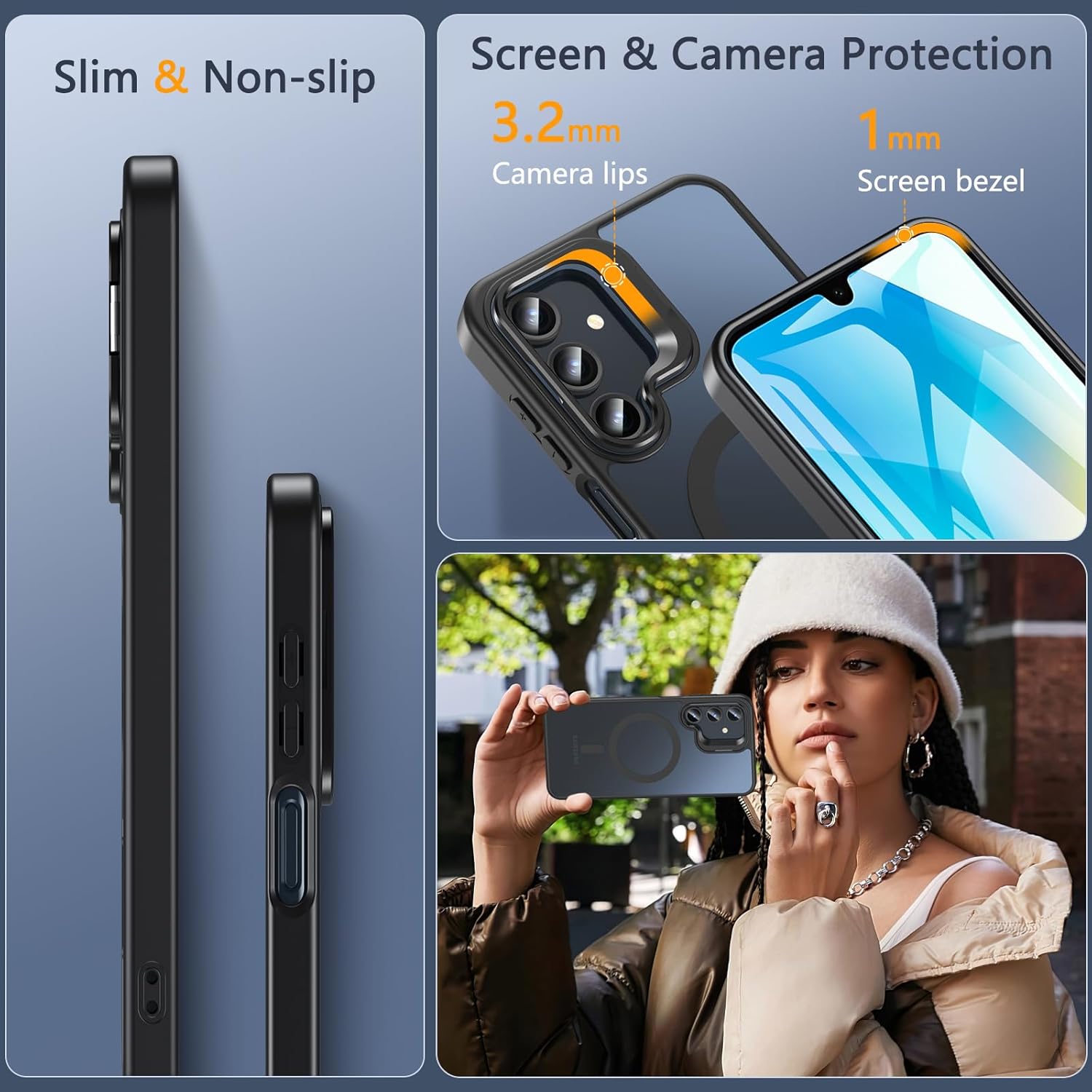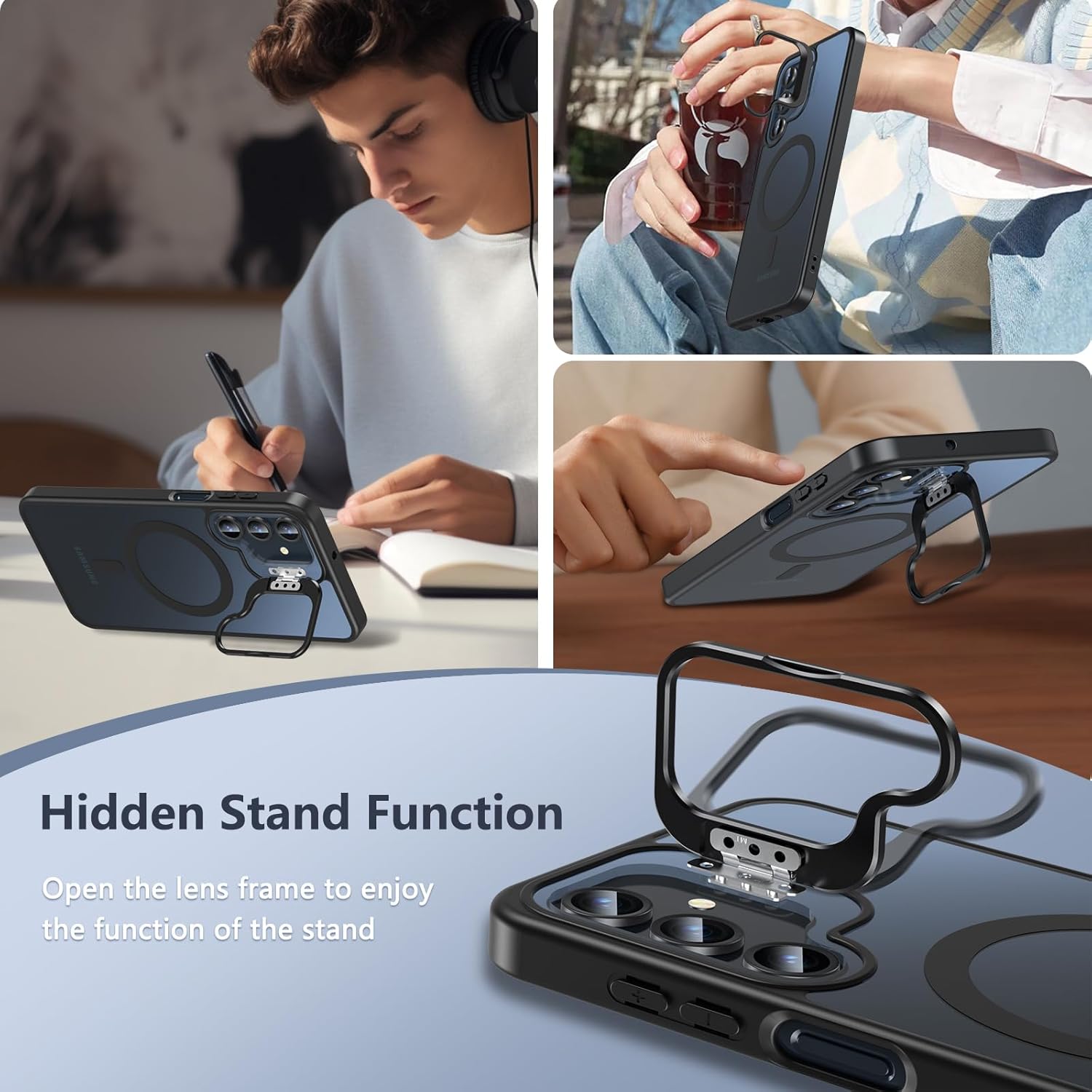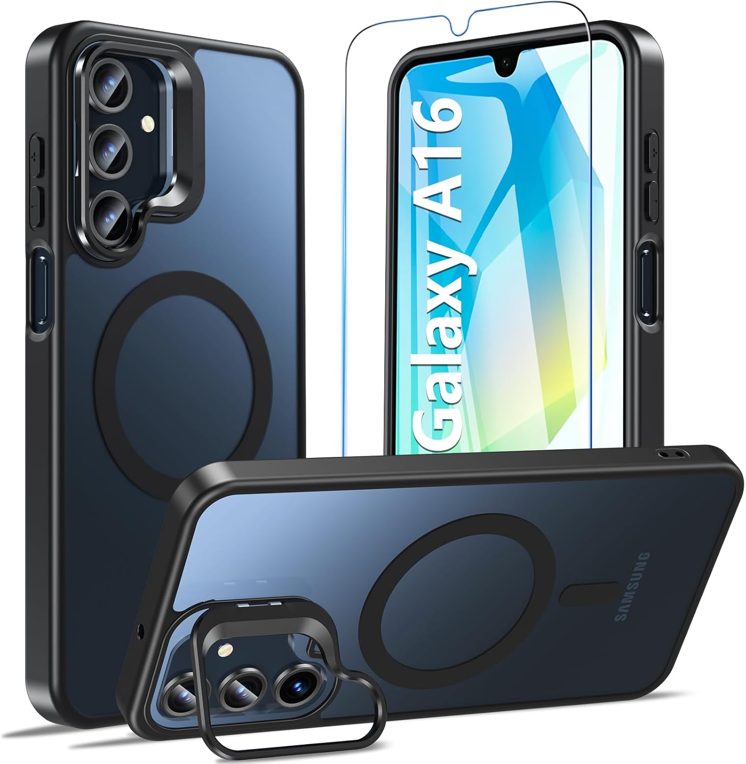 Магнитен калъф за Samsung Galaxy A16 | A16 5G със закалено стъкло и стойка, военна защита, калъф за мобилен телефон A16 с MagSafe матов прозрачен защитен калъф за Samsung A16 5G/A16 4G