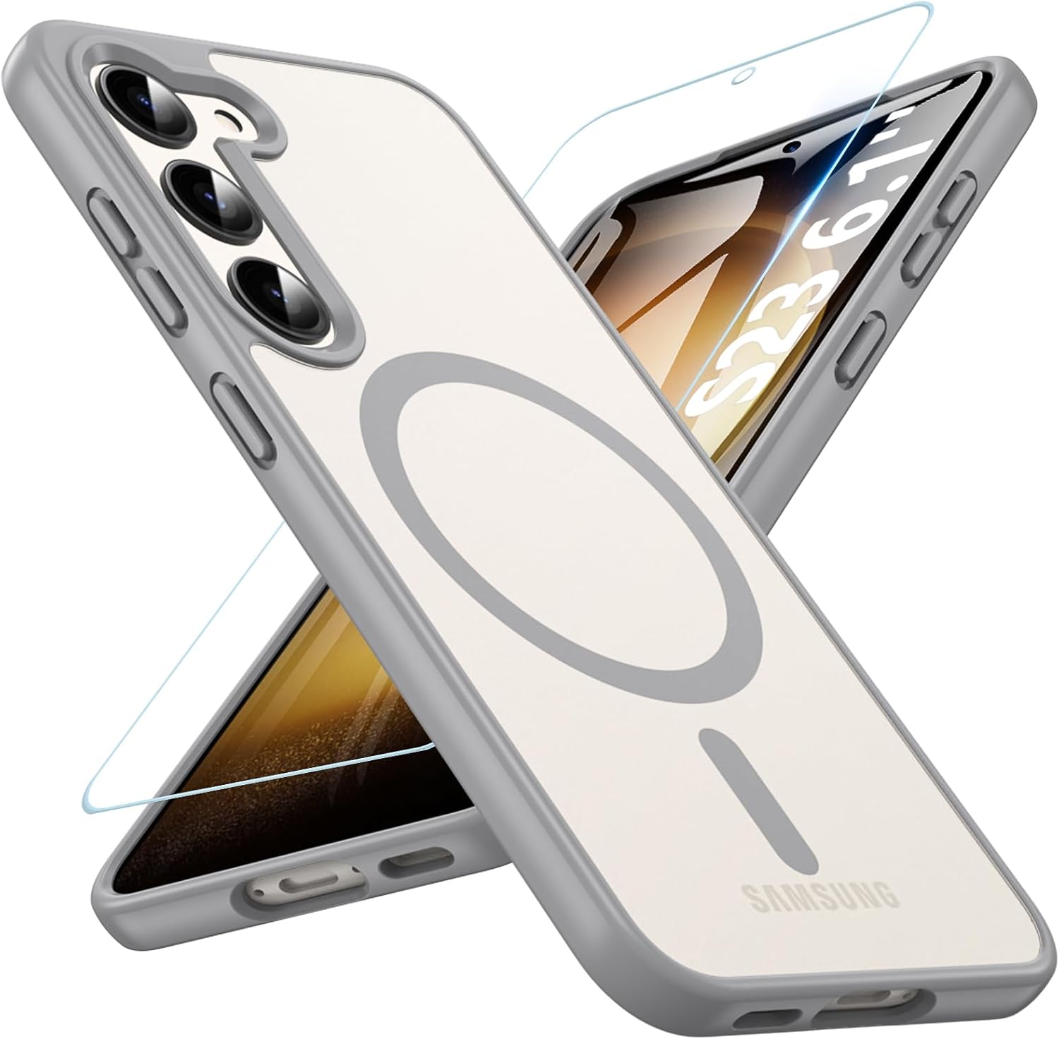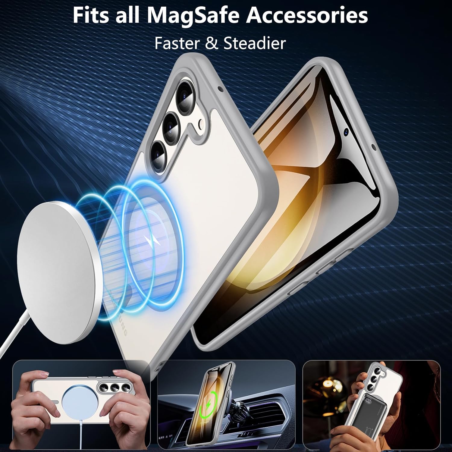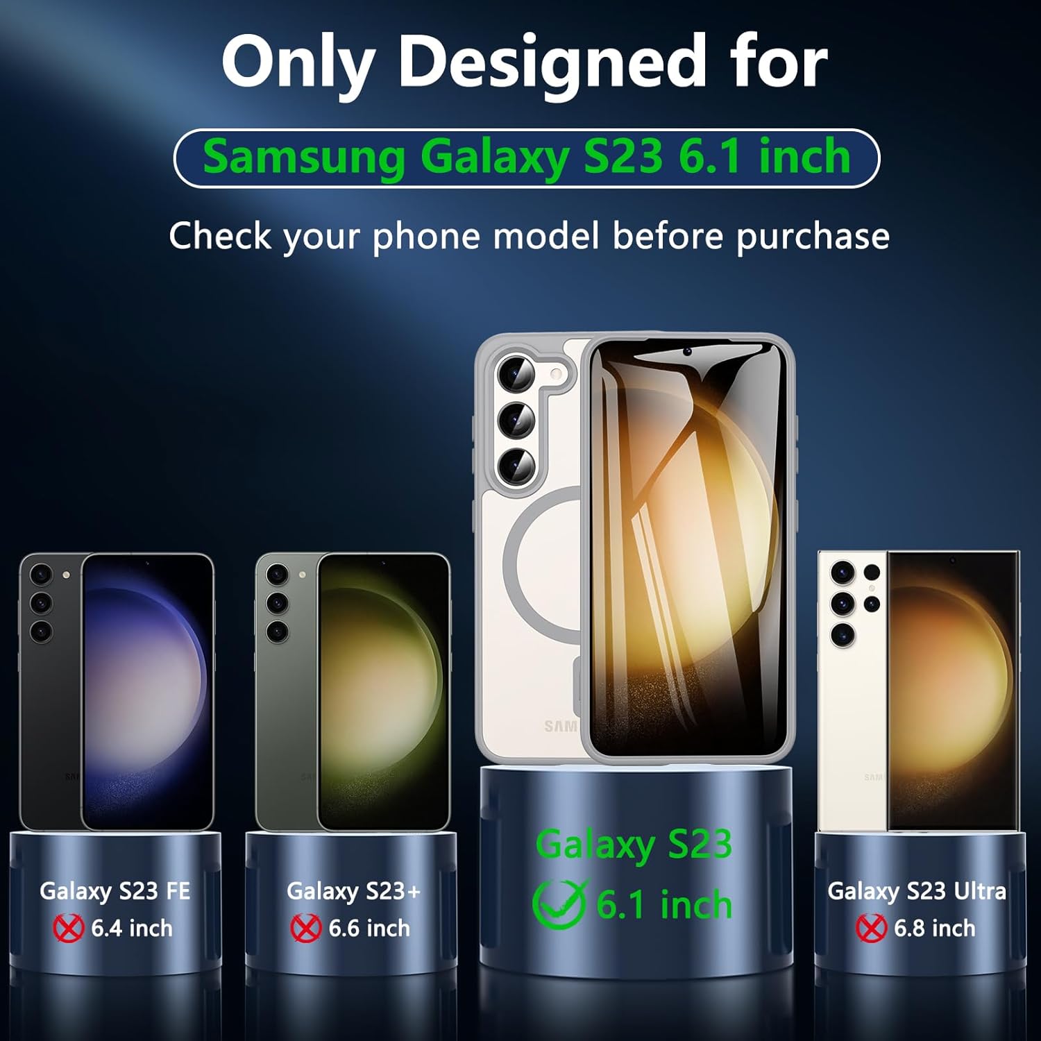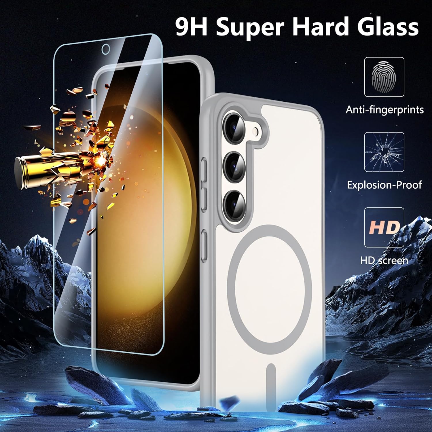 Магнитен калъф за Samsung Galaxy S23 със закалено стъкло, военна защита, калъф за мобилен телефон S23 с MagSafe матово полупрозрачно защитно фолио, защитен калъф за Samsung S23 (сив)