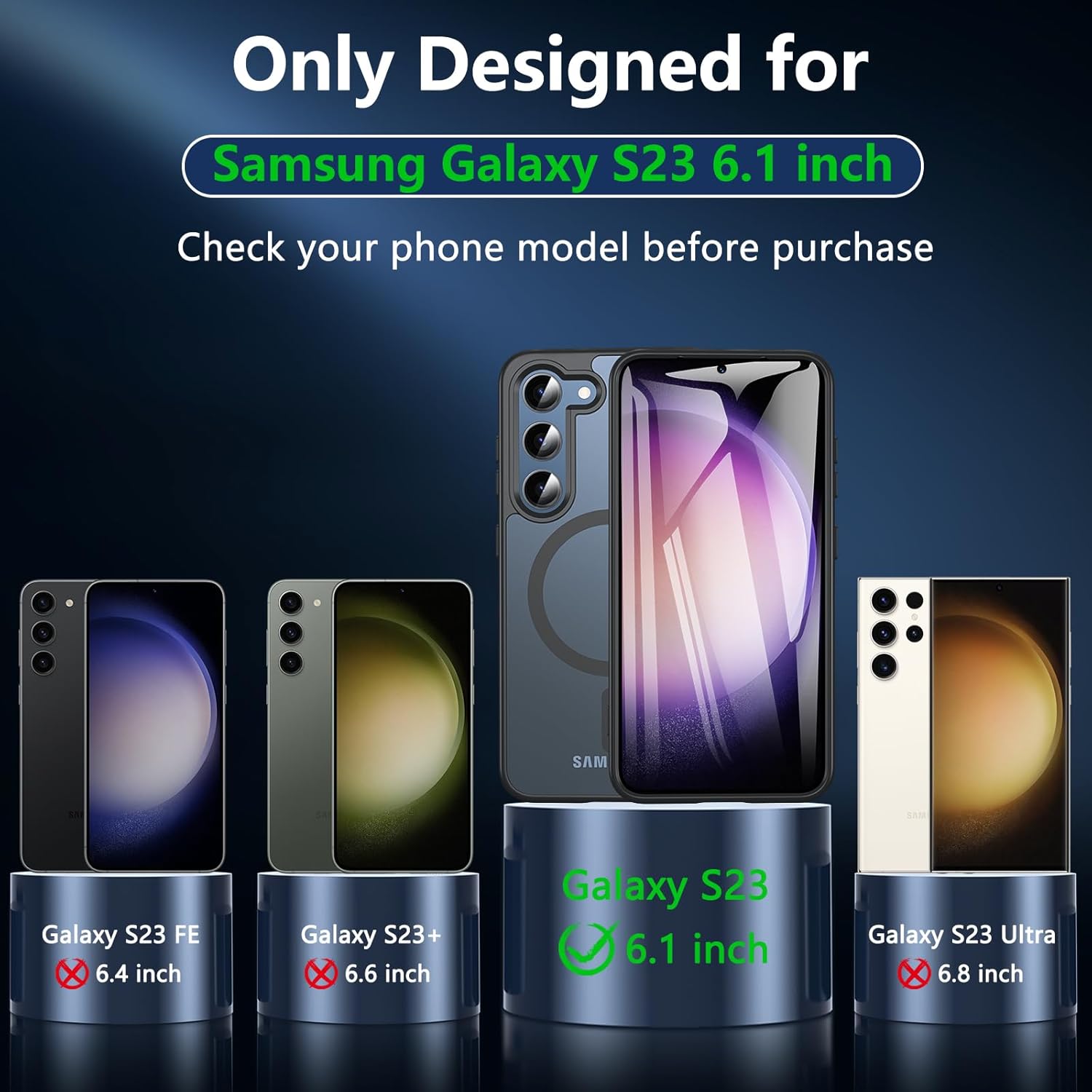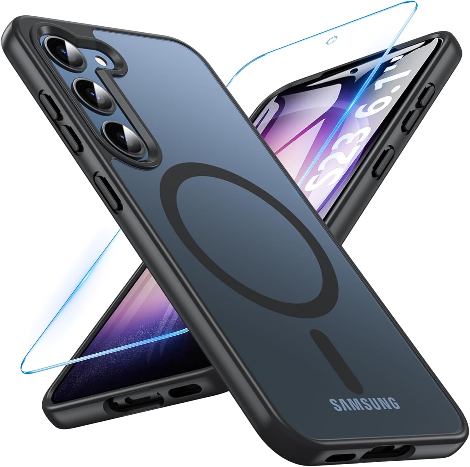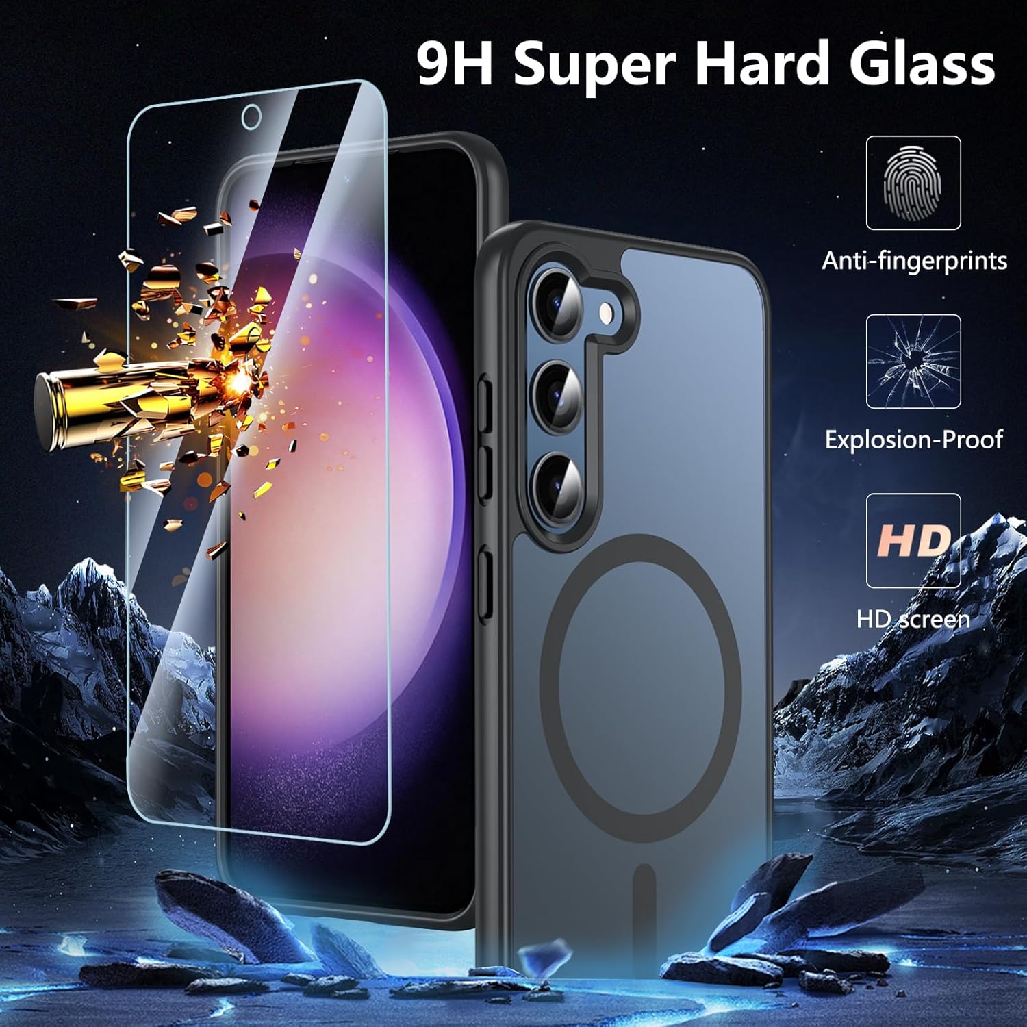 Магнитен калъф за Samsung Galaxy S23 със закалено стъкло, военна защита, калъф за мобилен телефон за Samsung S23 с MagSafe матово полупрозрачно защитно фолио, защитен калъф за Samsung S23