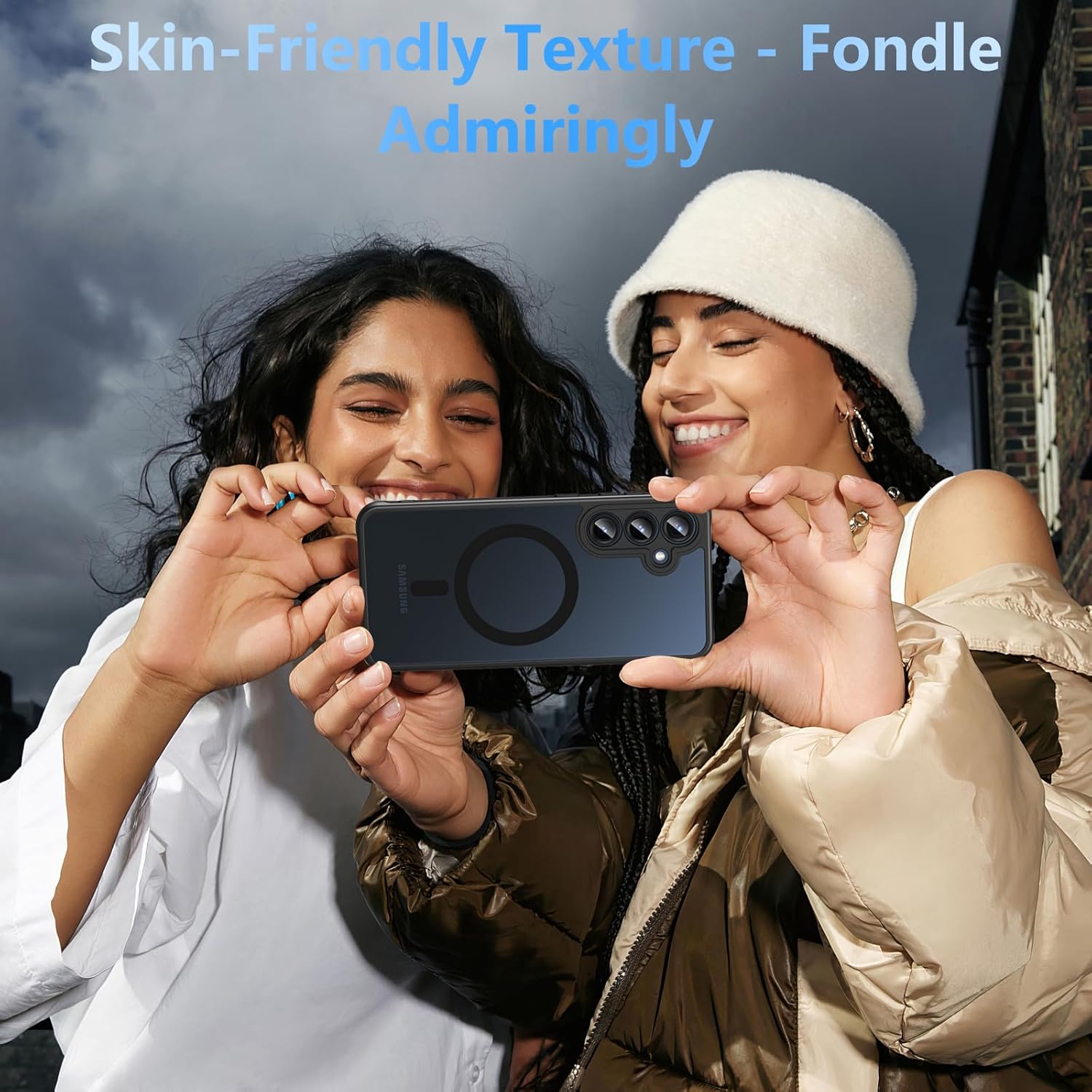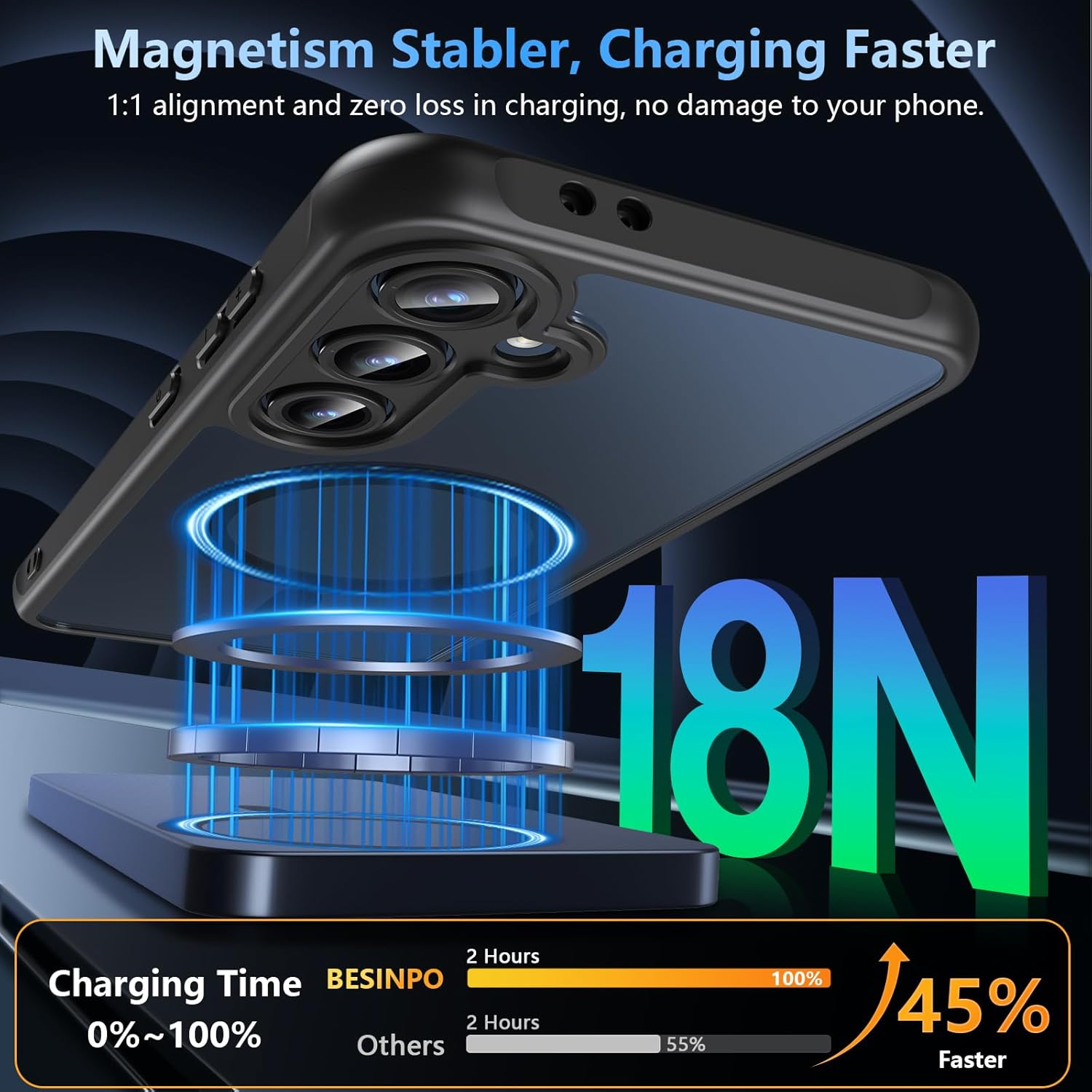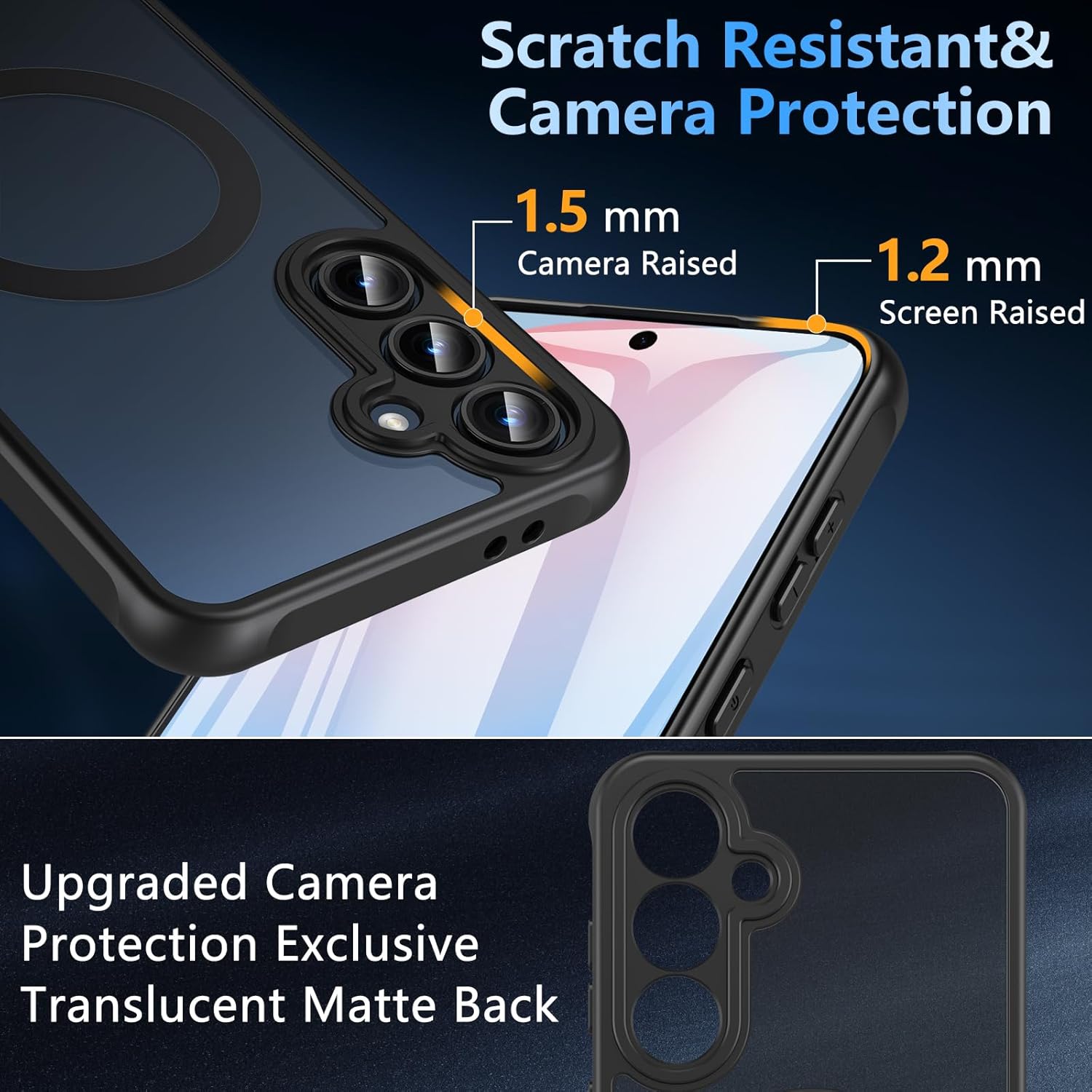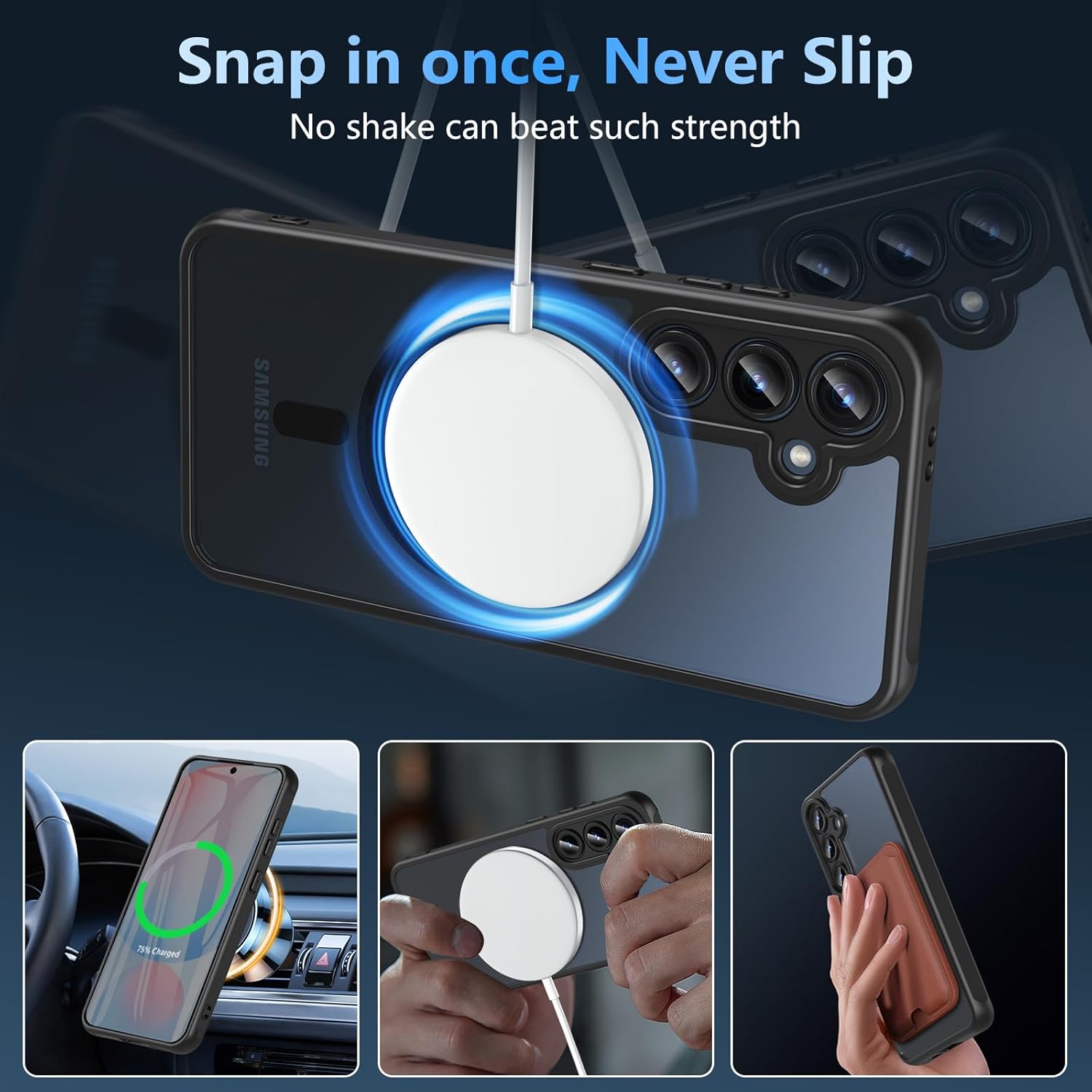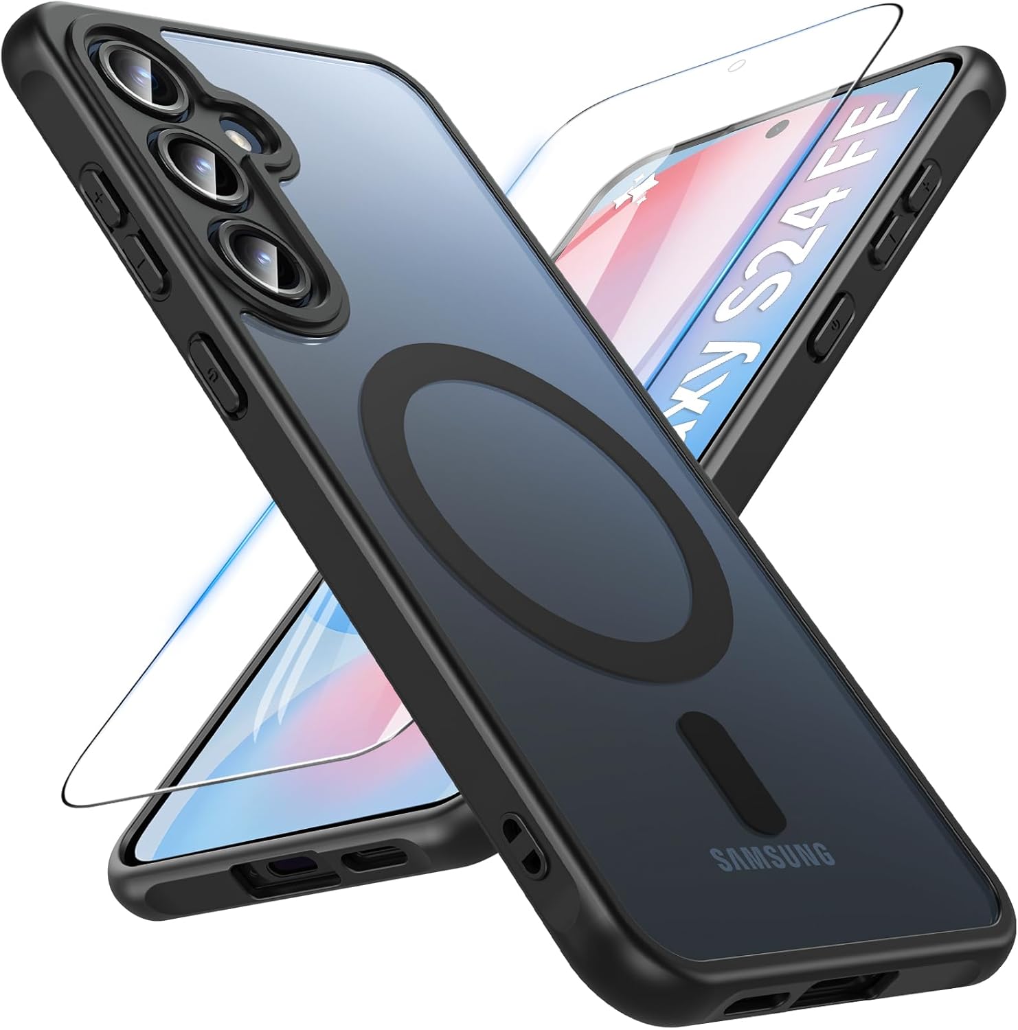 Магнитен калъф за Samsung Galaxy S24 FE, закалено стъкло, калъф за мобилен телефон с военна защита и MagSafe, матов прозрачен здрав протектор за екрана и калъф за Samsung S24 FE (черен)