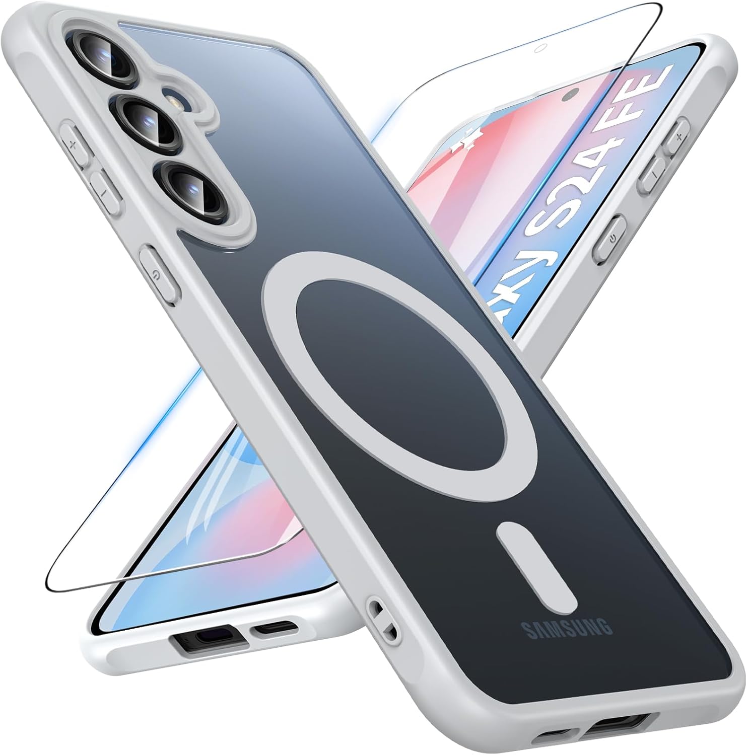 Магнитен калъф за Samsung Galaxy S24 FE, закалено стъкло, калъф за мобилен телефон със защита от военен клас, матов прозрачен здрав протектор за екран и защитен калъф за Samsung S24 FE (сив)