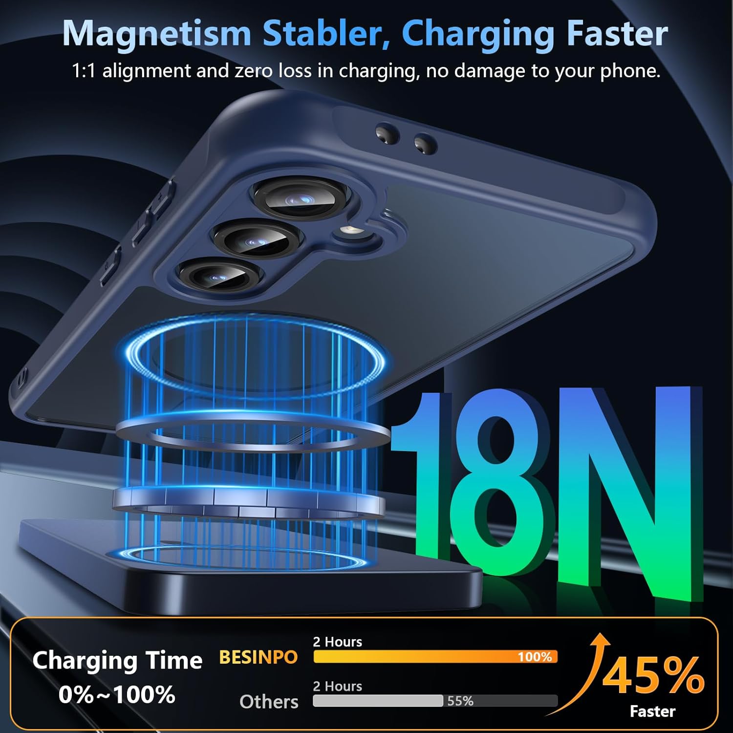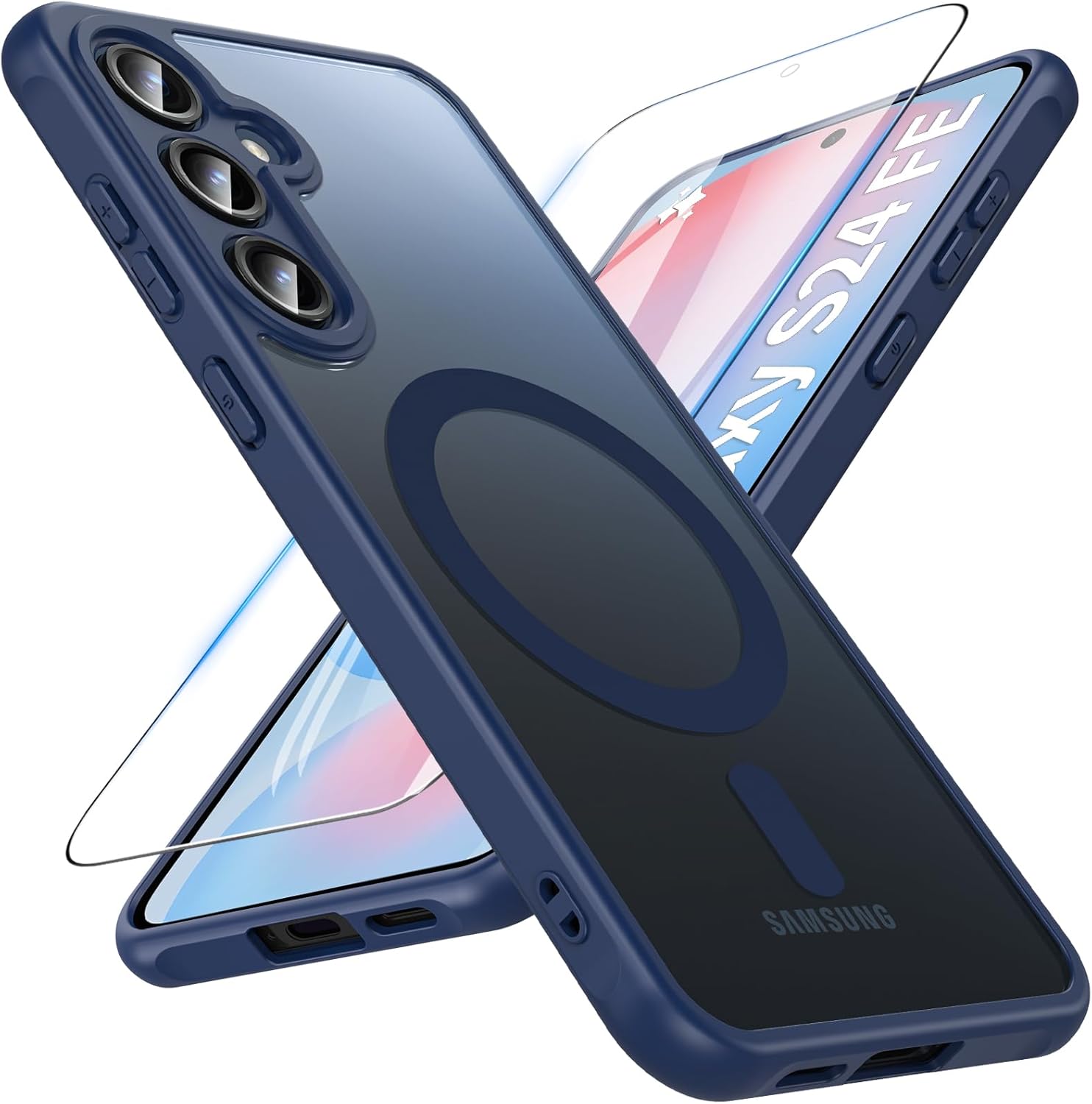 Магнитен калъф за Samsung Galaxy S24 FE, закалено стъкло, калъф за мобилен телефон със защита от военен клас, матов прозрачен здрав протектор за екрана и защитен калъф за Samsung S24 FE (син)
