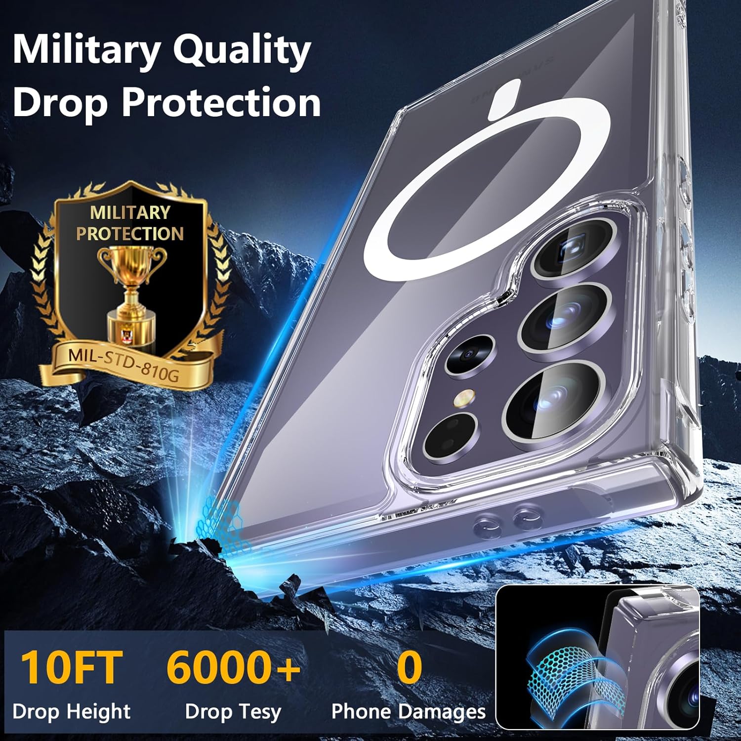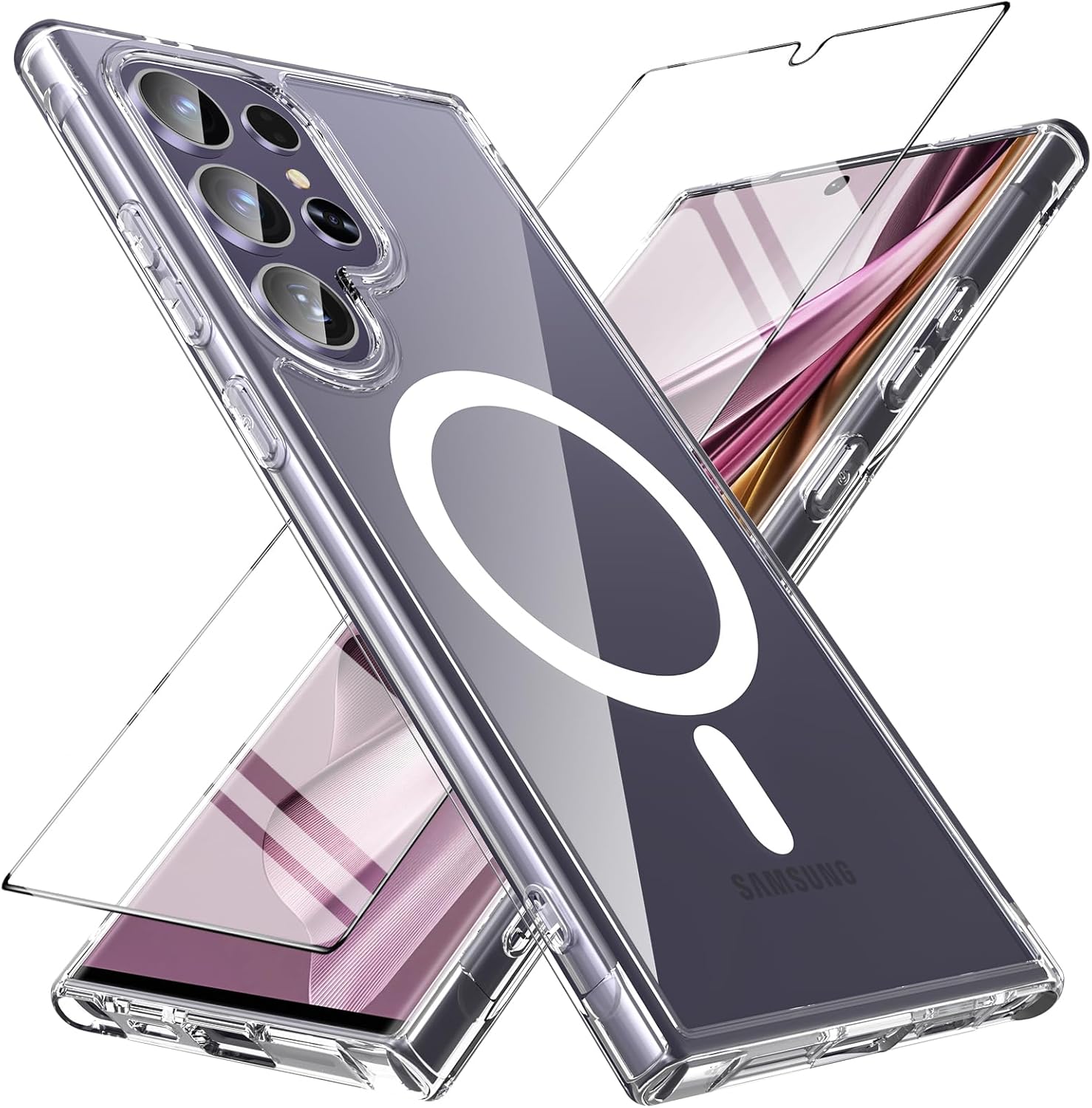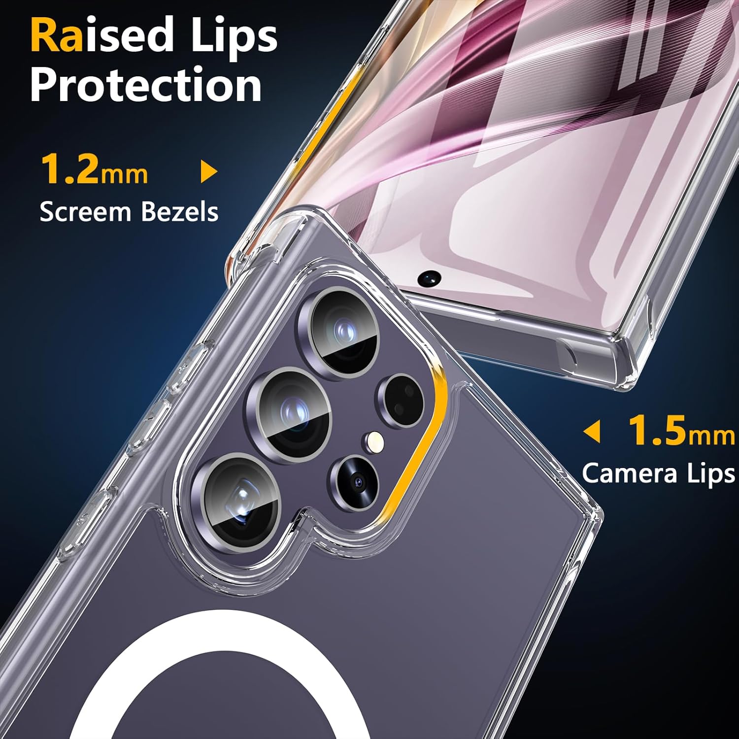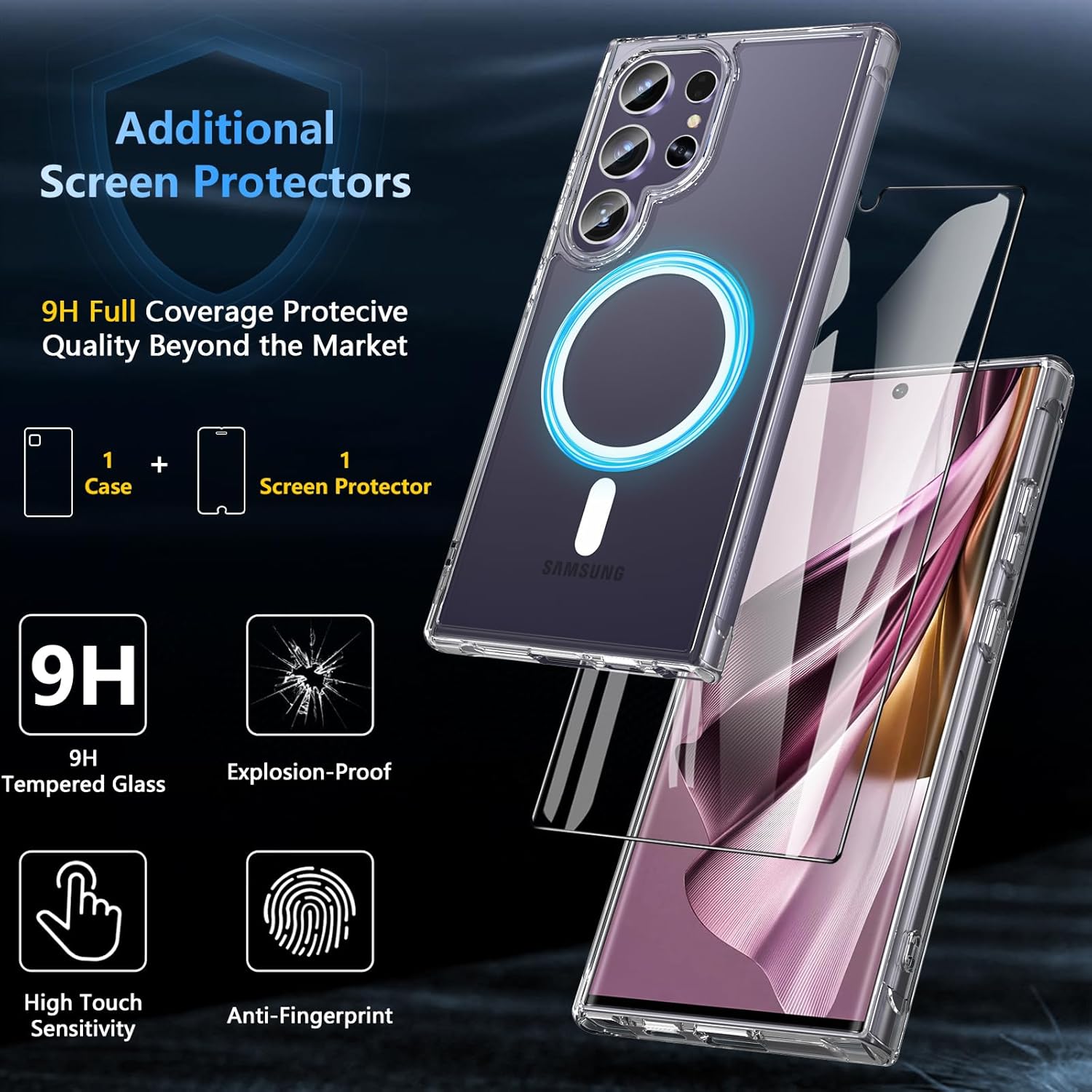 Магнитен калъф за Samsung Galaxy S24 Ultra, със закалено стъкло, защита от военен клас, удароустойчив, здрав, прозрачен калъф тип „bumper“ за Samsung S24 Ultra 5G 2024 (прозрачен)