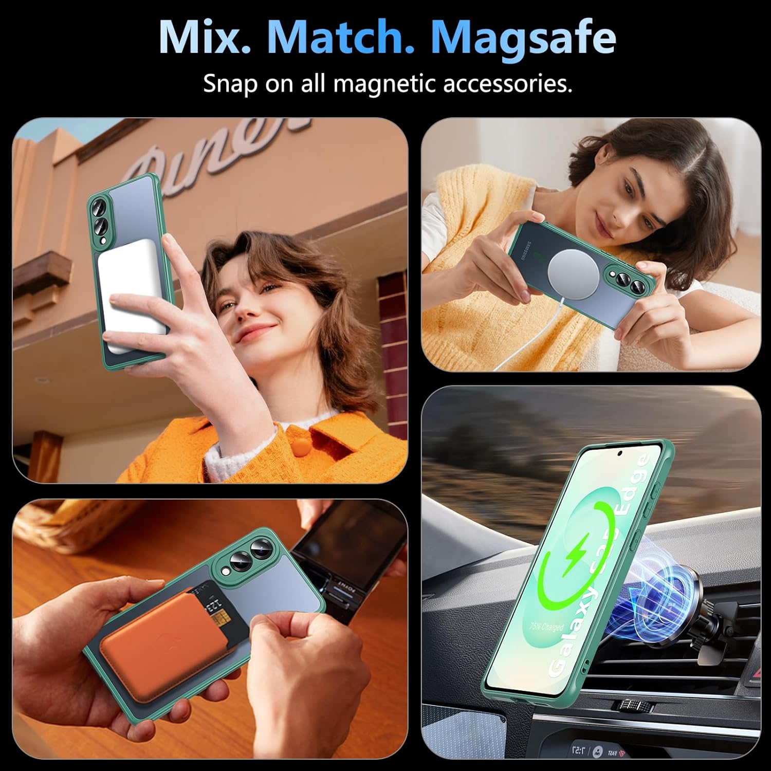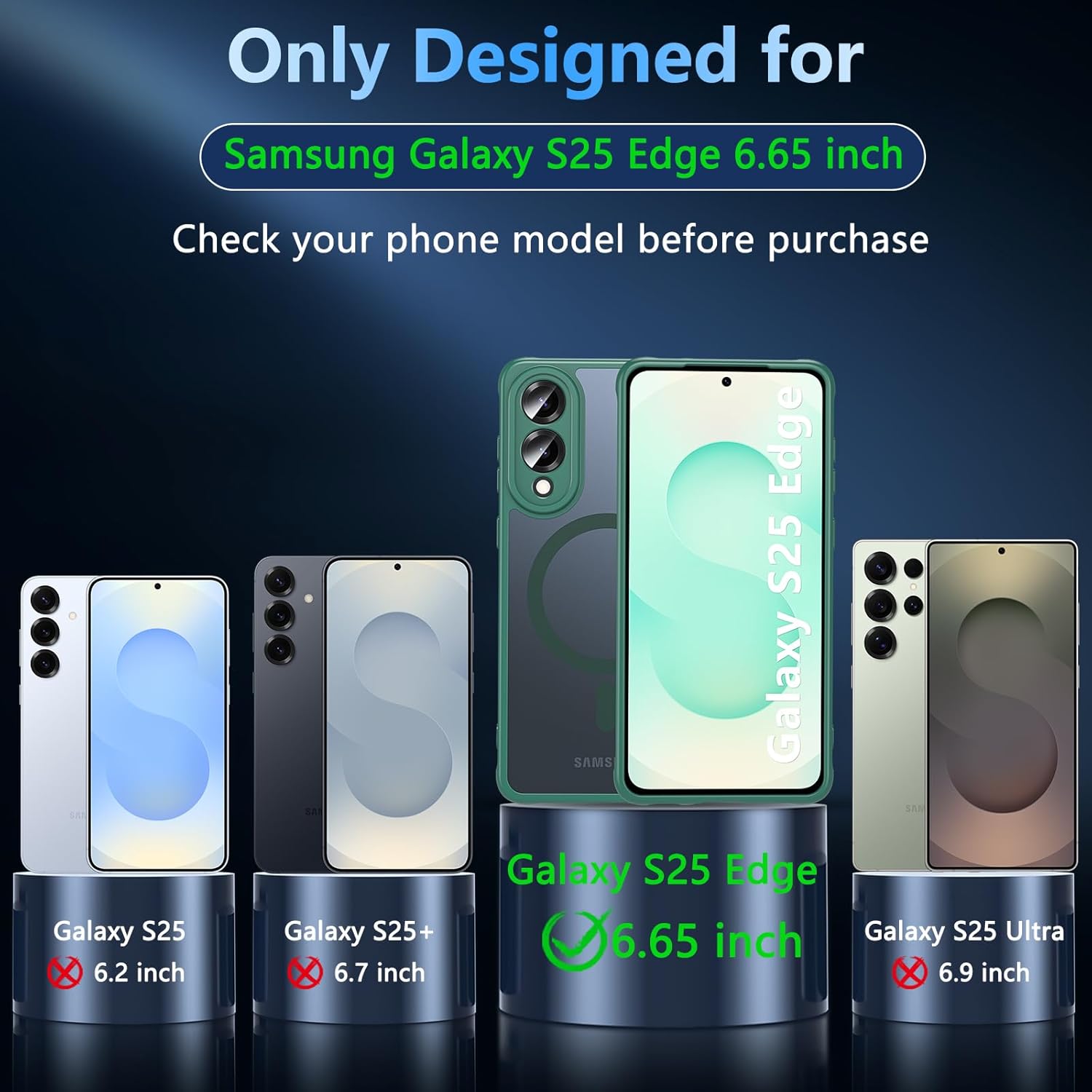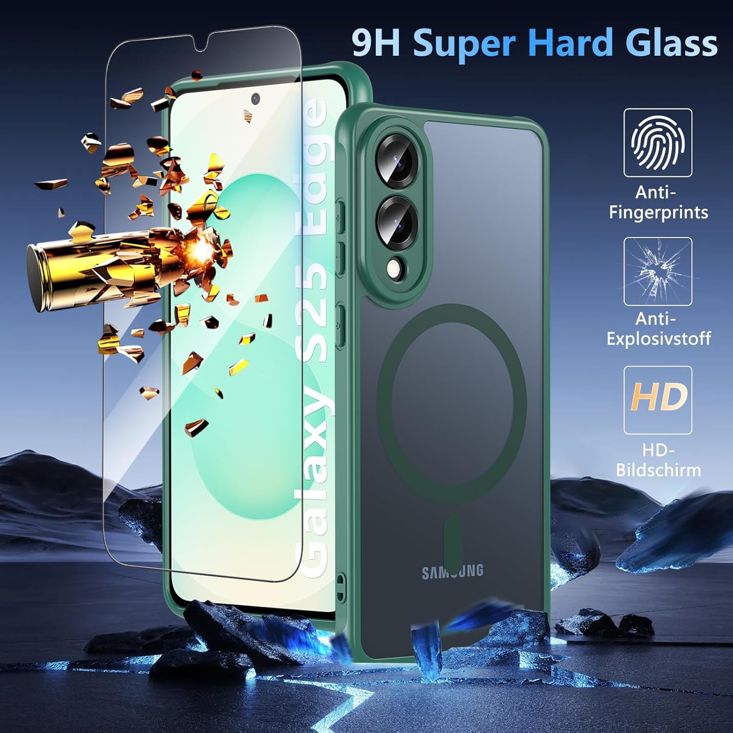 Магнитен калъф за Samsung Galaxy S25 Edge със закалено стъкло, военна защита, калъф за мобилен телефон за S25 Edge с MagSafe матово полупрозрачно защитно фолио, защитен калъф за Samsung S25