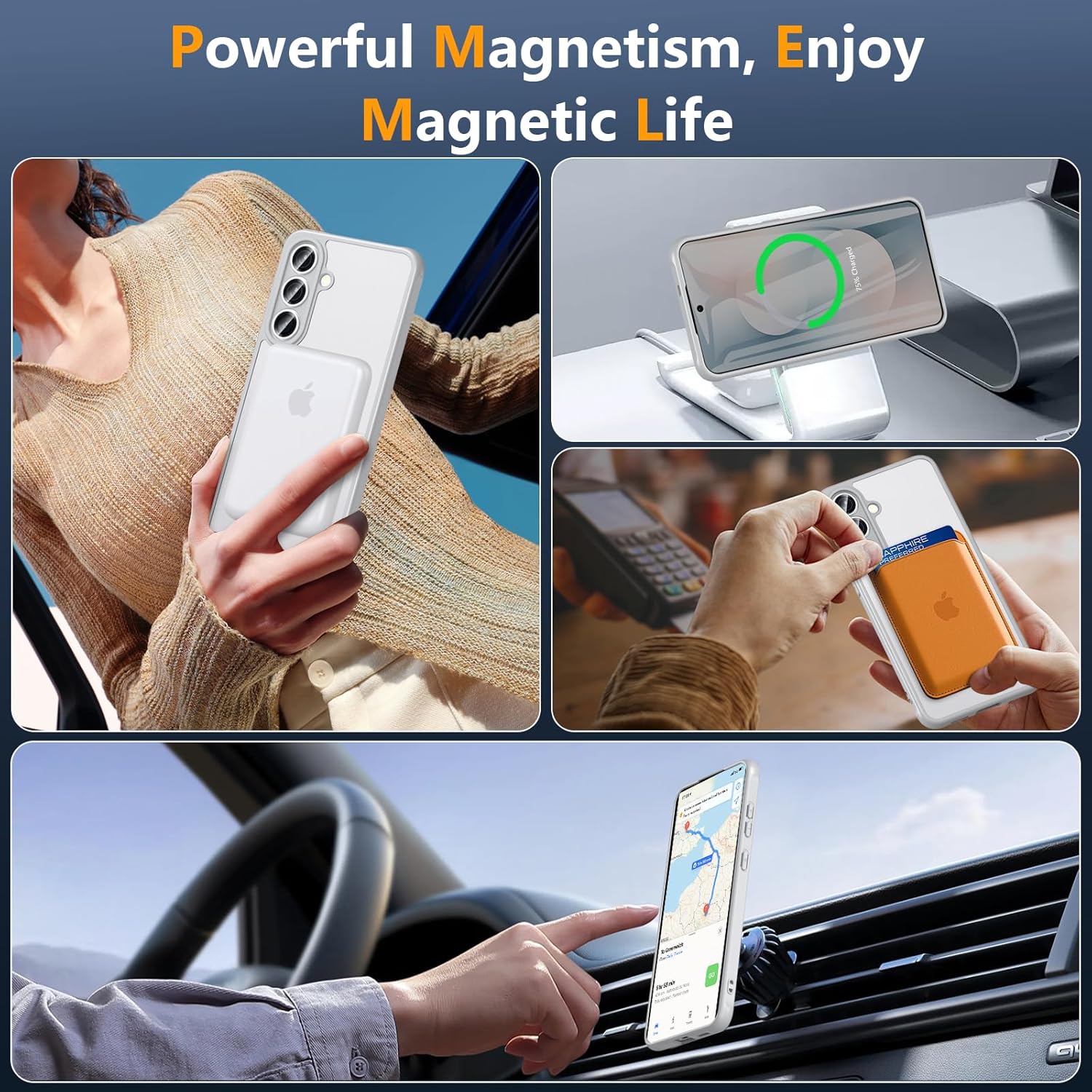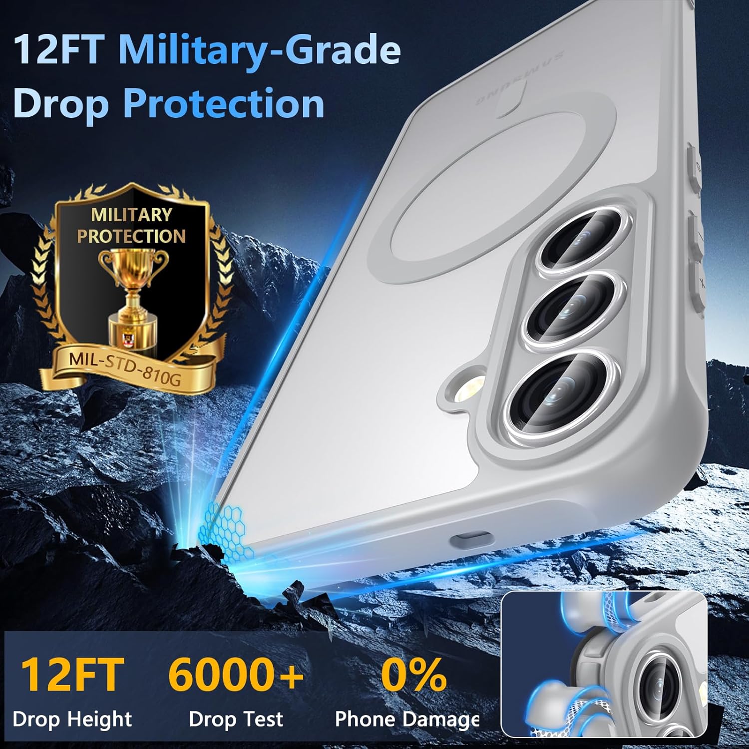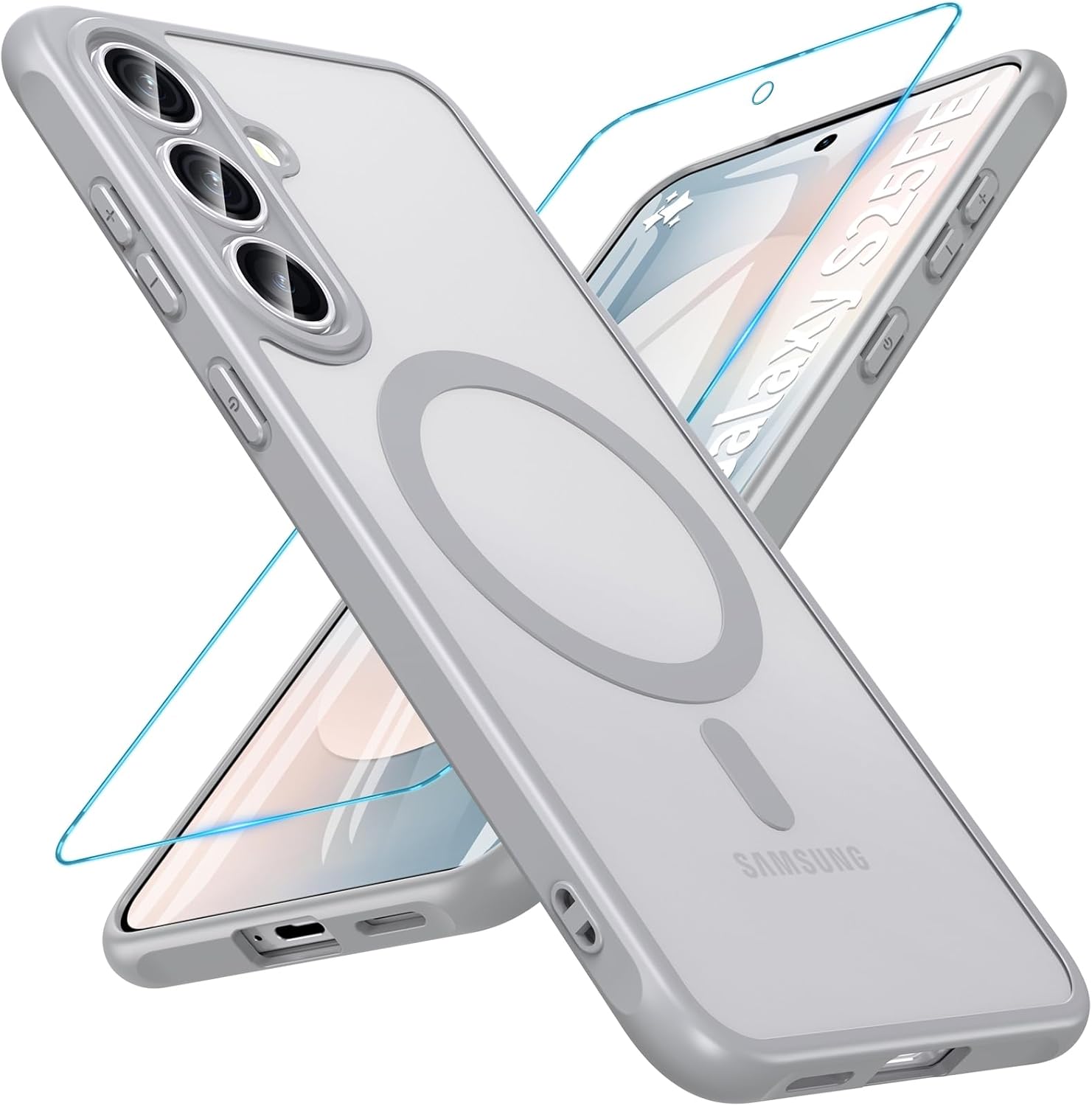 Магнитен калъф за Samsung Galaxy S25 FE със закалено стъкло, военна защита, калъф за мобилен телефон за S25 FE с MagSafe матово, полупрозрачно, здраво защитно фолио, защитен калъф за Samsung S25