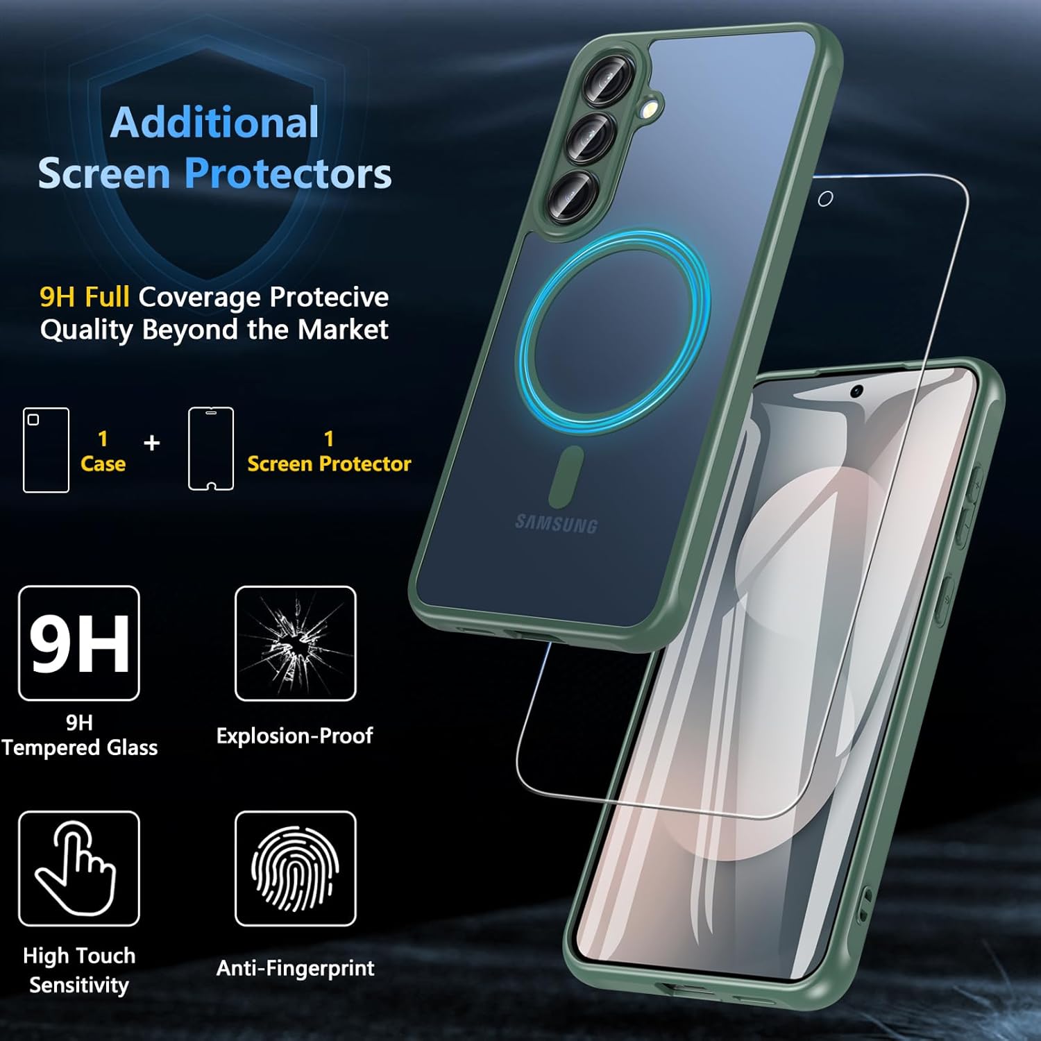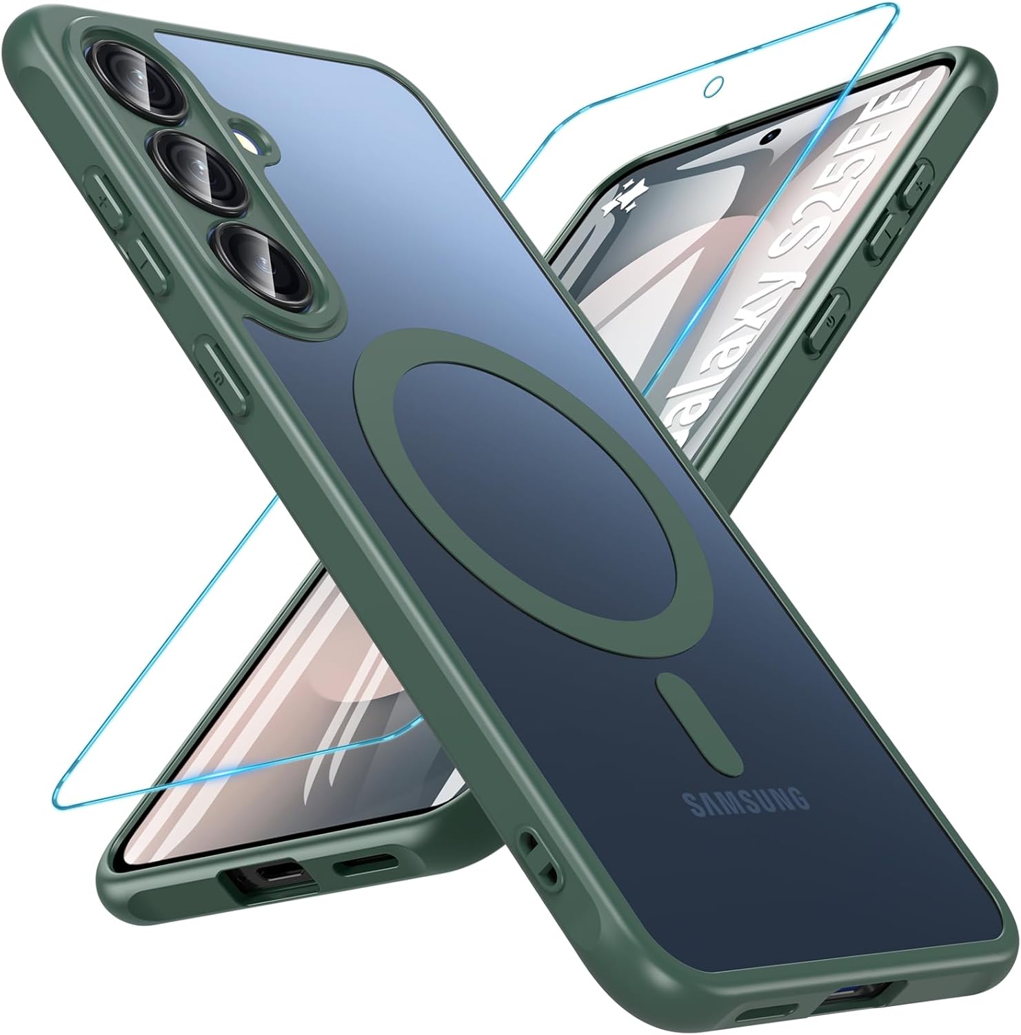 Магнитен калъф за Samsung Galaxy S25 FE със закалено стъкло, военна защита за мобилен телефон за S25 FE, здрав защитен филм, защитен калъф за Samsung S25 FE (зелен)