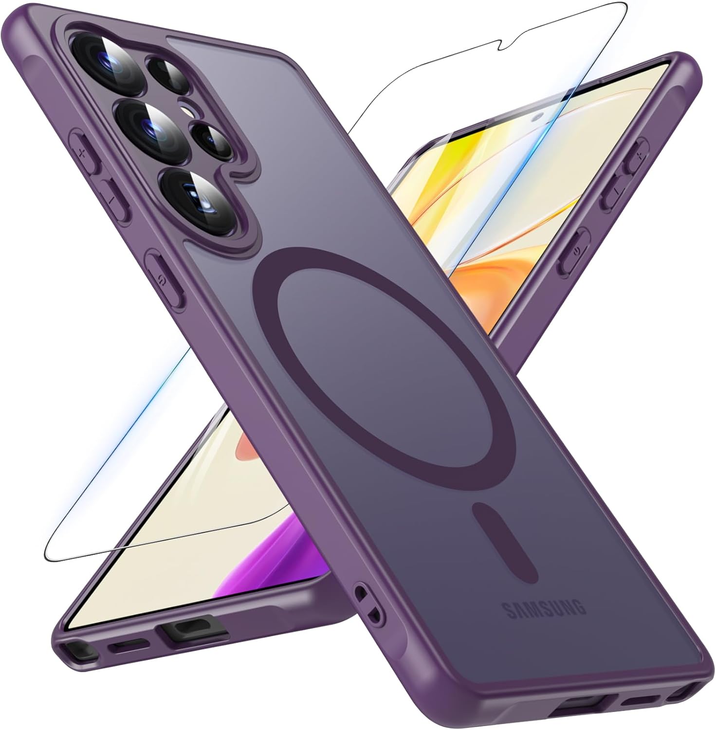 Магнитен калъф за Samsung Galaxy S25 Ultra със закалено стъкло, военна защита, калъф за мобилен телефон S25 Ultra с MagSafe матов прозрачен протектор за екрана, защитен калъф за Samsung S25