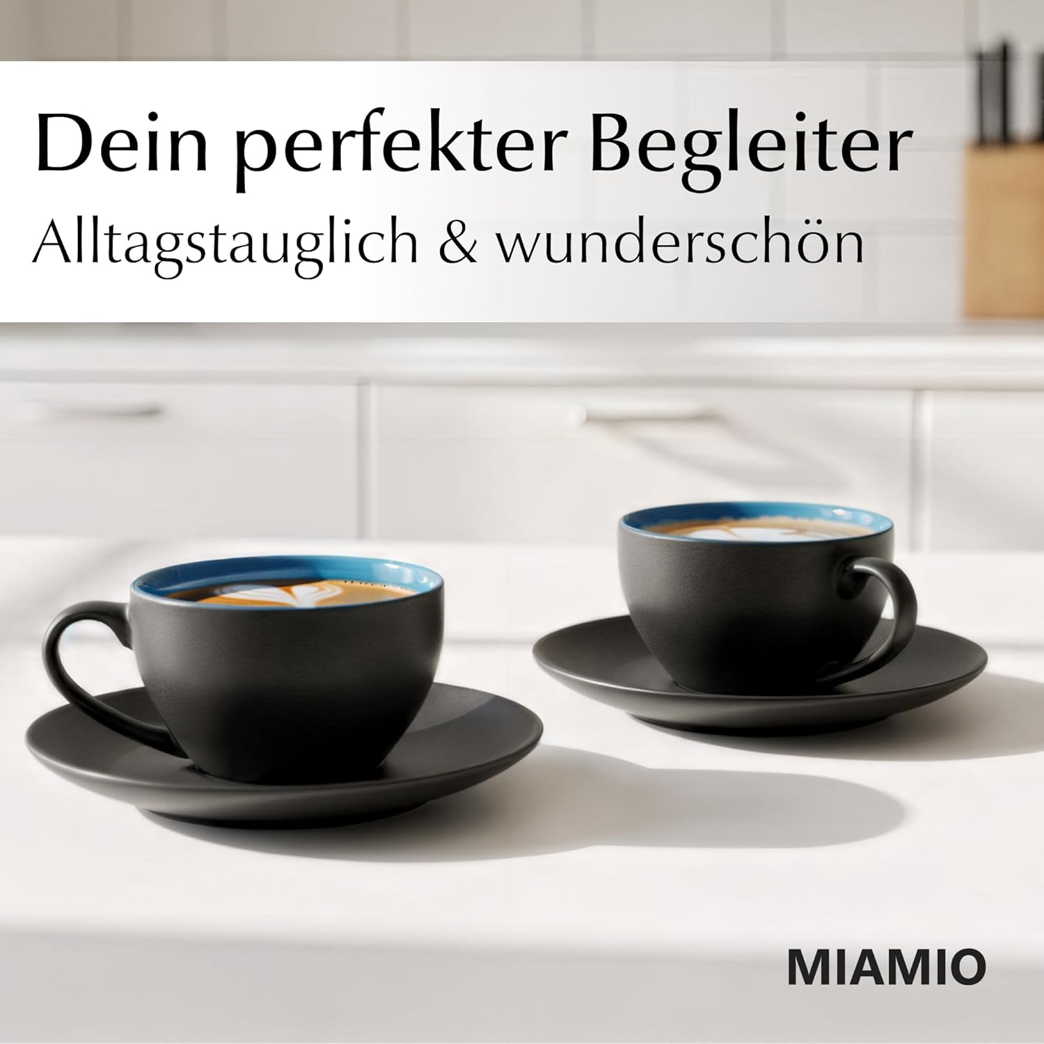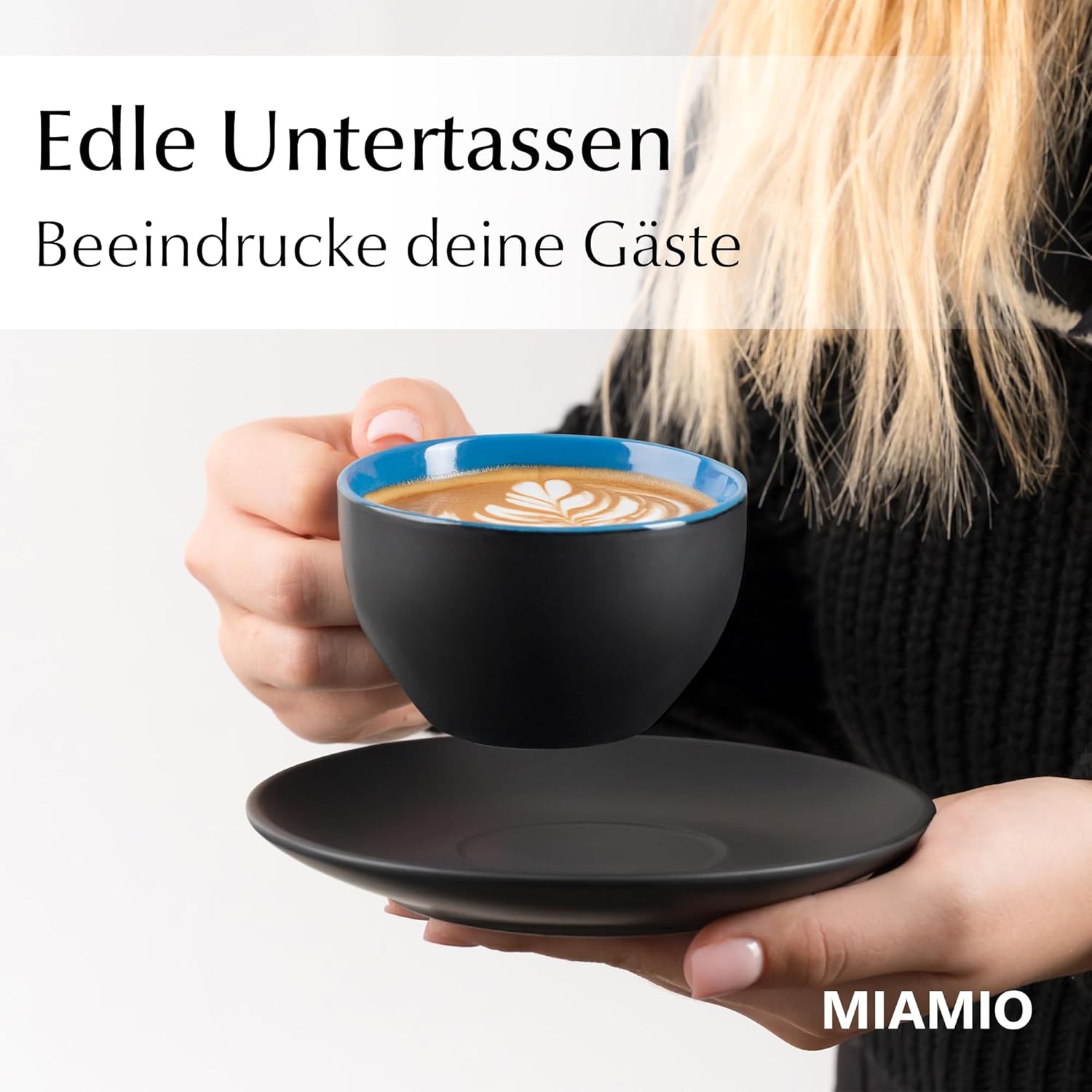 • Капучино преживяване – С чаши MIAMIO всяко капучино е преживяване. Модерният, матово черен екстериор придава на цветните чаши елегантен и висококачествен вид. Вътре, лъскавият им, ярък цвят предлага красива, цветна изненада. Включена е и стойка, която ви позволява да изложите нашите чаши за капучино в кухнята си.