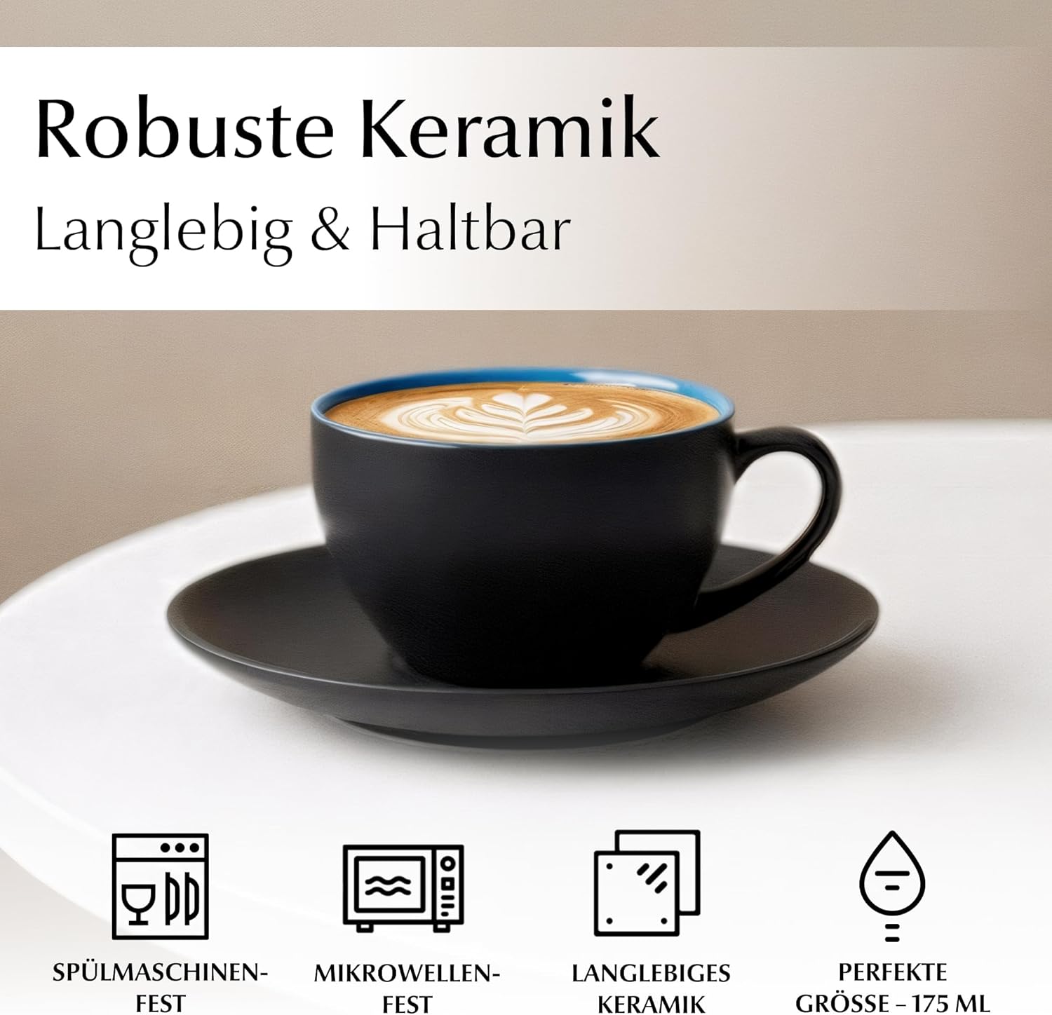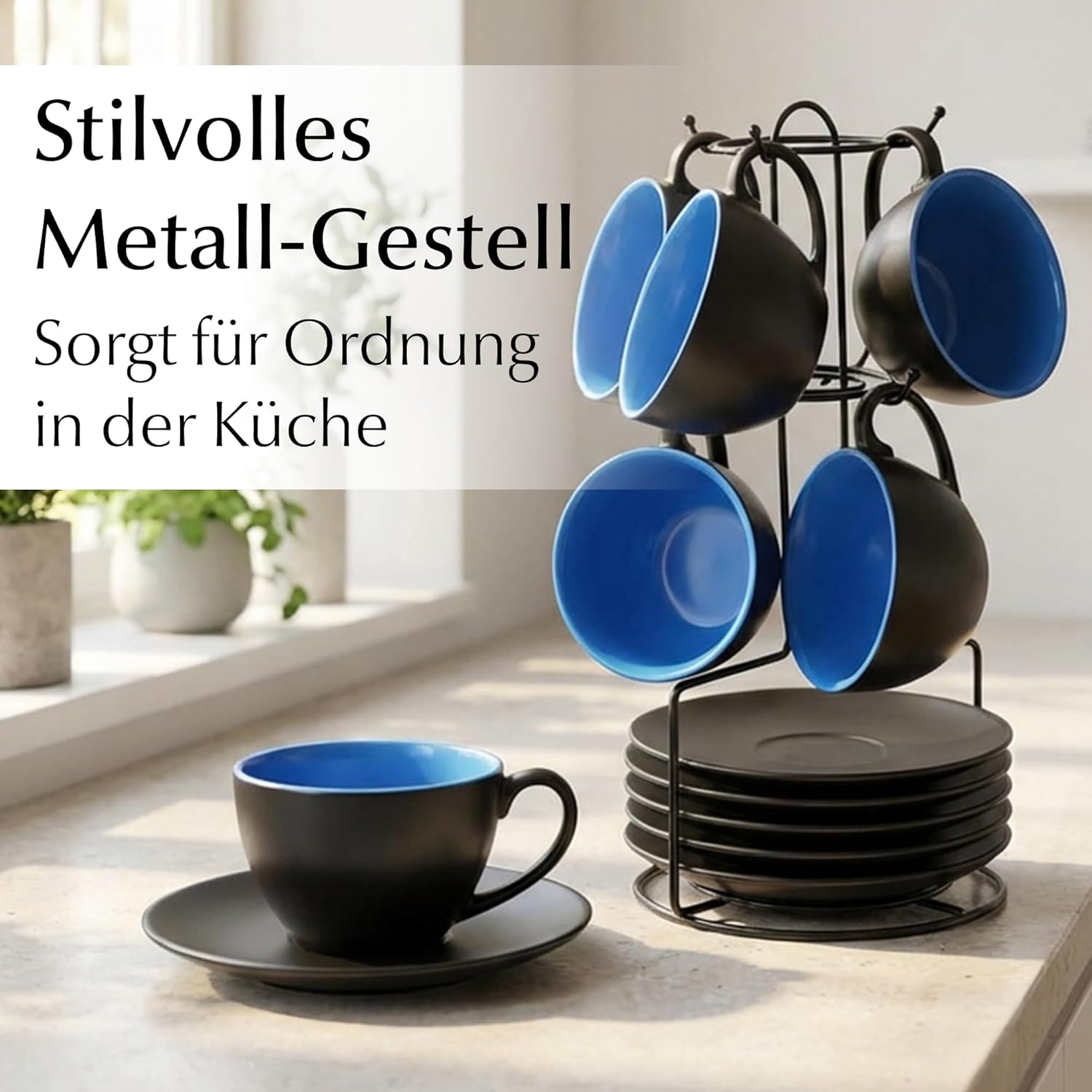• ВИСОКОКАЧЕСТВЕНИ чаши за капучино – Висококачествената изработка на керамика прави цветовете на чашите наистина да се открояват. Изключителната издръжливост на нашите керамични чаши гарантира дълготрайно превъзходно качество. Комплектът чаши за капучино включва и шест първокласни чинийки, които пасват идеално на включената стойка.