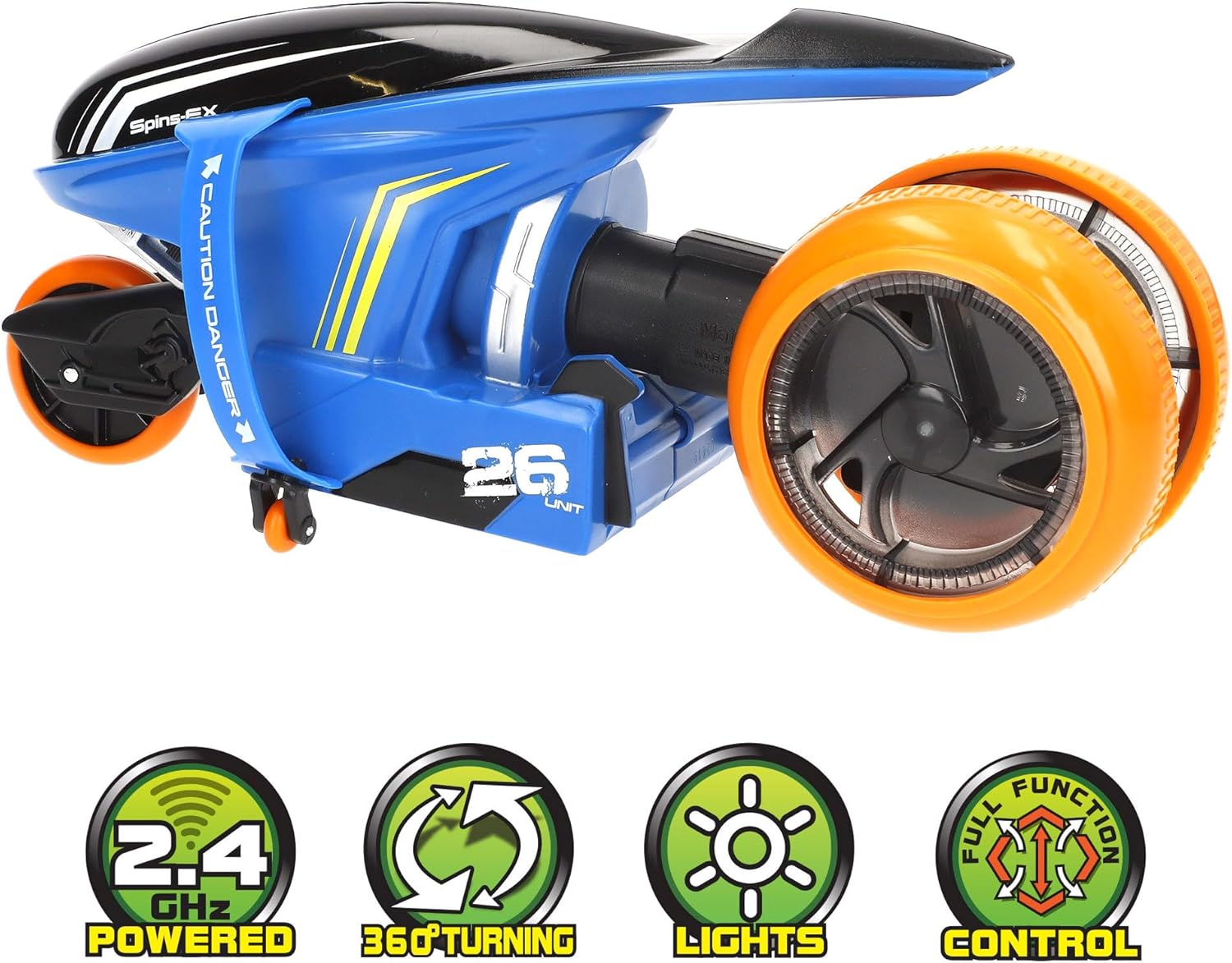 • Това е футуристичен RC мотоциклет с невероятно 360-градусово въртене; вижте как задните колела се въртят, докато светят и променят цвета си благодарение на LED светлините.