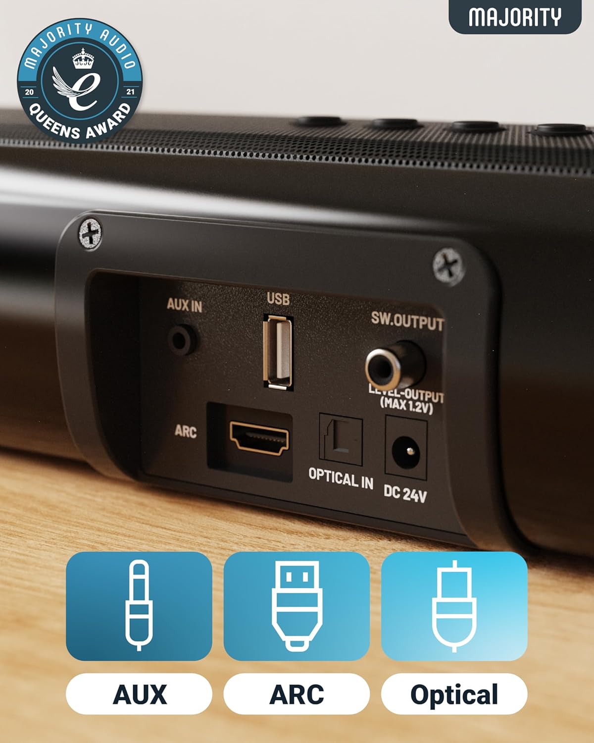 MAJORITY Naga 60 саундбар за телевизори, саундбар за телевизор с вграден субуфер, Bluetooth саундбар, HDMI ARC, 120 W високоговорител за телевизори, 2.1 озвучителна система с еквалайзер, саундбар за стенен монтаж