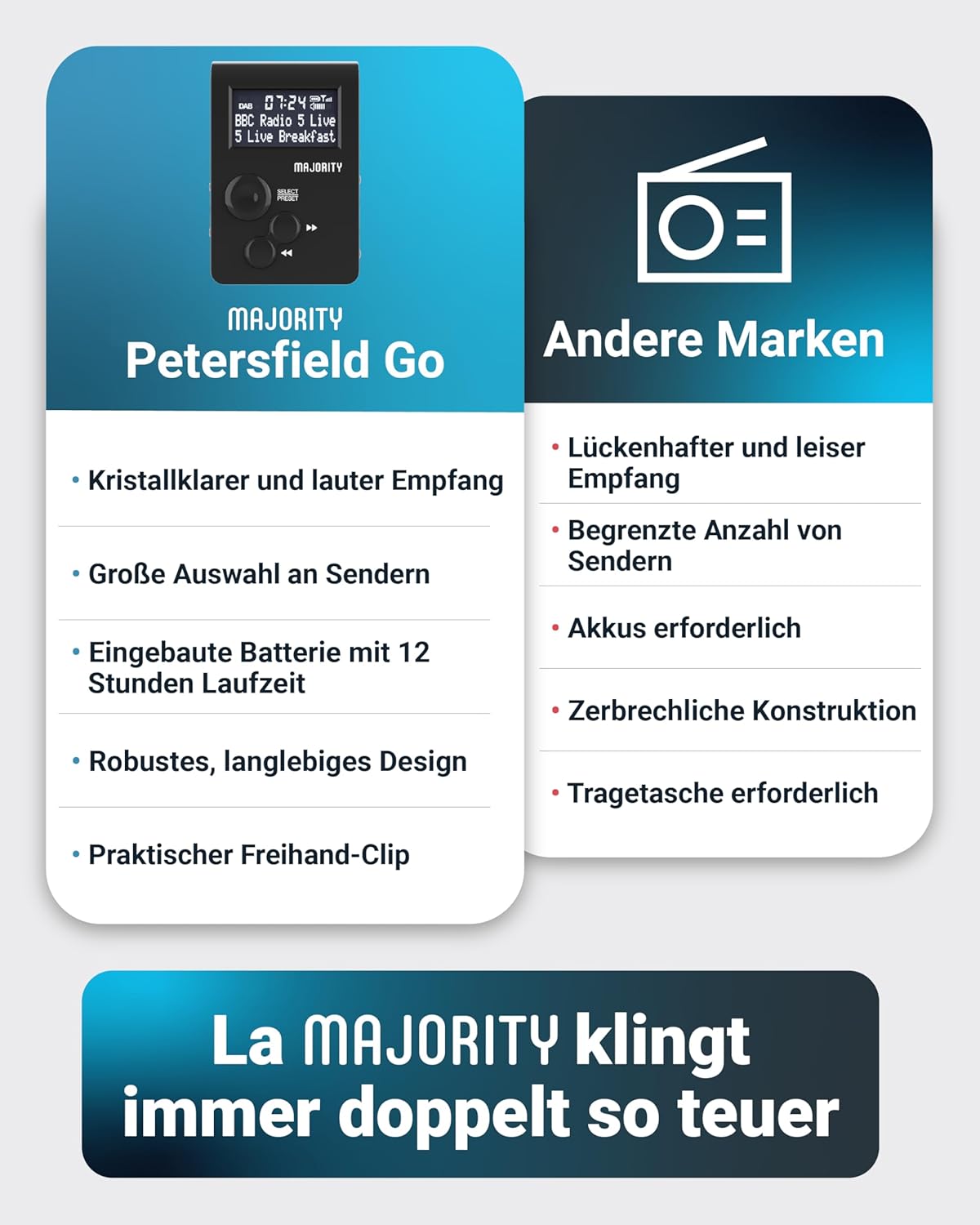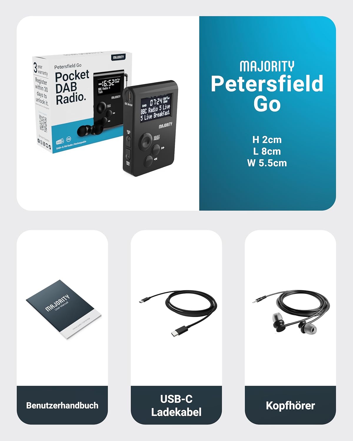Petersfield Go е част от новата активна гама преносими и презареждащи се DAB/DAB+ и FM радиостанции. С функцията за закачане на гърба на радиото можете да го закачите на дрехите си - идеално за спорт или просто за носене със себе си, когато ходите. Бутоните са заключващи се, така че можете лесно да пътувате, докато работите, ходите или бягате.