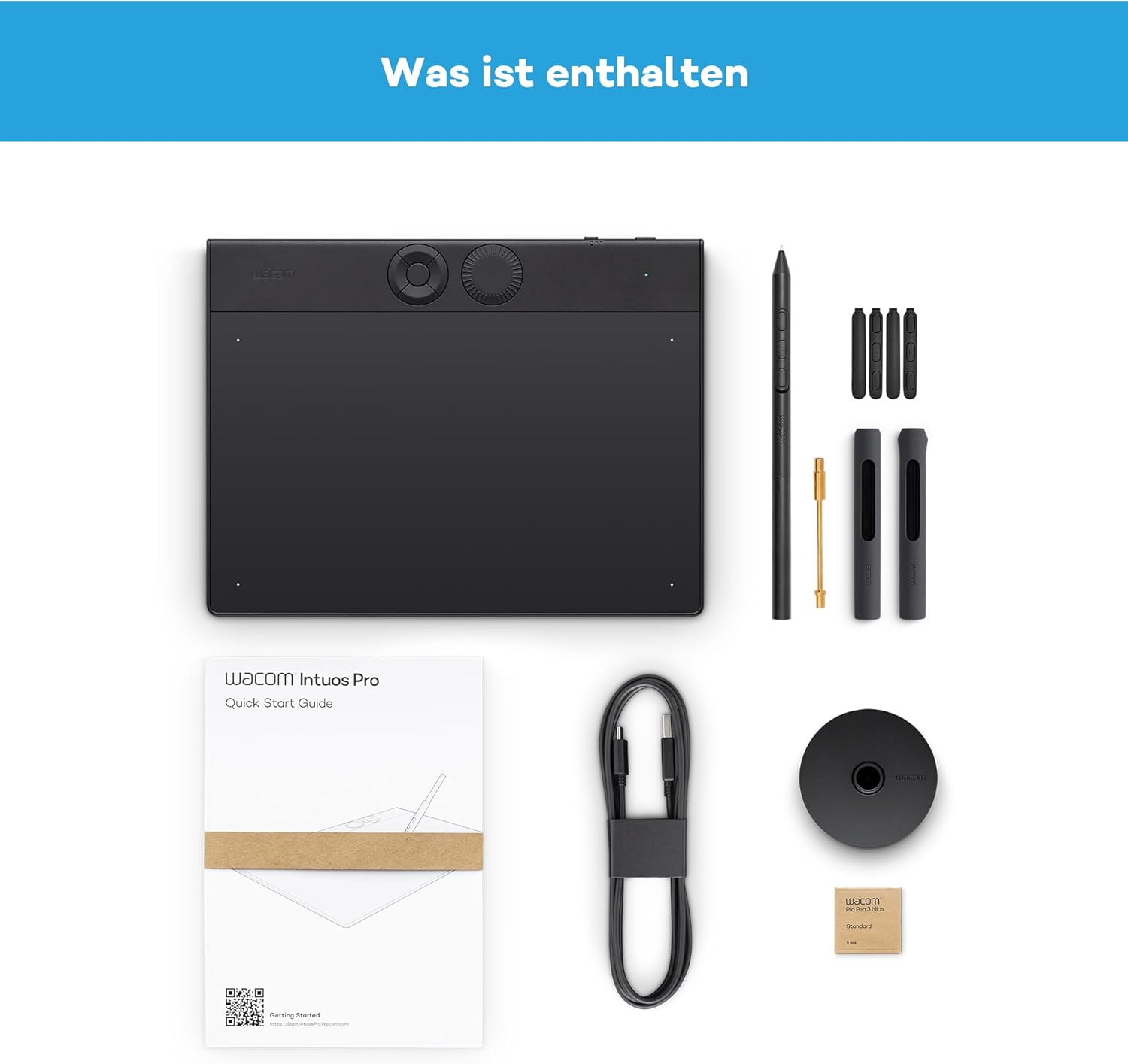 • Съдържание на пакета: Таблет с писалка Wacom Intuos Pro (291 x 206 x 4~7 мм с активна площ 263 x 148 мм); USB-C към USB-A кабел (1,8 м); Wacom Pro Pen 3; аксесоари за писалка: Прав захват, дълга странична вложка за превключватели без бутони, къса странична вложка за превключватели с бутони, къса странична вложка за превключватели без бутони; държач за писалка (с 5 стандартни, 3 филцови и 3 гумени накрайника, плюс инструмент за отстраняване на перото); ръководство за бърз старт; важна информация за продукта; гаранционна карта