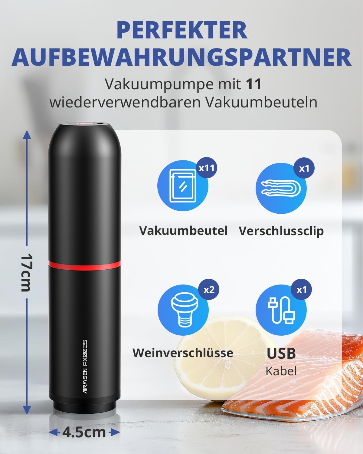 • Вакуумиране с едно щракване за лесна работа: Мини вакуумната машина AIRMSEN има компактен дизайн, което елиминира нуждата от конвенционални големи и обемисти домакински вакуумни машини и опростява стъпките на работа. Просто трябва да поставите храната в нашите специални вакуумни торбички, да насочите това преносимо устройство към вакуумния порт и да натиснете бутона, и храната ще бъде вакуумирана за няколко секунди!