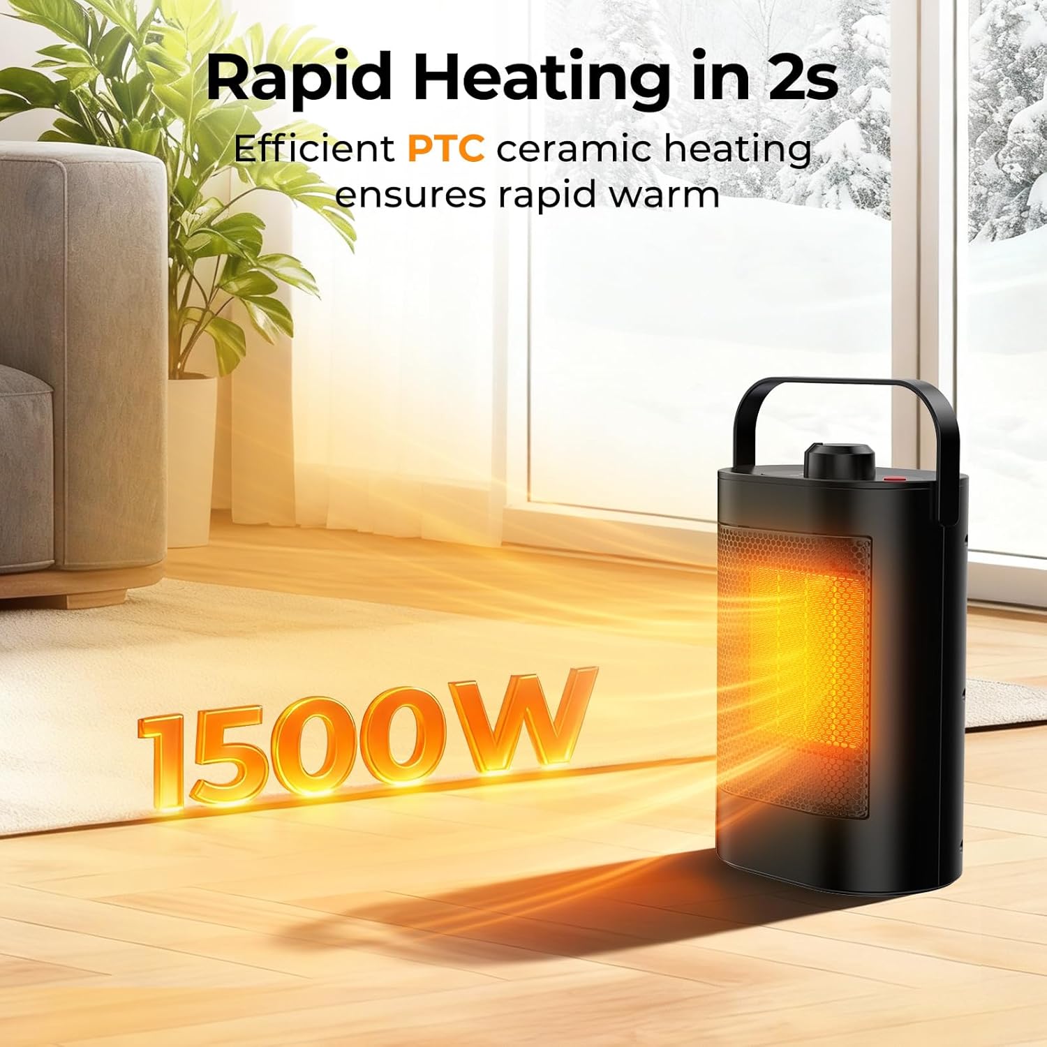 • 1500 W мощна топлина: с мощна отоплителна мощност от 1500 W, този вентилаторен отоплител осигурява бързо и ефективно разпределение на топлината в помещения до 25 м². Независимо дали сте в хола, спалнята или домашния офис - можете да се насладите на приятна топлина за нула време, без да се налага да чакате дълго време за отопление.