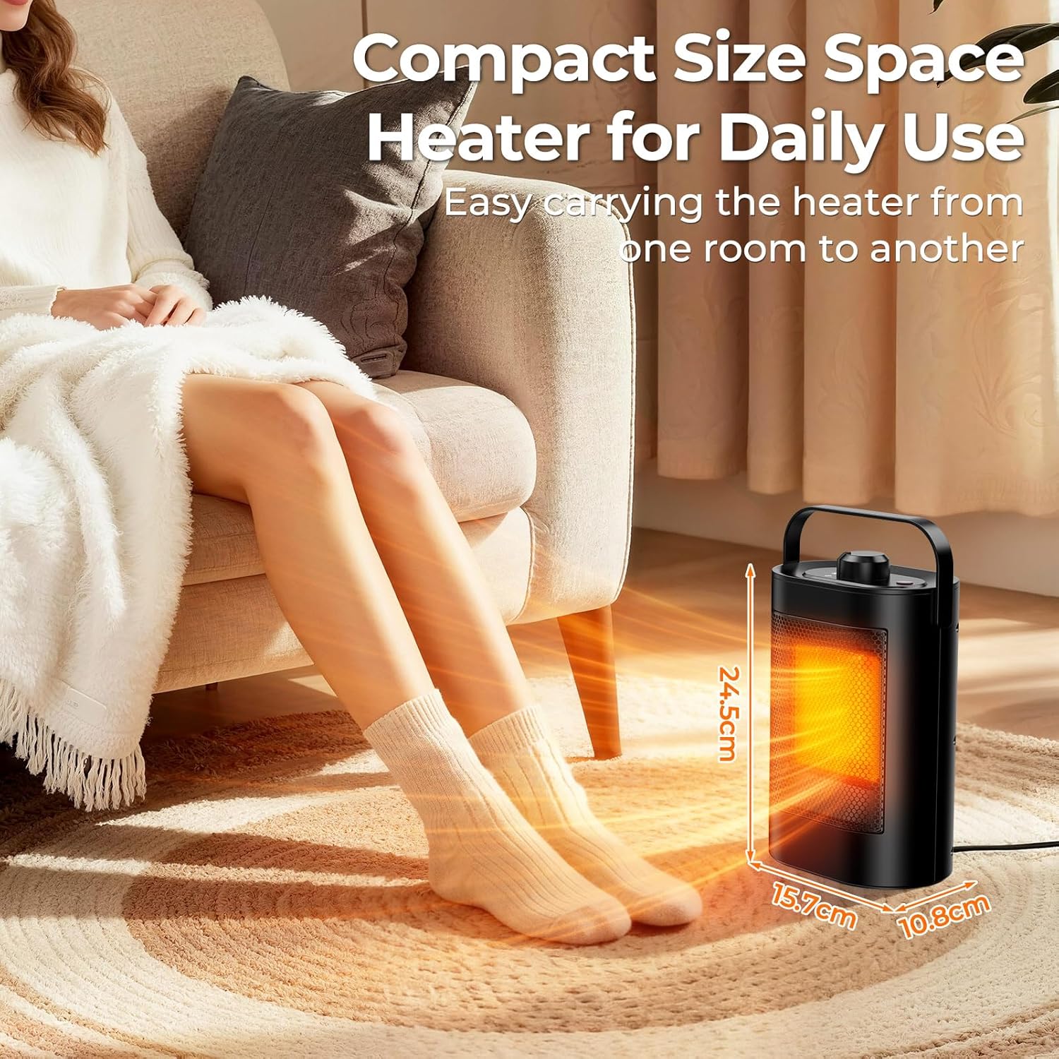 • Удобен размер и преносим дизайн: с компактния си дизайн и практична дръжка за носене, вентилаторният отоплител е лесен за носене - можете удобно да го пренасяте от една стая в друга или дори да го вземете със себе си, когато пътувате. Малкият размер позволява и пестене на място при съхранение, когато не се използва. Идеален за употреба у дома, в офиса или при пътуване.