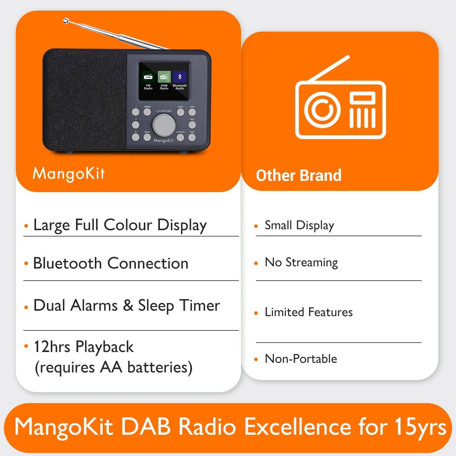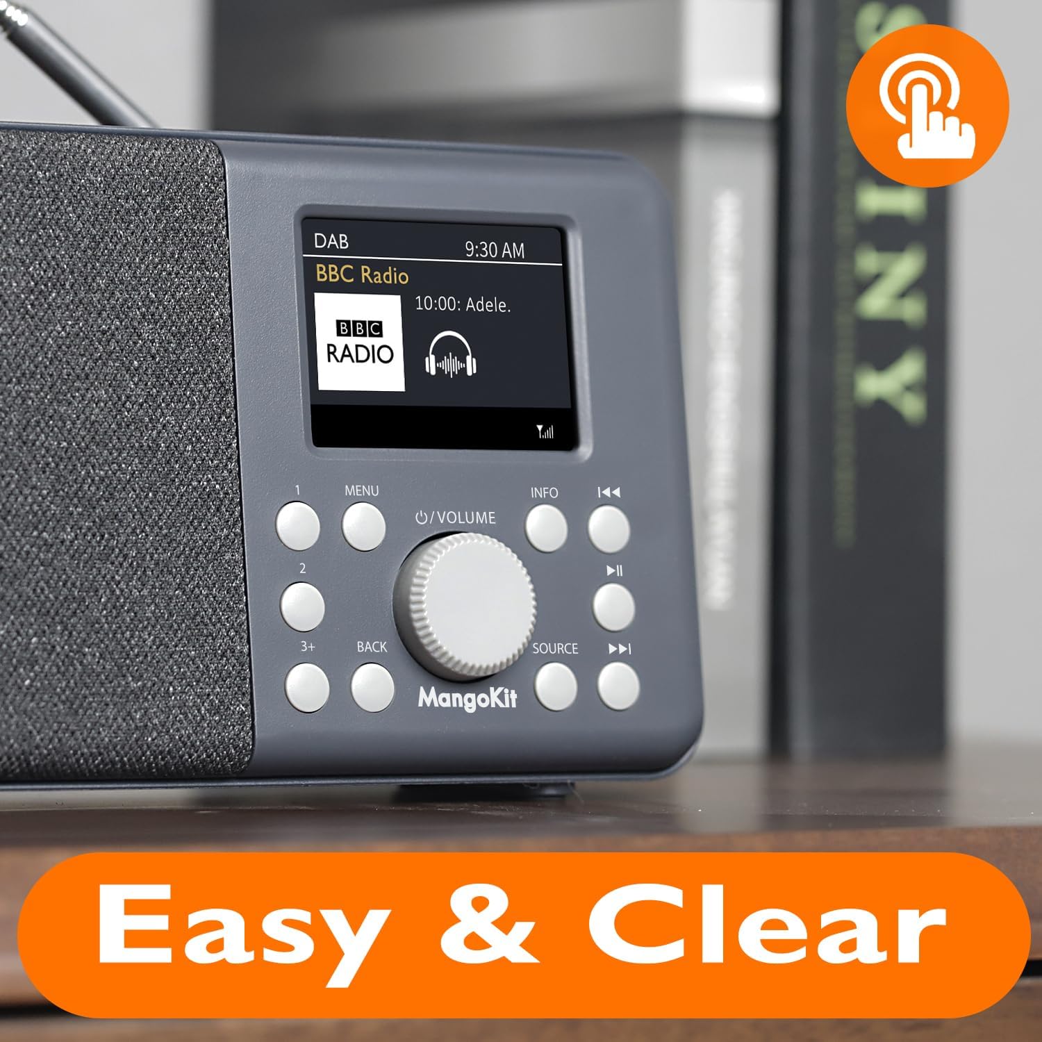 MangoKit MD3 DAB/DAB+ и FM преносимо цифрово радио, Bluetooth високоговорител, слушалки, 40 предварително зададени станции, будилник и часовник, таймер за дрямка, цветен дисплей, батерии и захранване от мрежата (тъмносиво)
