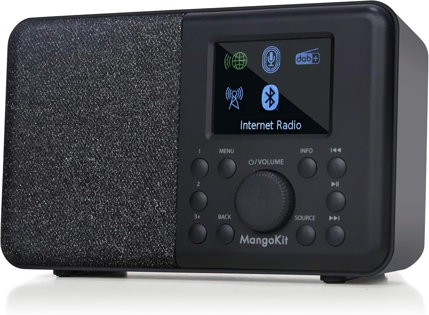 MangoKit SR10 WiFi интернет радио с DAB/DAB+, плейър за подкасти, смарт DAB радиота с Bluetooth, FM радиота, кухненско радио с работа от електрическата мрежа и с батерии, цветен дисплей, двоен будилник, предварителни настройки