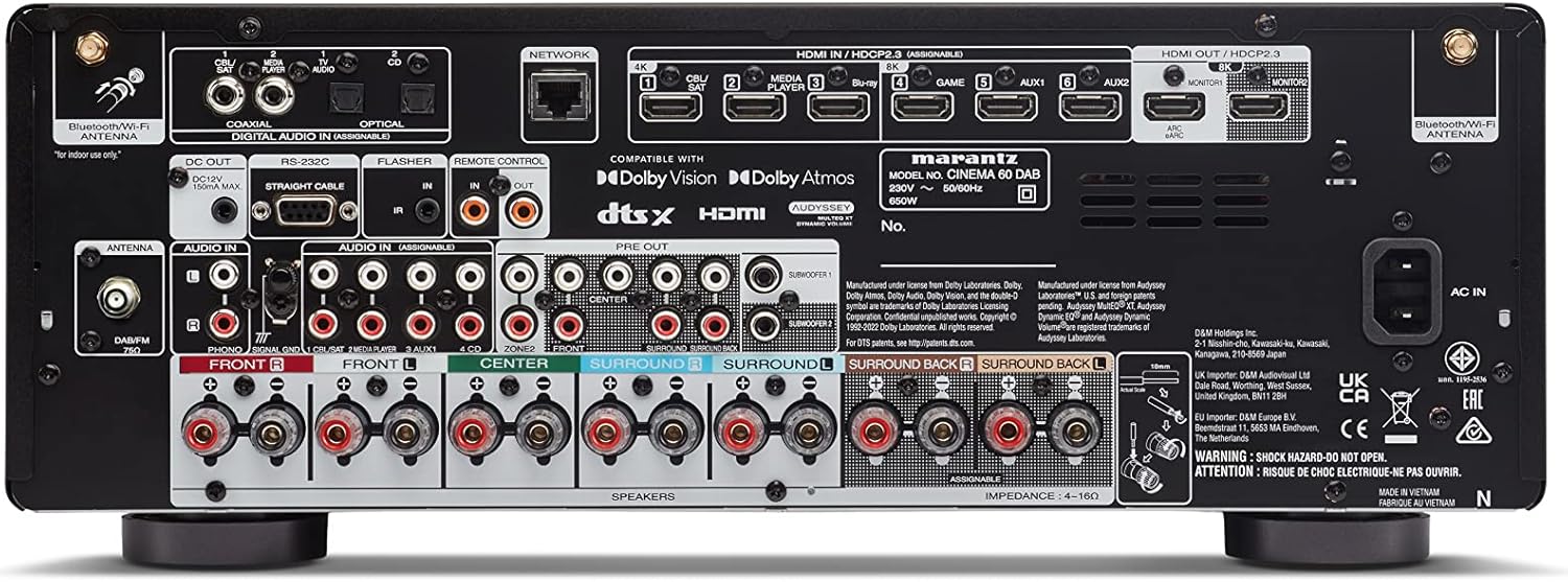 AV усилвател от серията Marantz Cinema, идеален за мощна система за домашно кино. Луксозен външен вид и качествени материали, съчетани с най-добрите звукови технологии на Marantz; съвместимост с Dolby Atmos и DTS:X, с технология за корекция на околната среда на Audissey. 8K Ultra HD и вграден HEOS стрийминг.