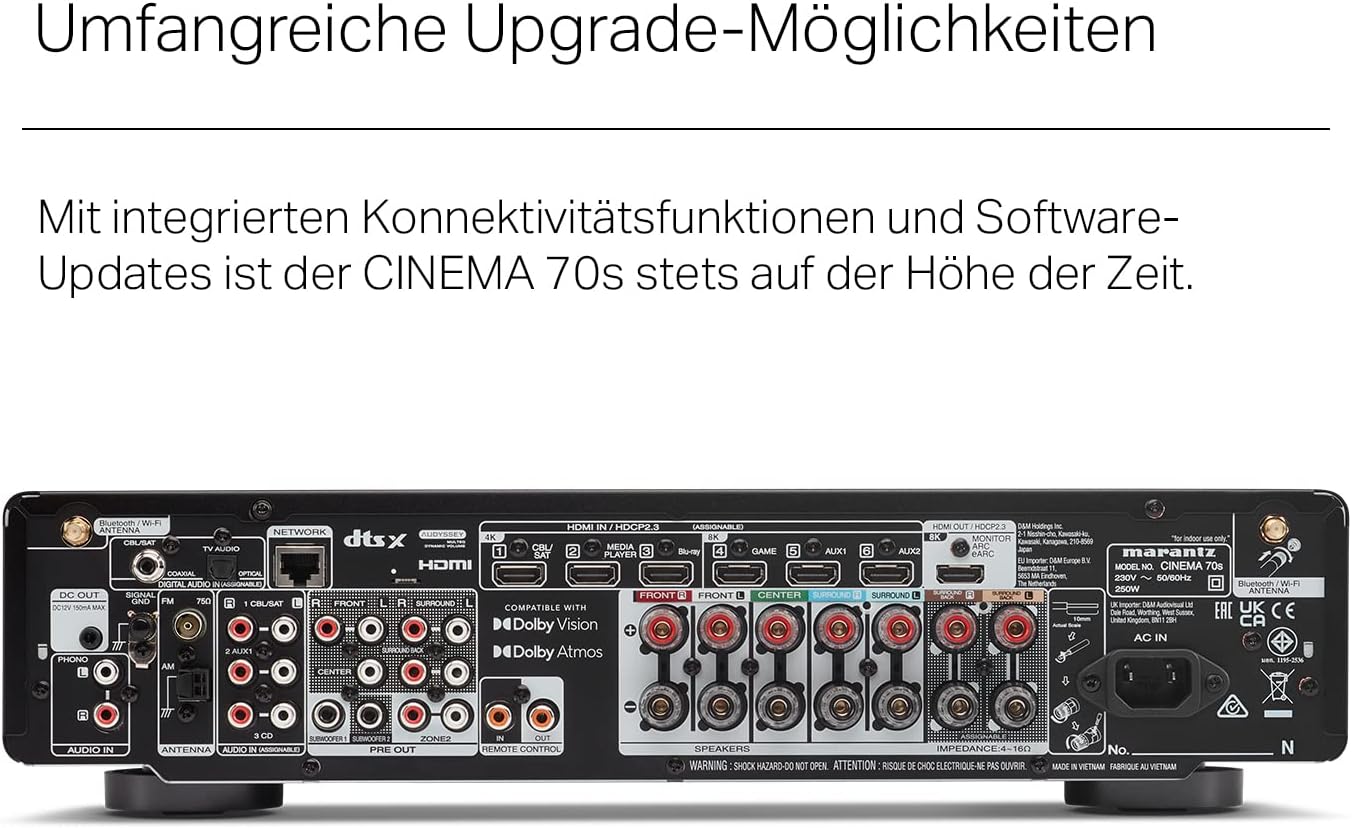 Marantz Cinema 70s 7.2 канален AV ресивър, HiFi усилвател, съвместим с Alexa, 6 HDMI входа и 1 изход, 8K видео, Bluetooth, WiFi, стрийминг на музика, Dolby Atmos, AirPlay 2, HEOS Multiroom, черен