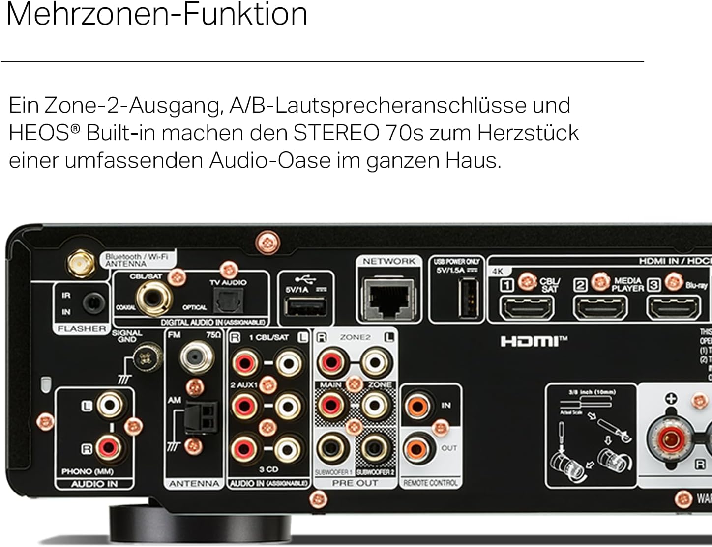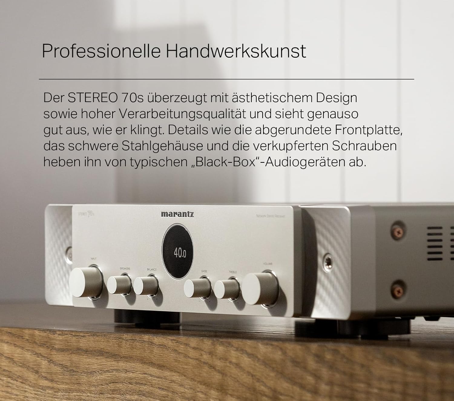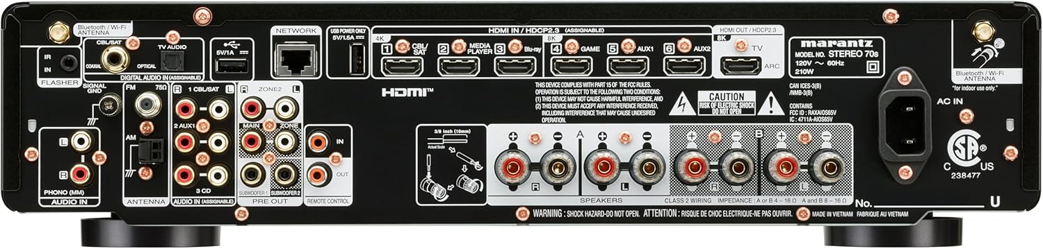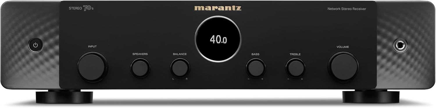 Marantz Stereo 70s е идеалният стерео приемник за меломани и любители на домашното кино, които искат да комбинират отличен звук с най-съвременни технологии и гъвкава свързаност. Елегантният му дизайн се вписва перфектно във всяка всекидневна, а легендарното качество на звука на Marantz осигурява топло, детайлно и мощно слушателско изживяване. Със 75W мощност на канал и HDAM технология, приемникът Marantz Av предлага изключителна производителност за взискателните меломани. 6 HDMI входа, включително 3x 8K порта, осигуряват бъдеща свързаност с телевизор, игрови конзоли и други източници. Благодарение на вградената HEOS технология, музиката може да се възпроизвежда безжично в множество стаи, докато AirPlay 2, Bluetooth и Wi-Fi осигуряват безпроблемни опции за стрийминг. Феновете на филмите и игрите се възползват от Dolby TrueHD, DTS HD, HDMI ARC и 4K/120Hz, VRR & ALLM, които осигуряват впечатляващо качество на картината и звука. Управлението е интуитивно чрез Amazon Alexa, Google Assistant или Apple Siri. С Marantz Stereo 70s можете да се насладите на първокласен HiFi звук, комбиниран с най-съвременни технологии - идеален за музика, телевизия и игри.