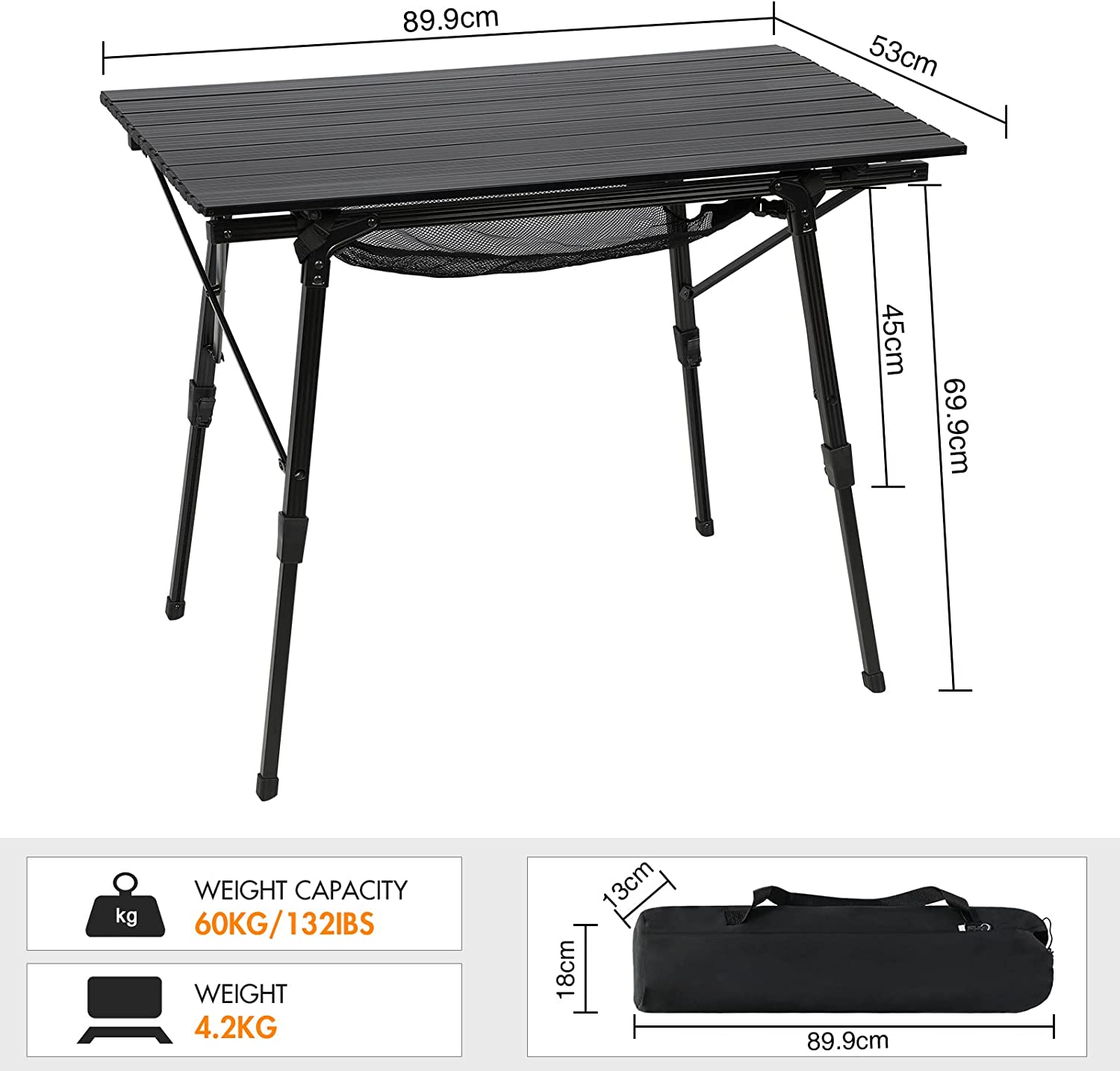 • Сгъваема къмпинг маса има 4 регулируеми на височина крака за маса. Можете свободно да регулирате височините от 45 см до 69.9 см, за да ги адаптирате към неравни повърхности и да отговаряте на всички изисквания за къмпинг приключения.