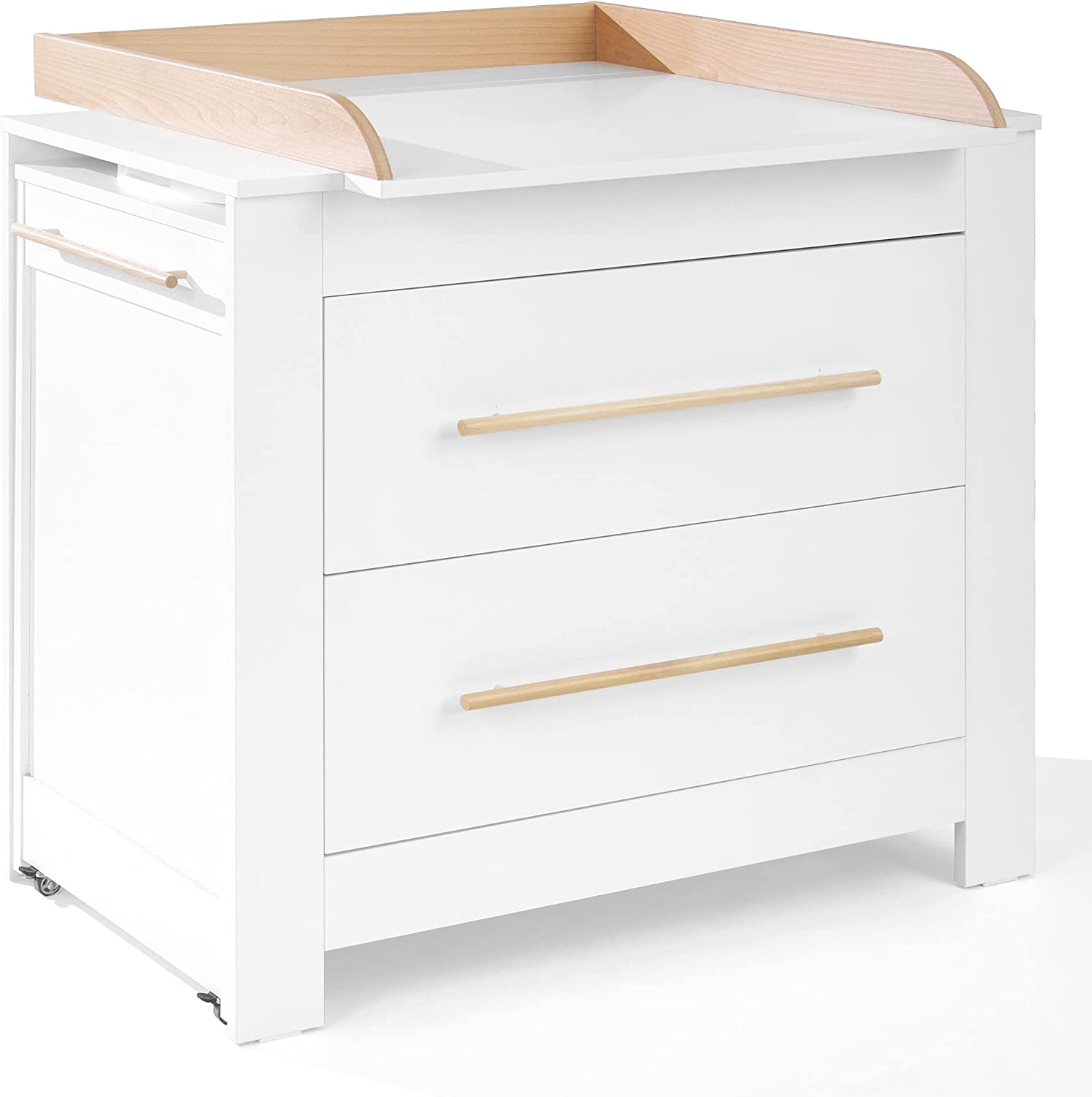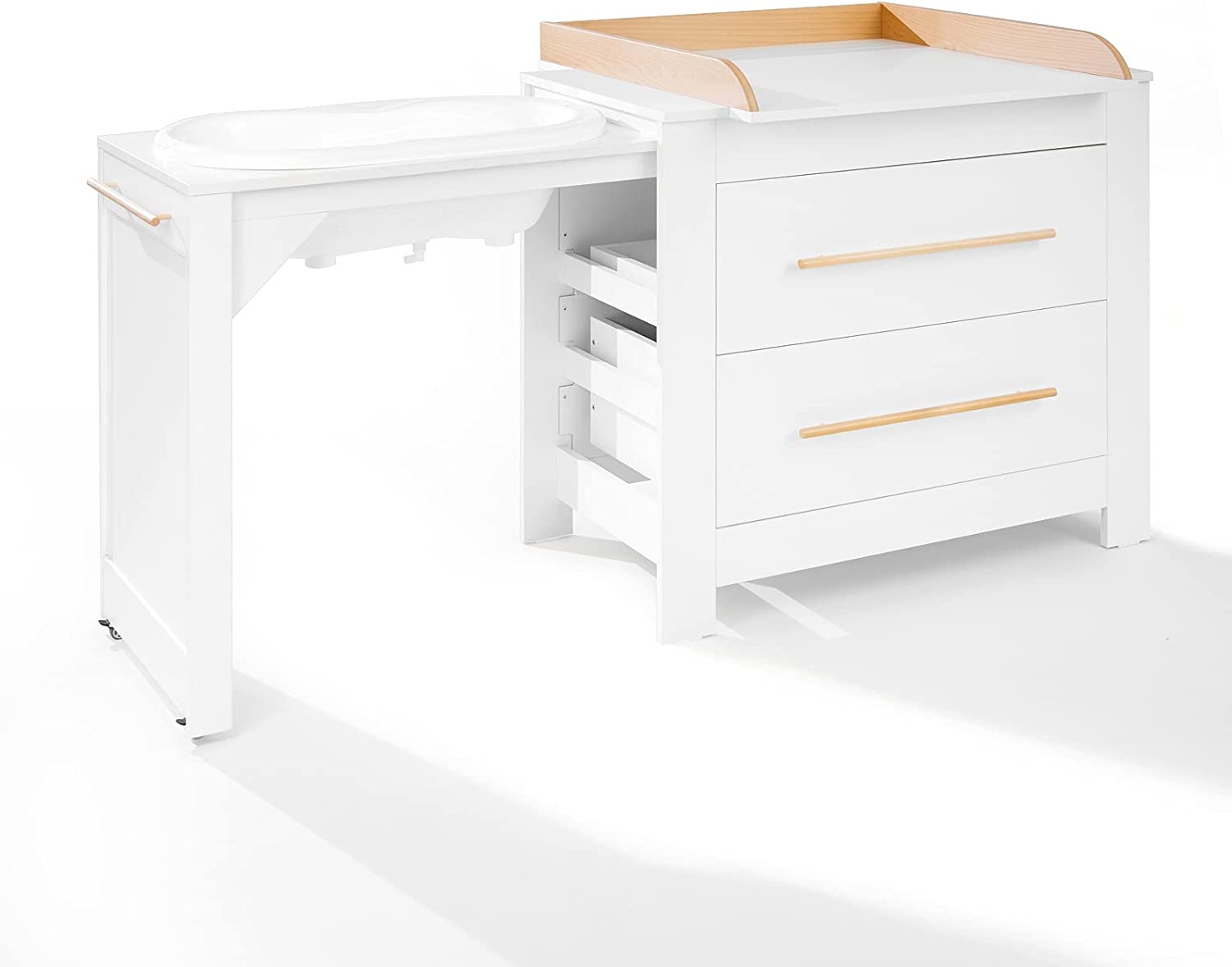 • Масата за повиване с вана е изключително удобна за използване благодарение на интелигентния си дизайн. В рафта е вградена разтегателна вана на колела с оттичане. След къпане кофата просто се прибира и водата се изпразва през маркуч. Ваната и масата за повиване също могат да бъдат заменени с допълнителна чиния, която предлага много място за играчки или дрехи.