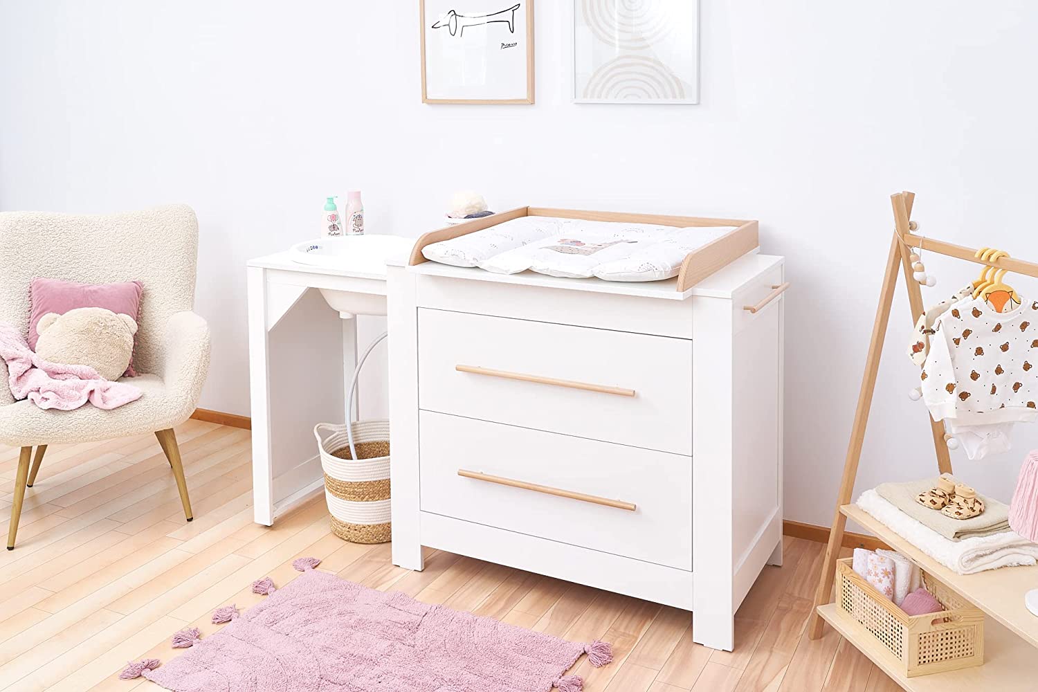 Маса за повиване ATB, 2в1, Свободностояща, Дървена, Странични релси, Подложка, Шкафове за съхранение, Опция вана, Бяла
