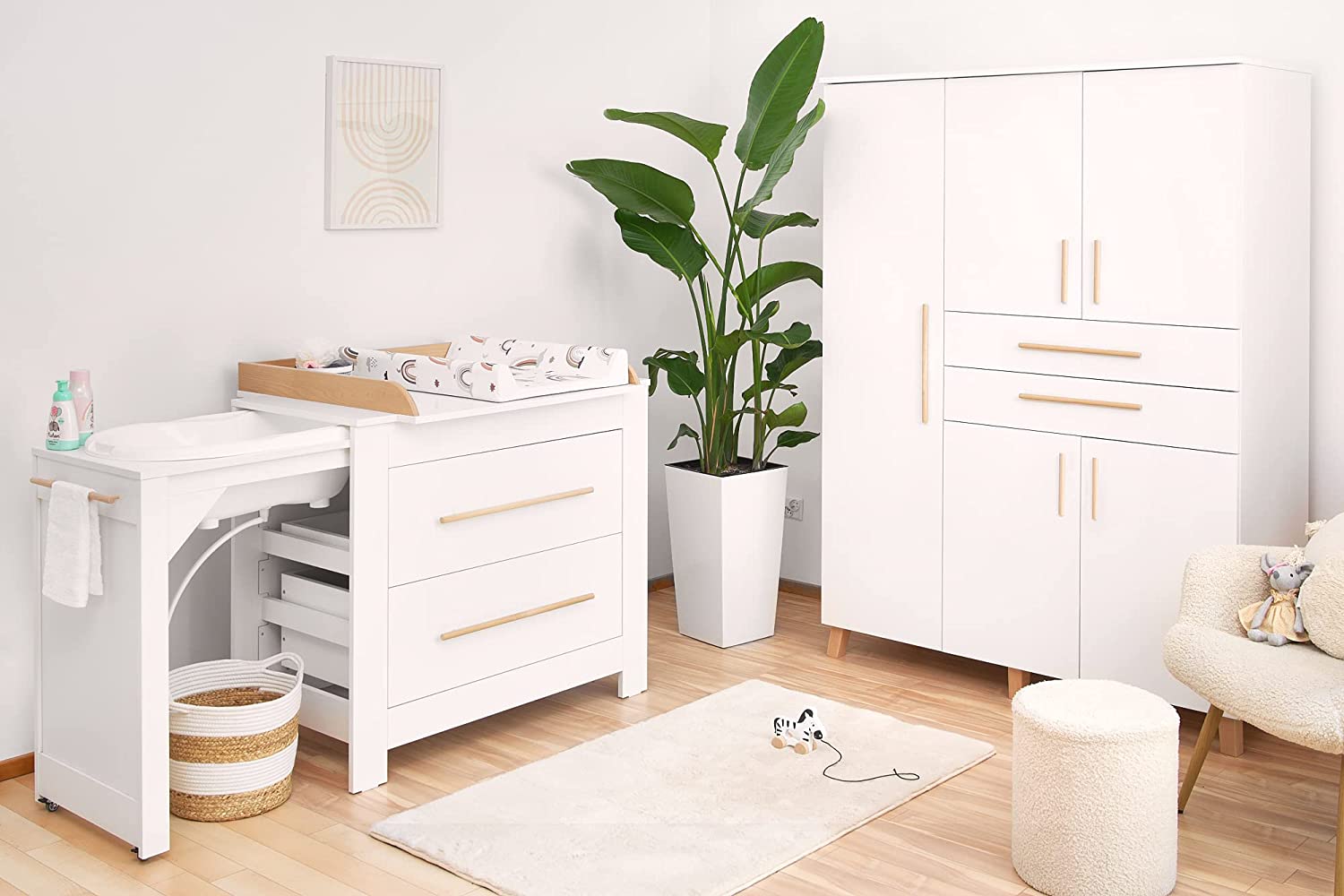 • Тази маса за повиване е проектирана с мисъл за гъвкавост и функционалност. Може да се използва като вана, маса за повиване и скрин. Така че имате всичко необходимо за пране и преобличане винаги под ръка и можете да извършвате всички дейности около бебето си на едно място.