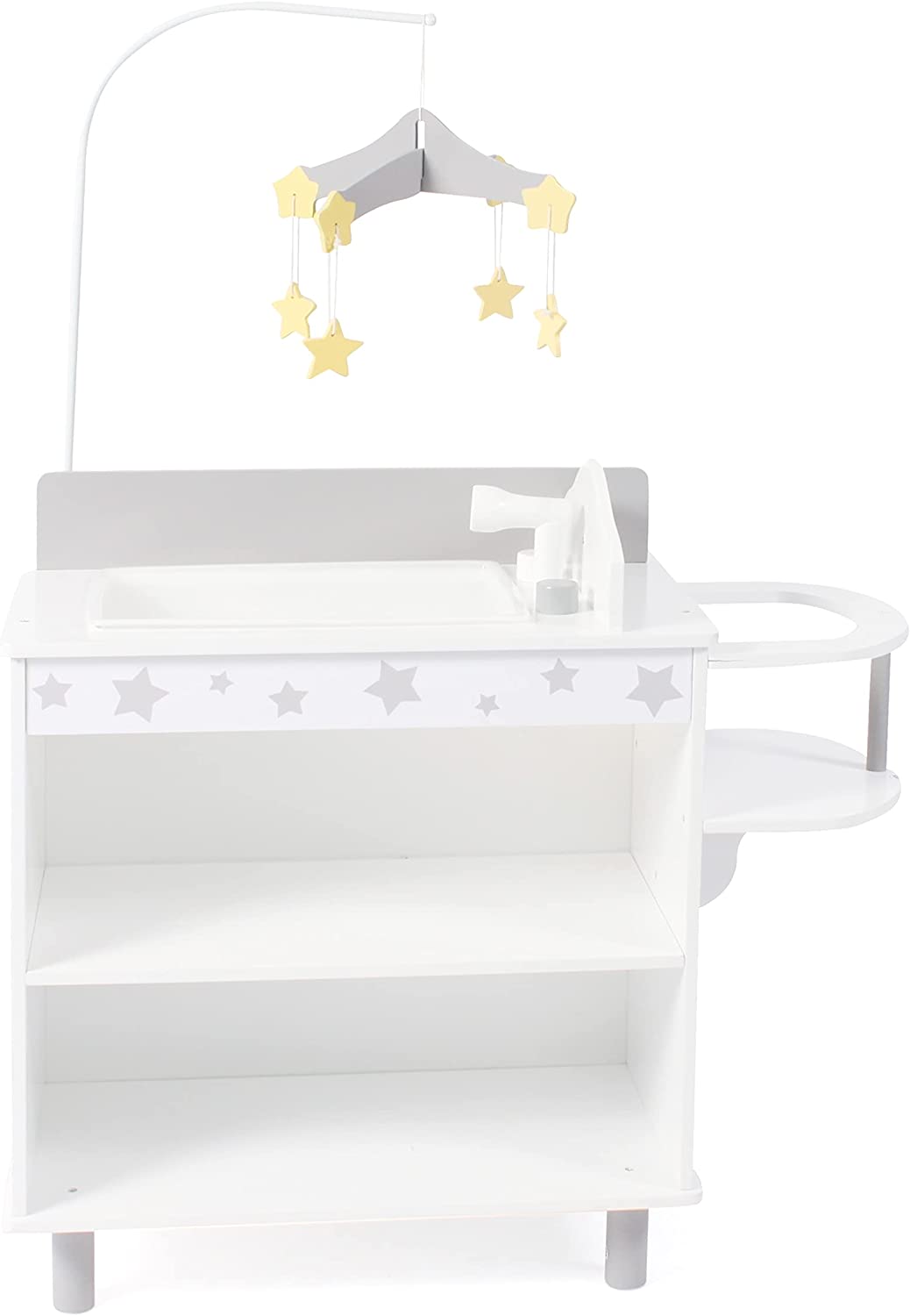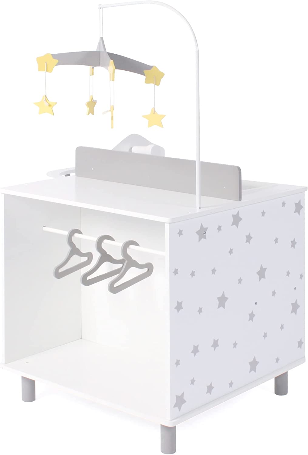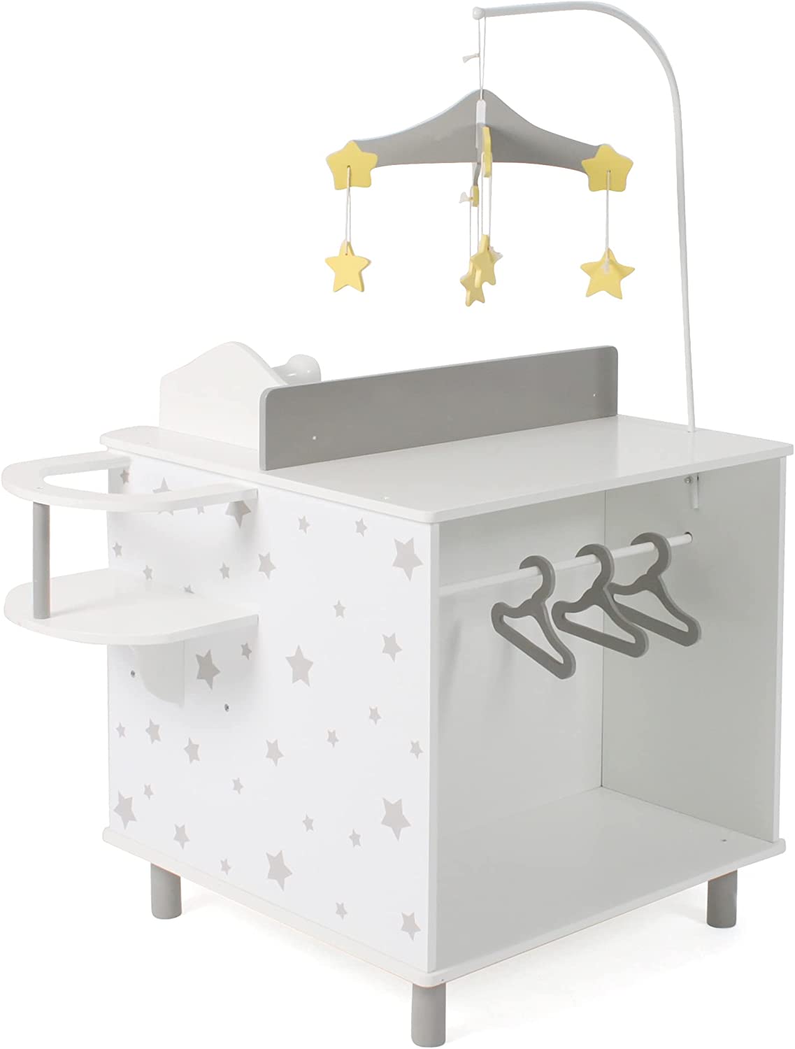 • Включва маса за повиване с отделения за съхранение, стол за хранене, мивка за баня и гардероб, включително 3 закачалки и мобилен телефон.