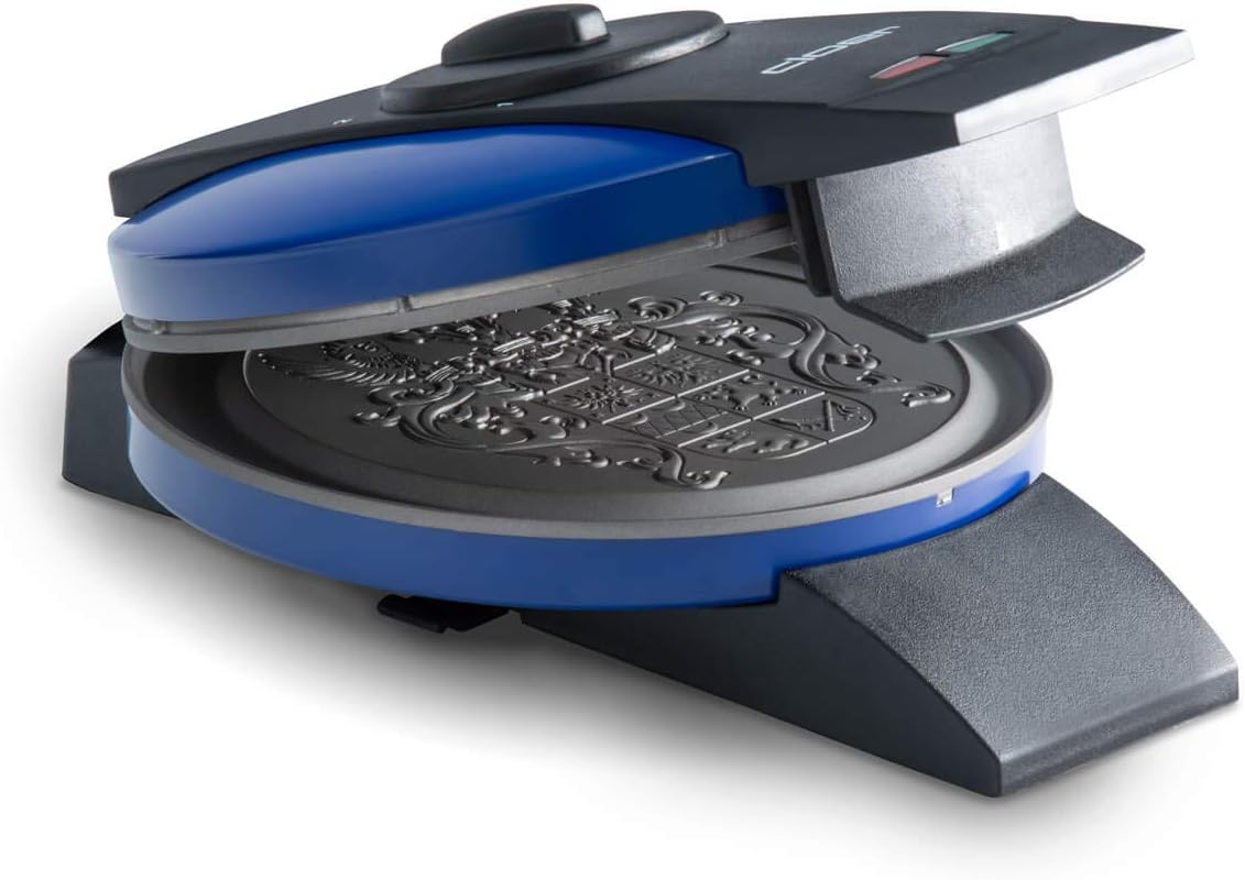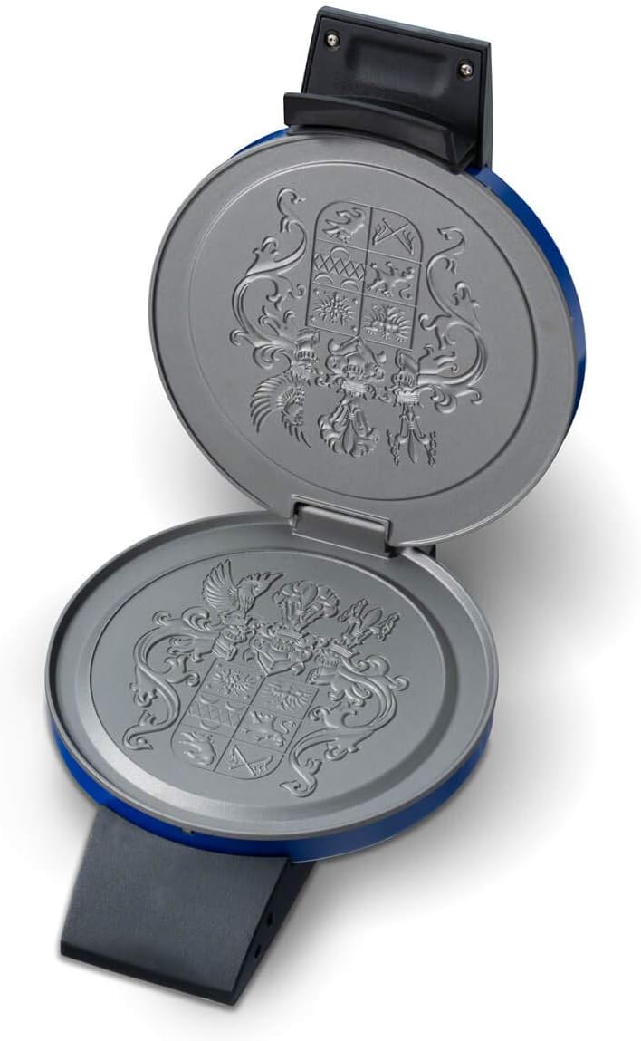 Машина Cloer 2632 Crescent с герб на Източна Фризия за тънки, хрупкави кроасани, 750 W, диаметър на повърхността за печене 14,5 см, безстепенно избираема степен на покафеняване, син цвят.