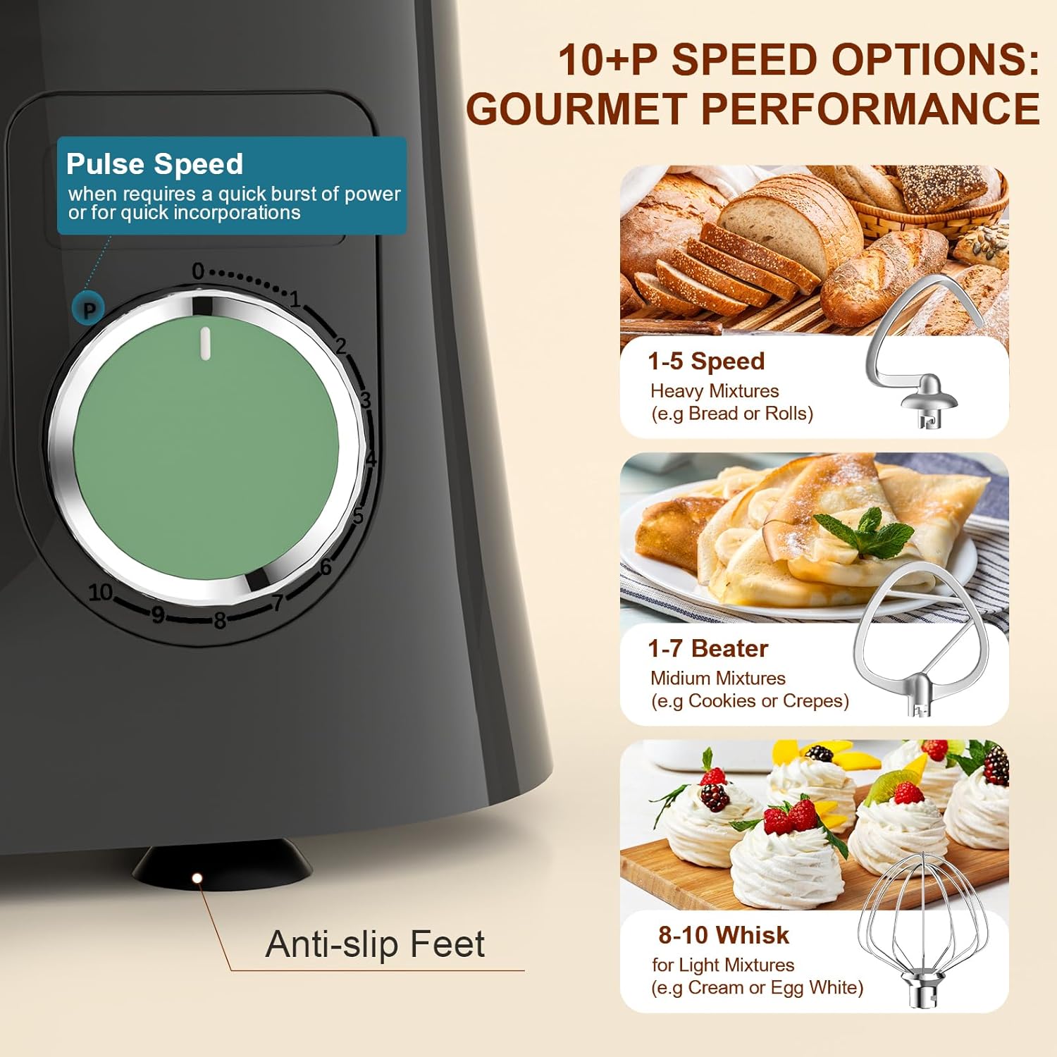 • Подобрени аксесоари и подходящи за съдомиялна машина: подобрена антиоксидантна тефлонова кука за тесто и плоска бъркалка, бъркалките от неръждаема стомана са по-здрави и издръжливи. Всички приставки за кухненски робот са подходящи за съдомиялна машина и могат да се почистват бързо и лесно. Допълнителен сепаратор за яйца и силиконова стъргалка осигуряват перфектен и професионален резултат от смесването всеки път.